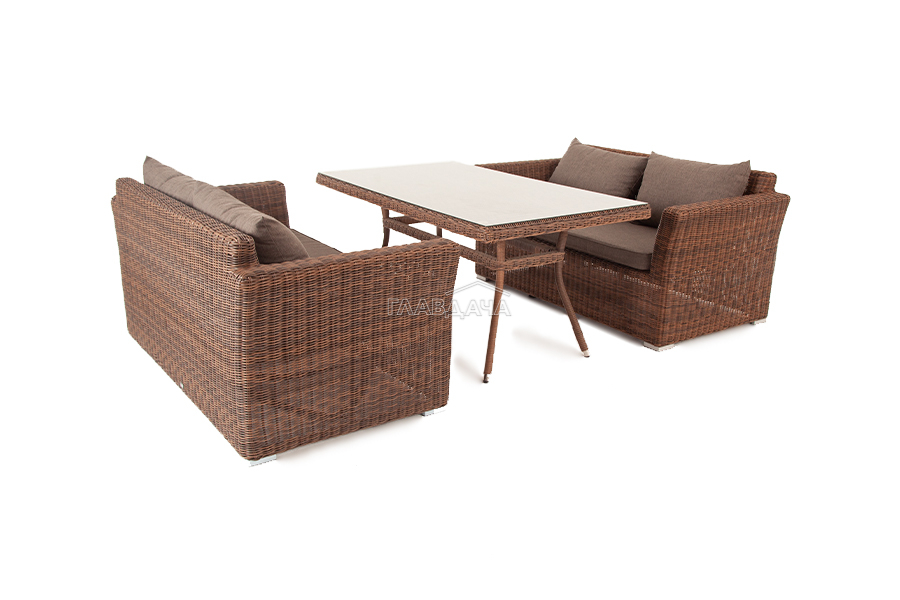 Обеденная группа комфорт-класса из синтетического ротанга «Мокко». В комплекте: 2 двухместных дивана «Капучино» - 1700×865×815 мм и обеденный стол на четверых «Латте» - 1600×900×750 мм.