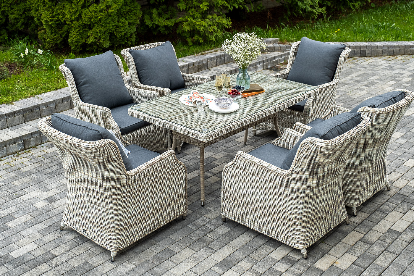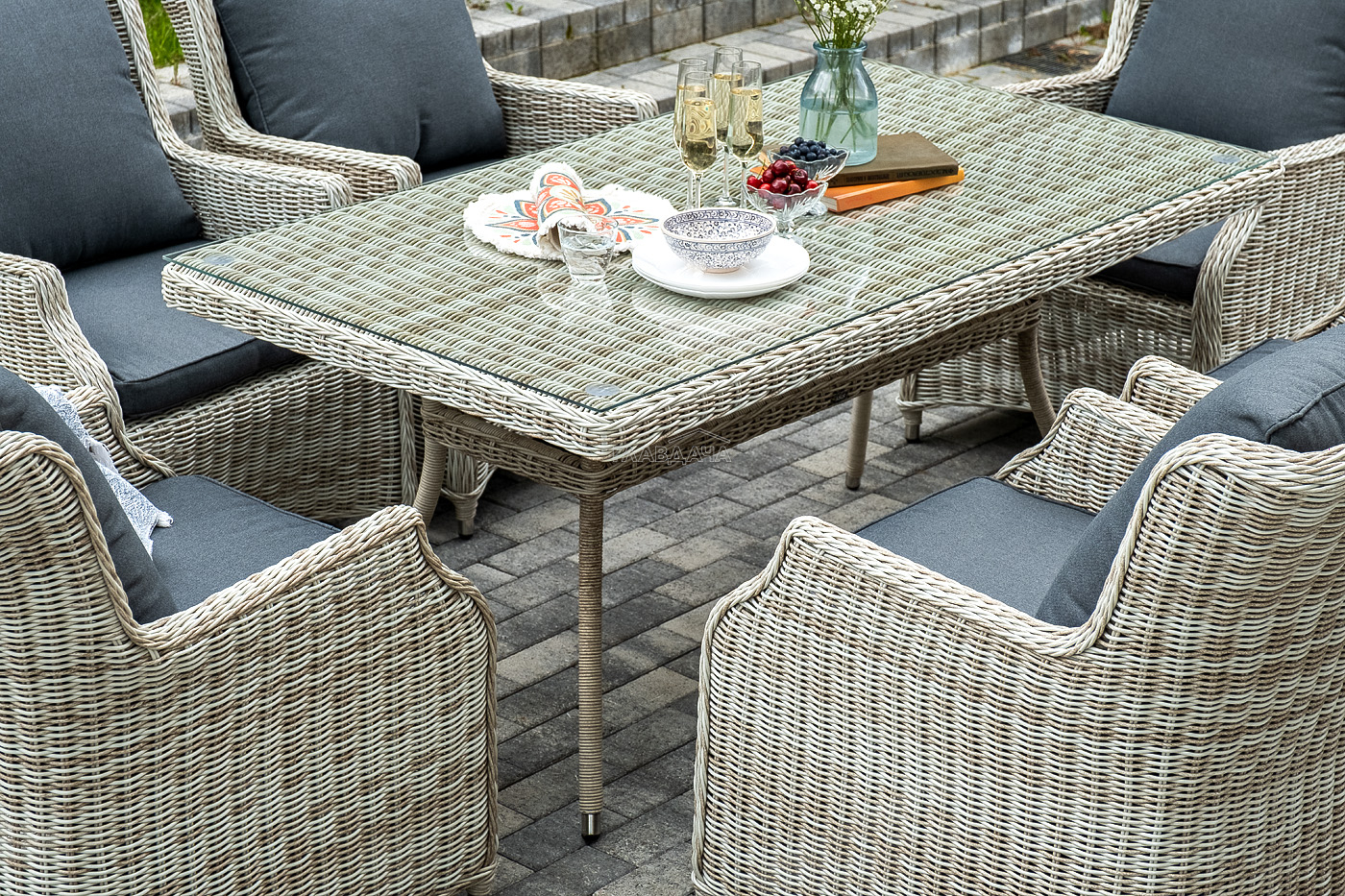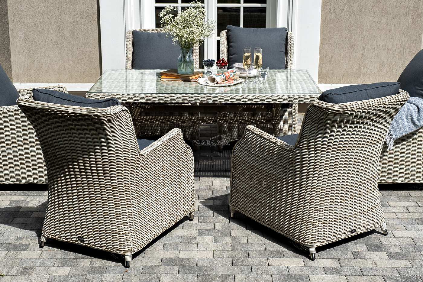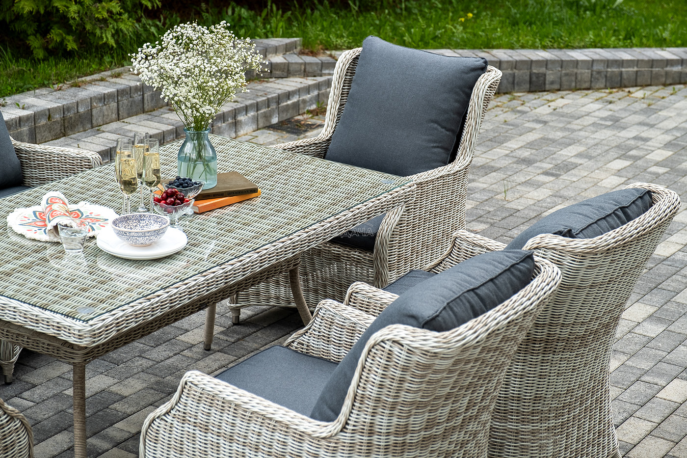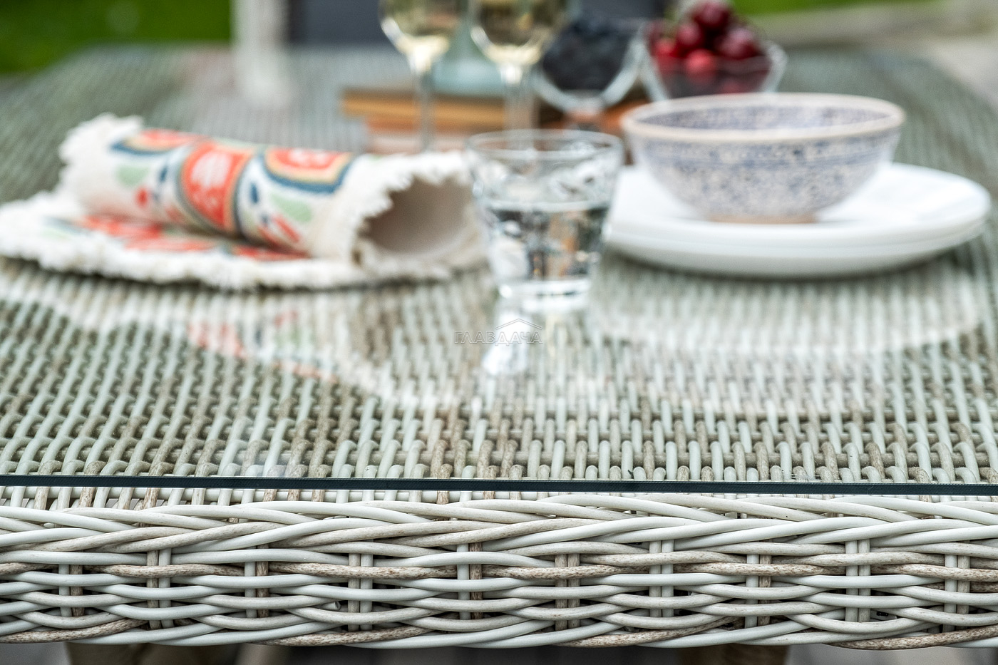 Столешница укомплектована ударопрочным стеклом, толщиной 5 мм. Данное стекло крепится к столу при помощи четырех вакуумных силиконовых присосок и поставляется в собранном виде. Плетеные стулья для удобства использования оснащены подлокотниками и подушками серого цвета на спинках и сидениях. Ткань обработана влагоотталкивающей пропиткой.