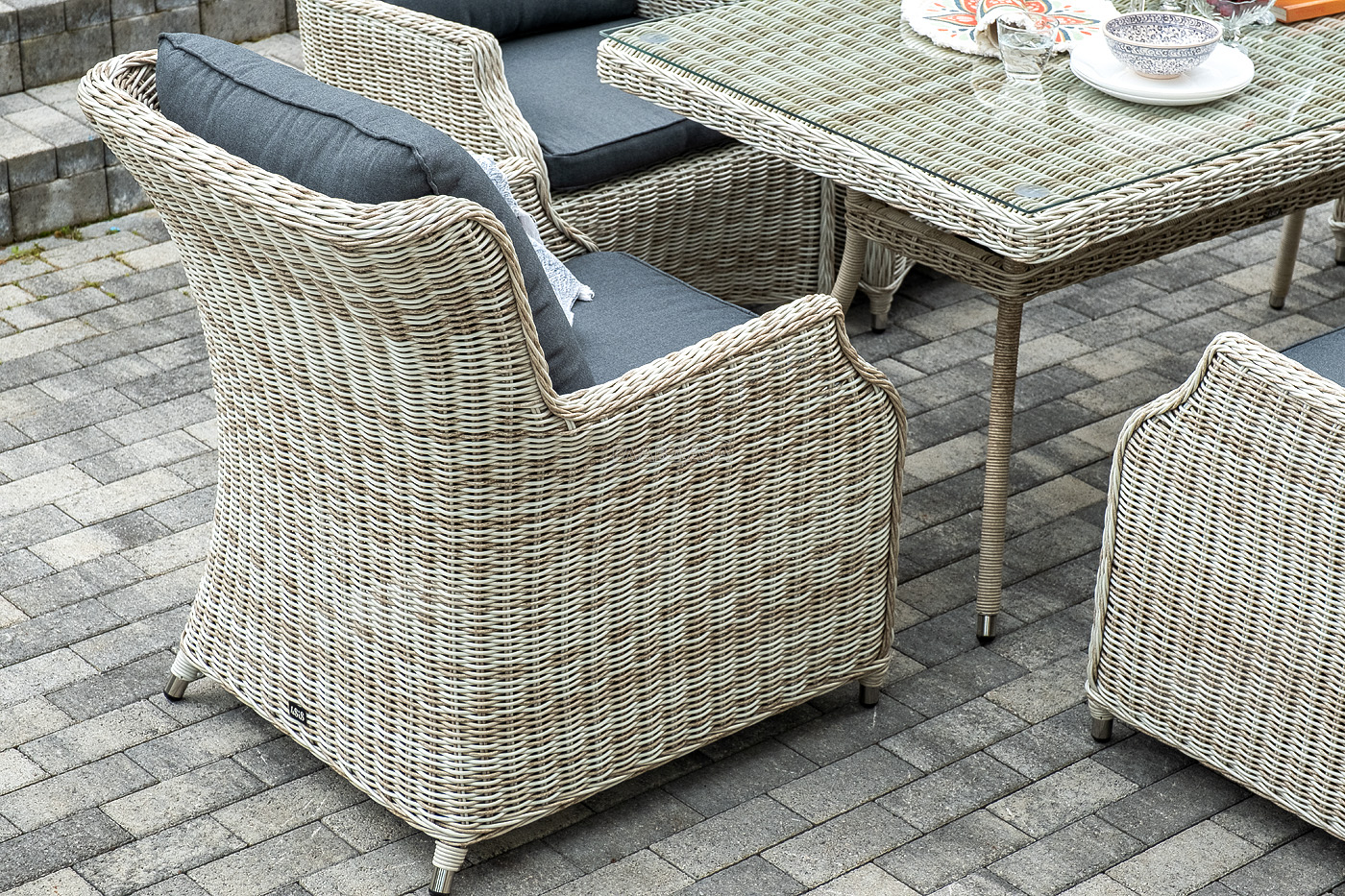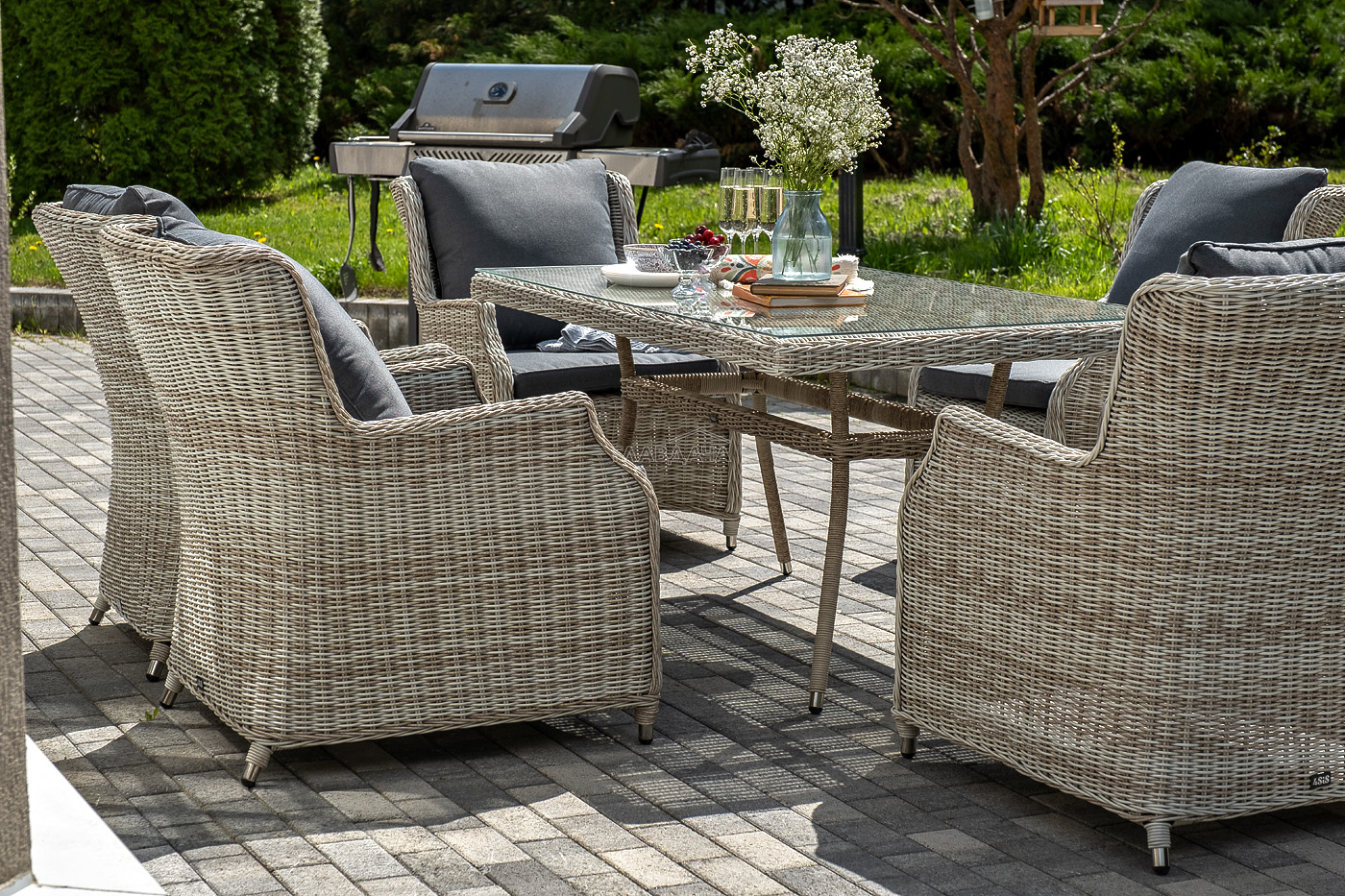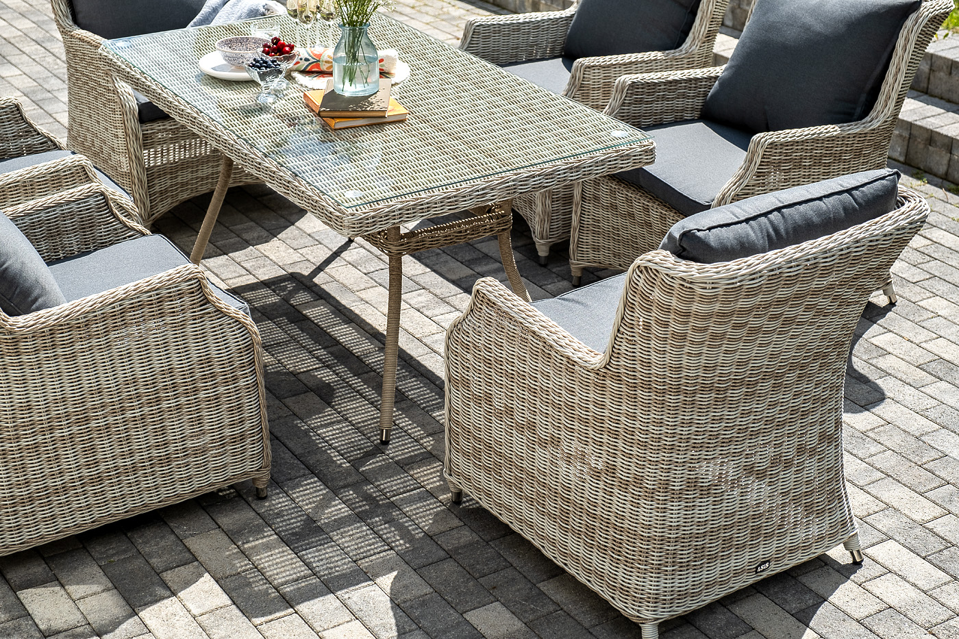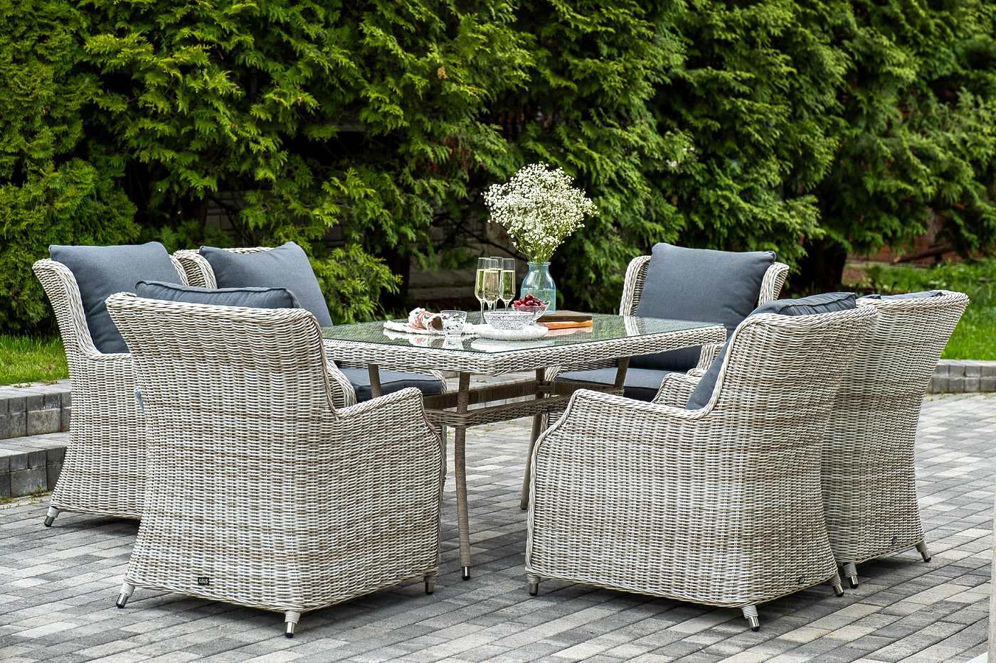 Столешница укомплектована ударопрочным стеклом, толщиной 5 мм. Данное стекло крепится к столу при помощи четырех вакуумных силиконовых присосок и поставляется в собранном виде. Плетеные стулья для удобства использования оснащены подлокотниками и подушками серого цвета на спинках и сидениях. Ткань обработана влагоотталкивающей пропиткой.