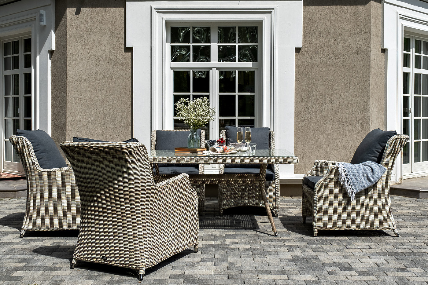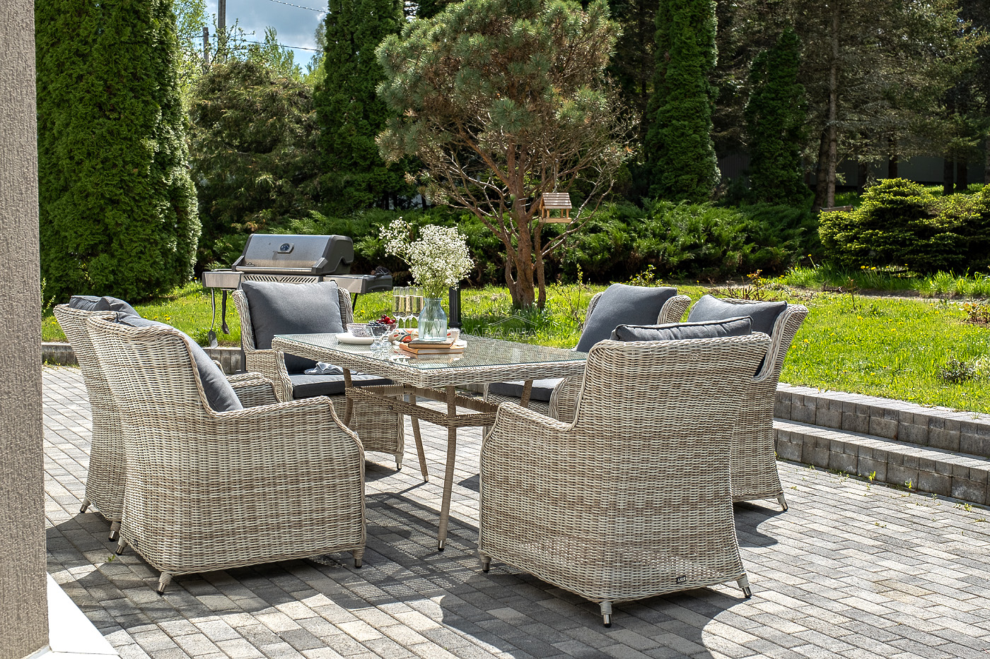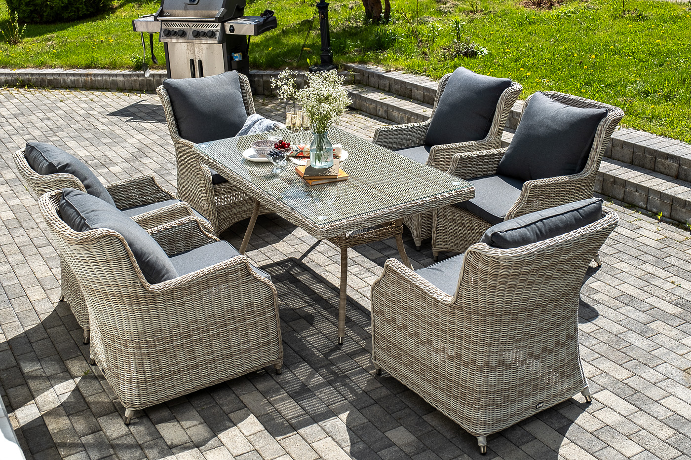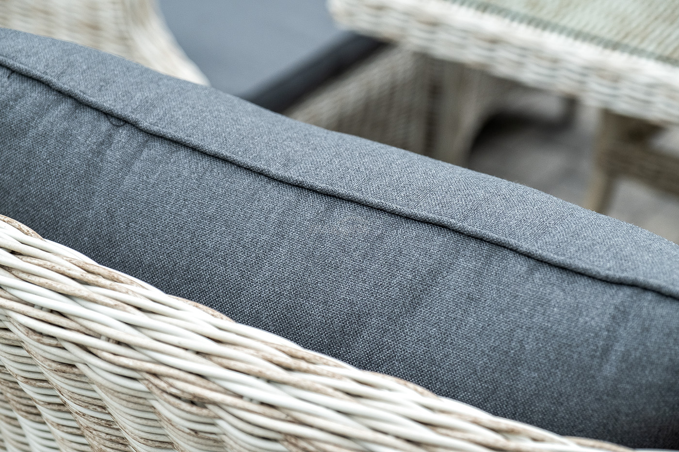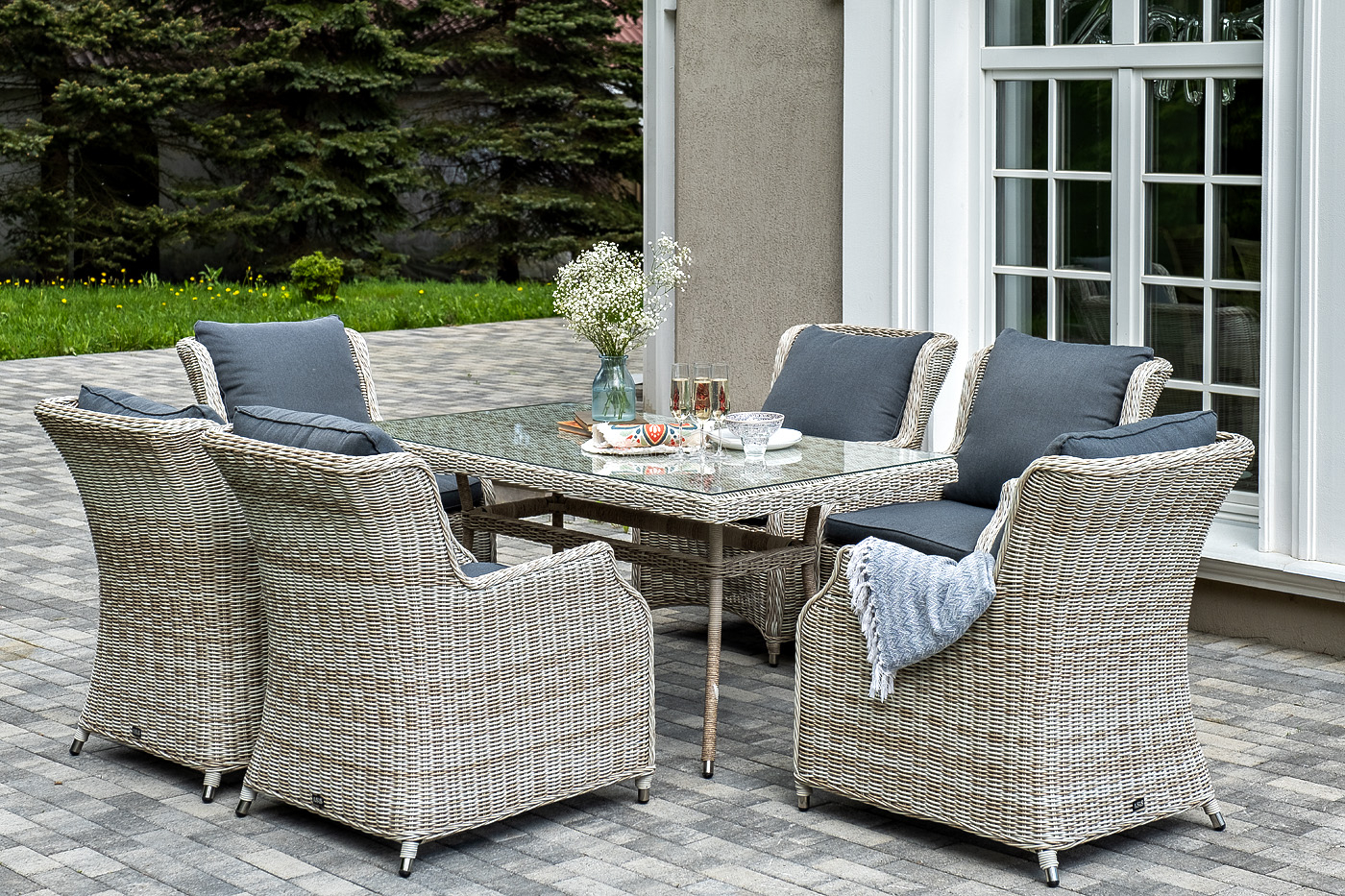 Столешница укомплектована ударопрочным стеклом, толщиной 5 мм. Данное стекло крепится к столу при помощи четырех вакуумных силиконовых присосок и поставляется в собранном виде. Плетеные стулья для удобства использования оснащены подлокотниками и подушками серого цвета на спинках и сидениях. Ткань обработана влагоотталкивающей пропиткой.