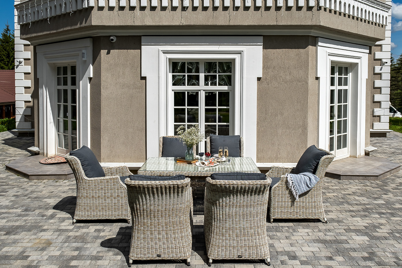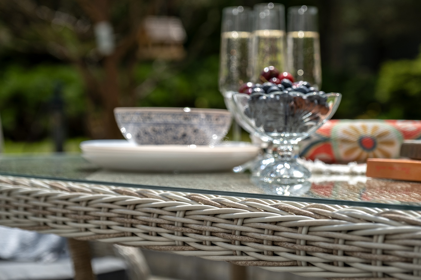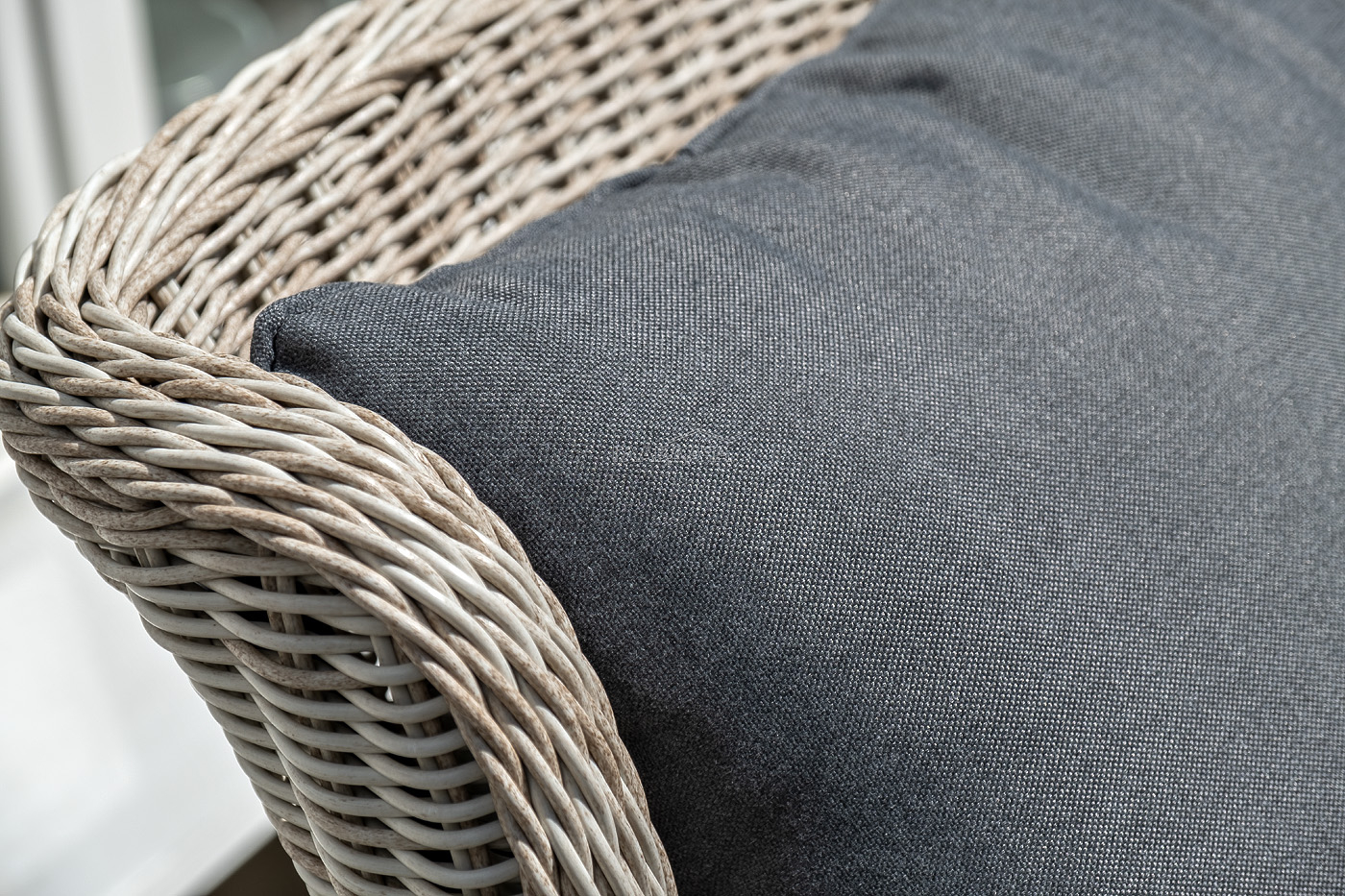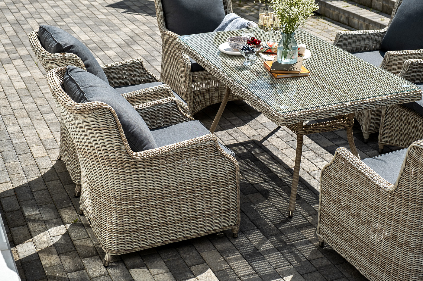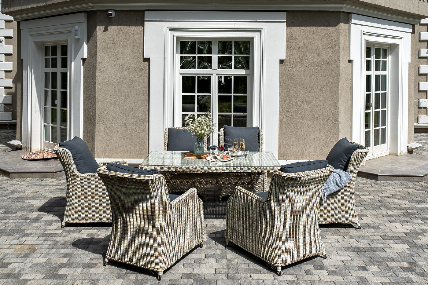 Столешница укомплектована ударопрочным стеклом, толщиной 5 мм. Данное стекло крепится к столу при помощи четырех вакуумных силиконовых присосок и поставляется в собранном виде. Плетеные стулья для удобства использования оснащены подлокотниками и подушками серого цвета на спинках и сидениях. Ткань обработана влагоотталкивающей пропиткой.