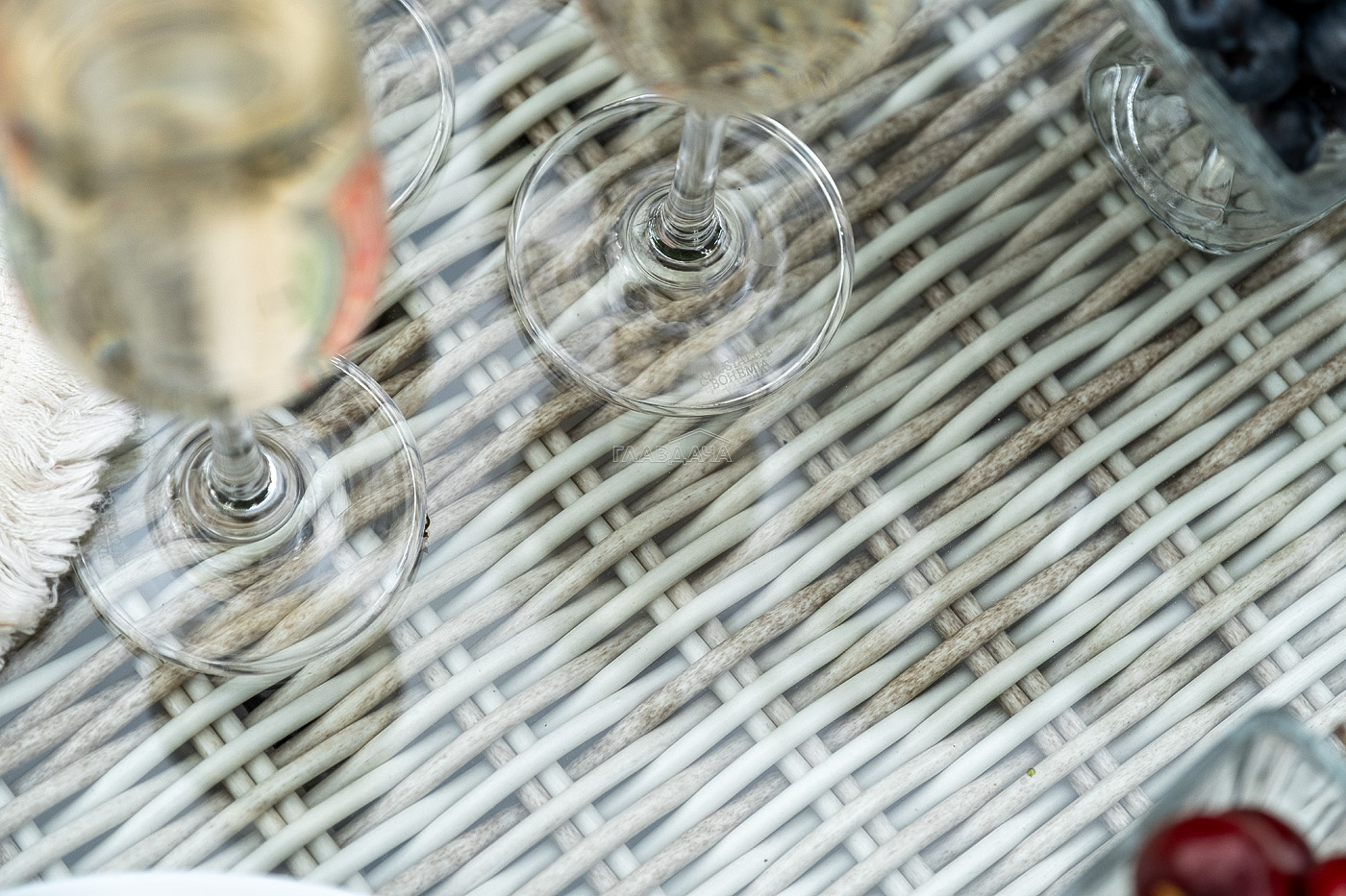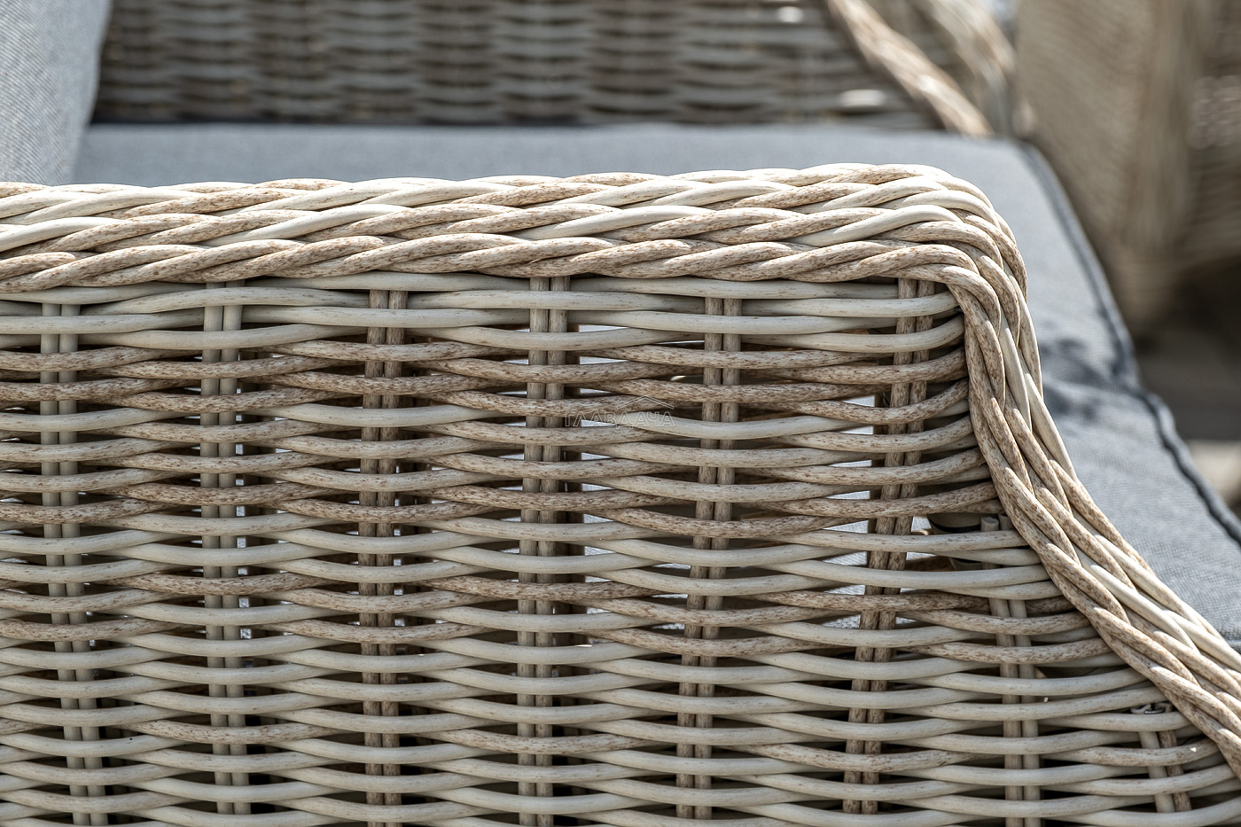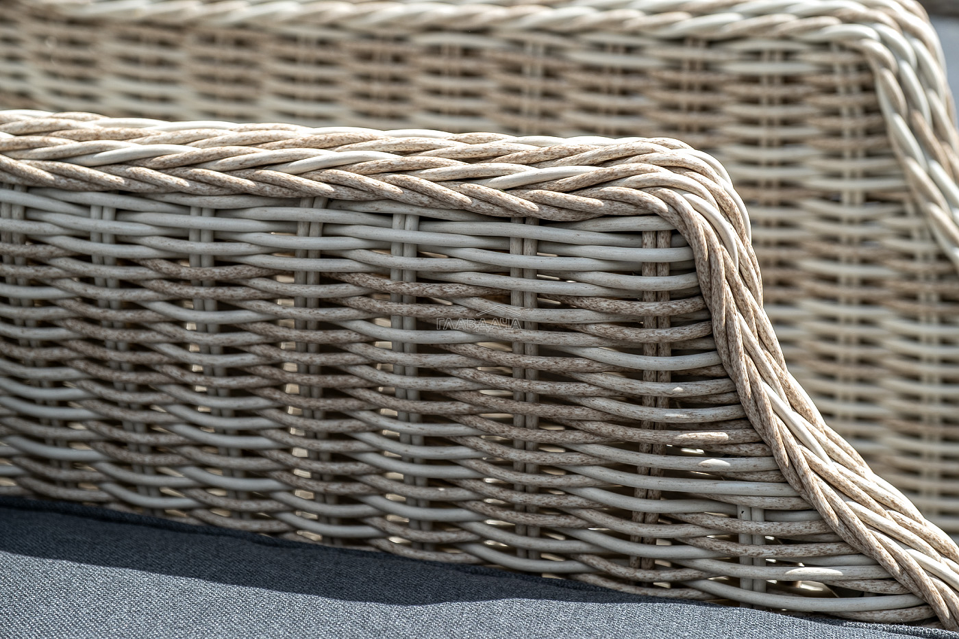 Каркас всех изделий выполнен из легкого и долговечного алюминия, оплетенного вручную круглым искусственным ротангом натурального бежевом цвета.