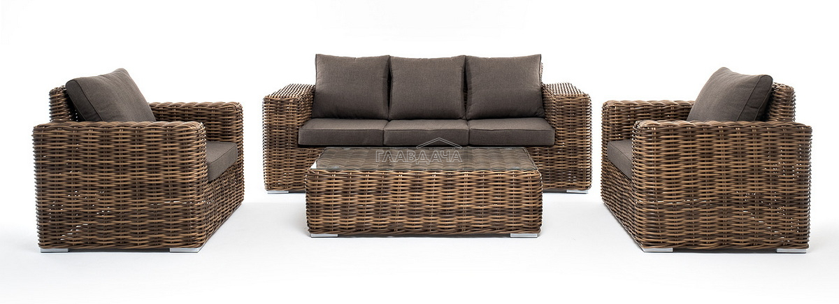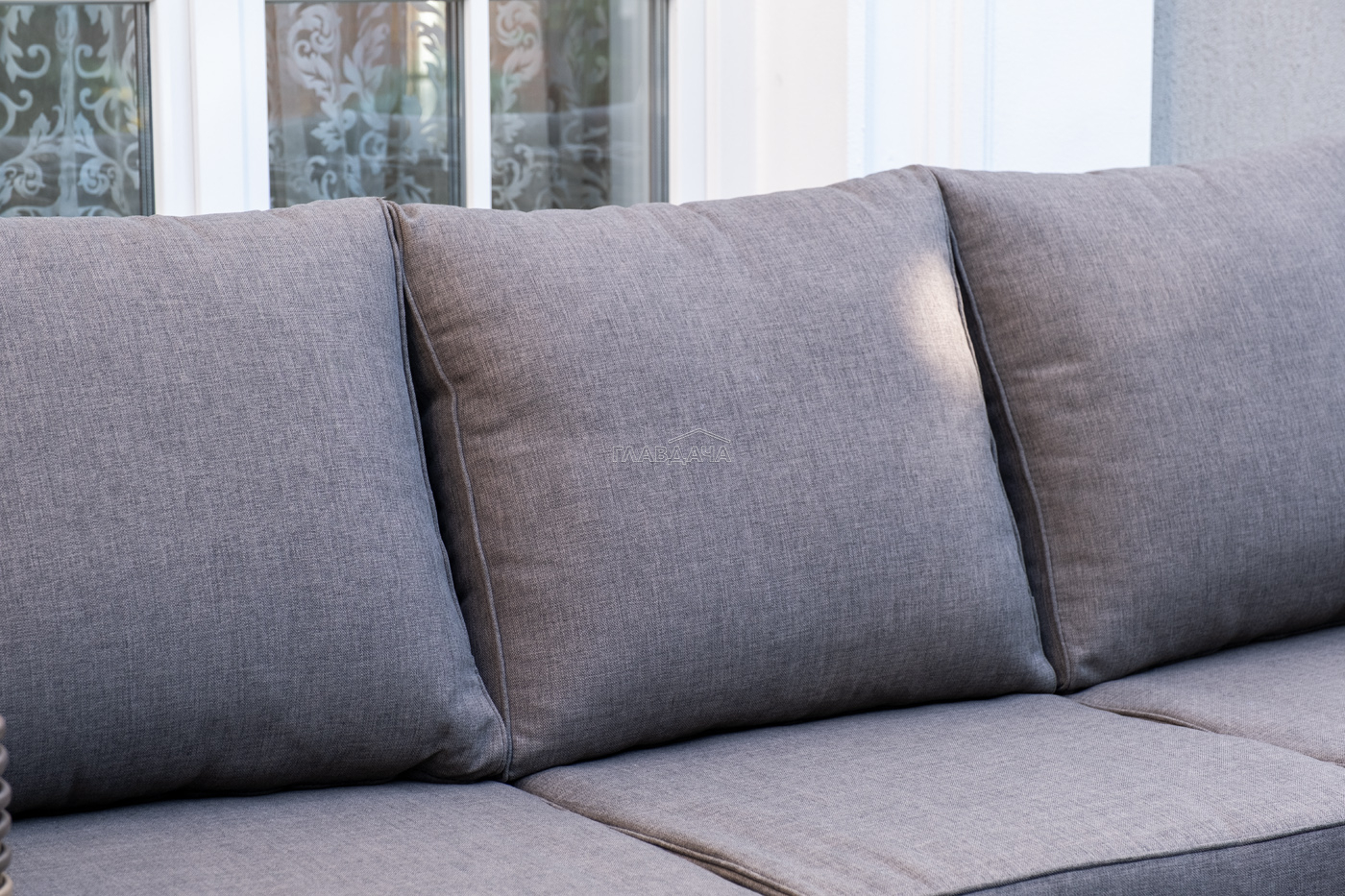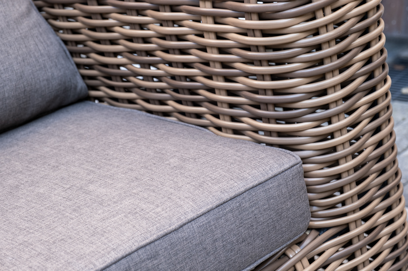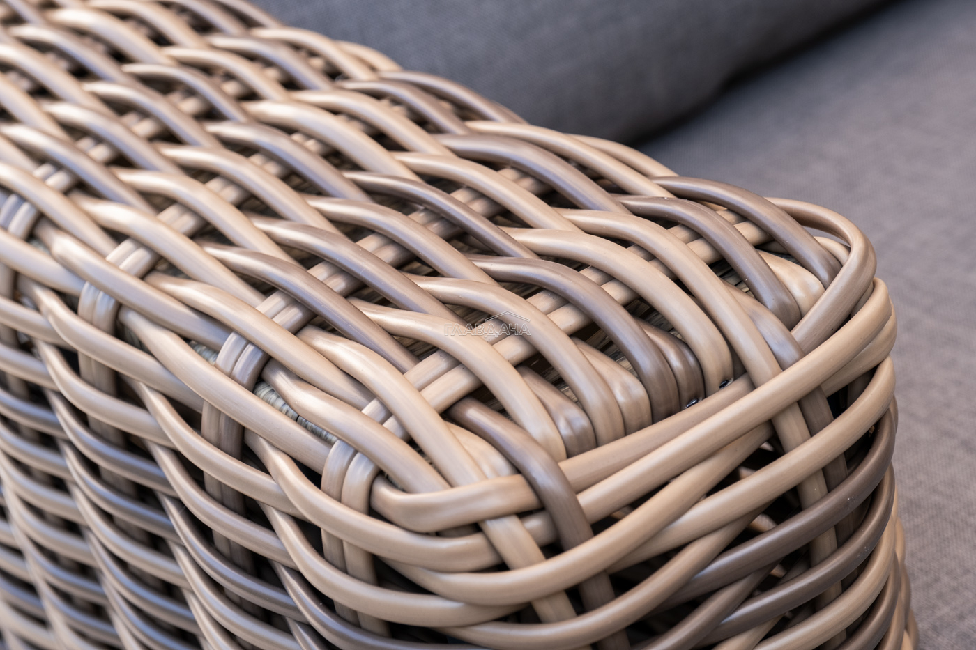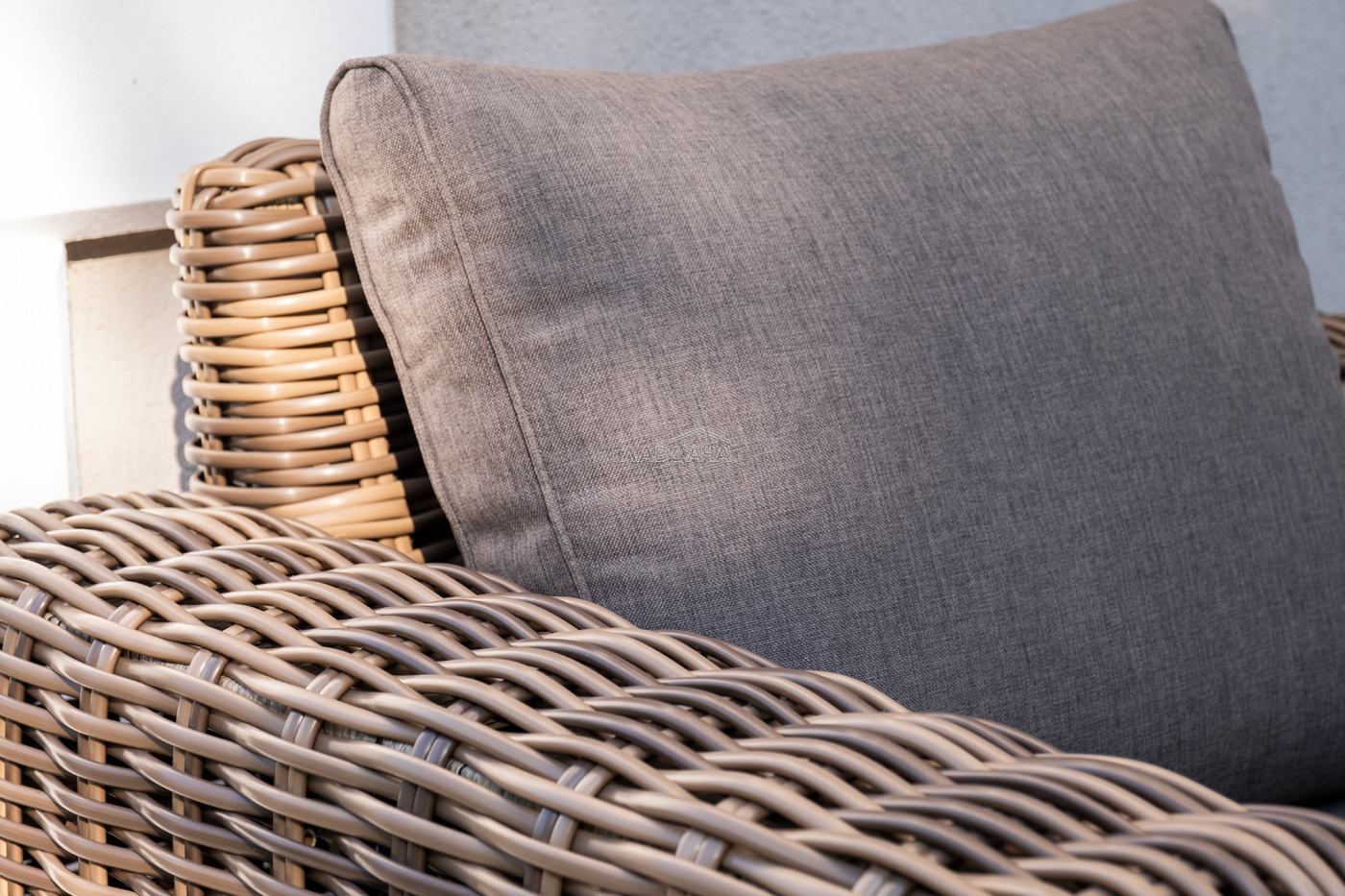 Плетеная мебель дополнена удобными подушками в серых чехлах. При их изготовлении используют полиэстер, плотность – 300гр/м2. Он обрабатывается влагоотталкивающей пропиткой для повышения защитных свойств материала.