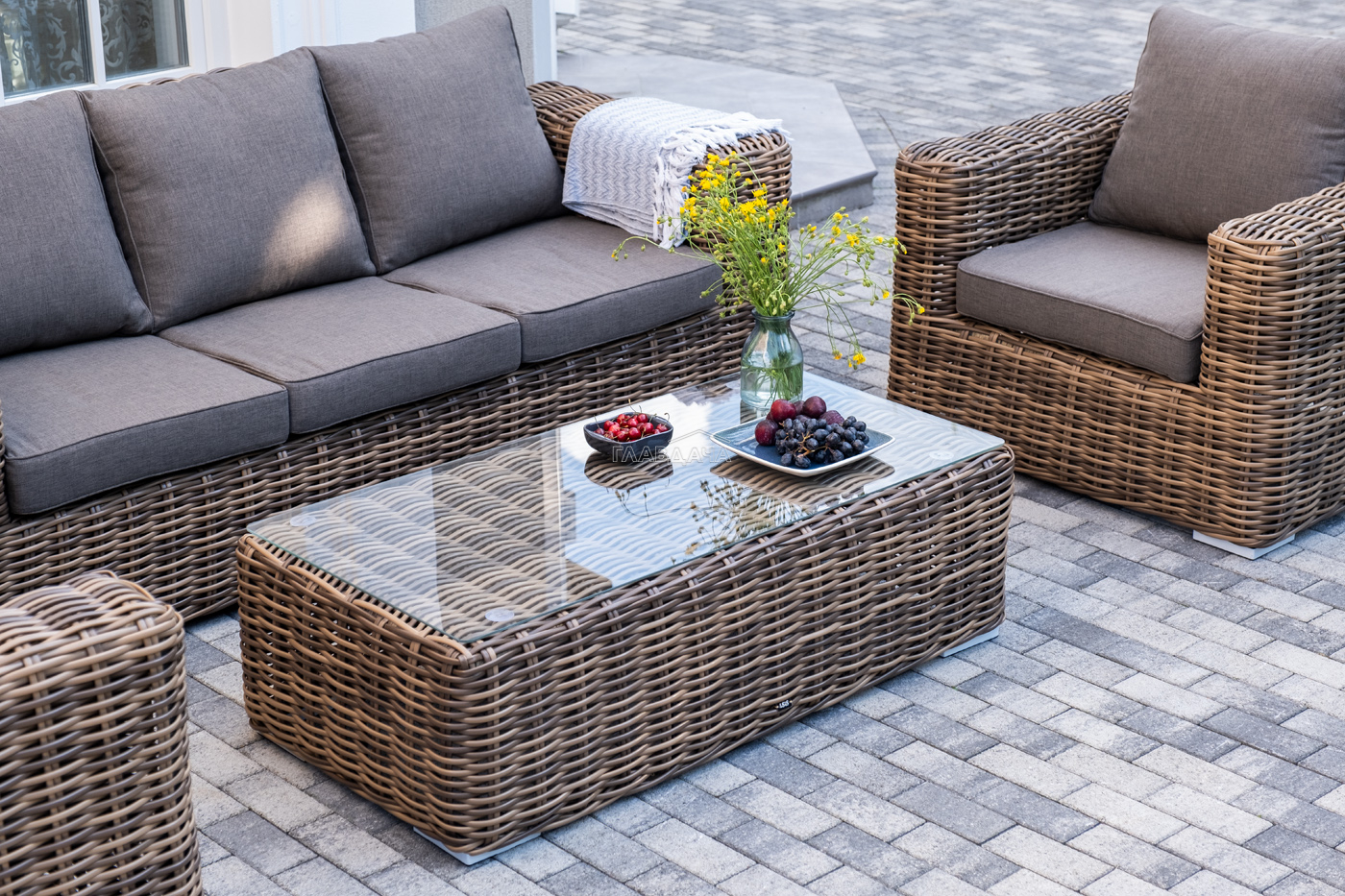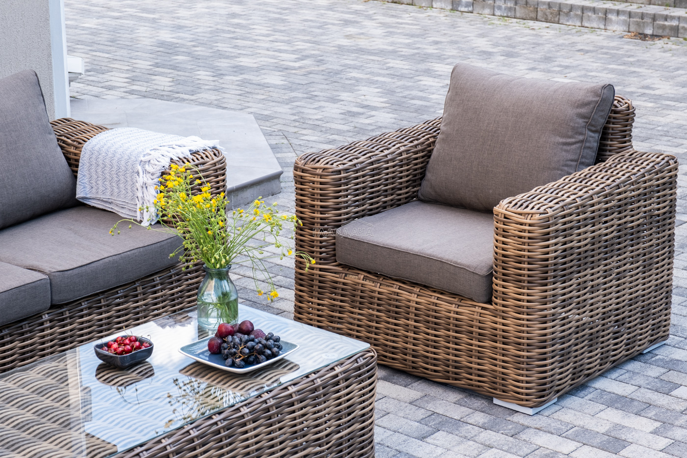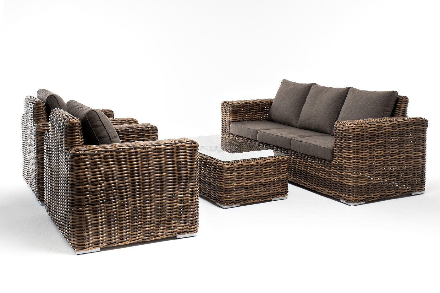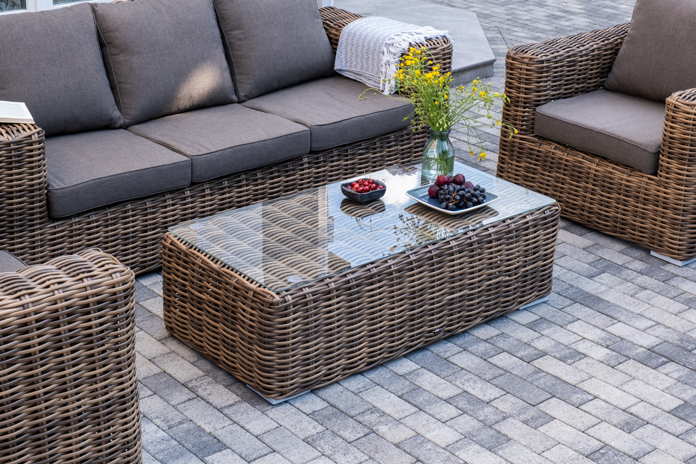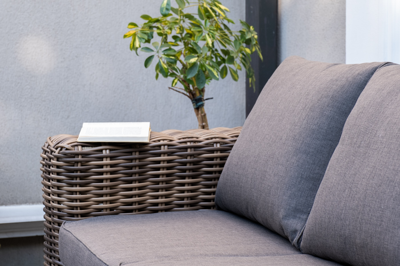 Плетеная мебель дополнена удобными подушками в серых чехлах. При их изготовлении используют полиэстер, плотность – 300гр/м2. Он обрабатывается влагоотталкивающей пропиткой для повышения защитных свойств материала.
