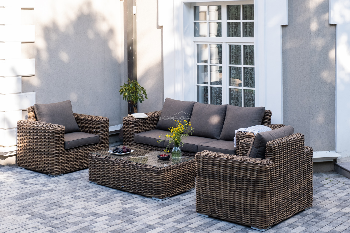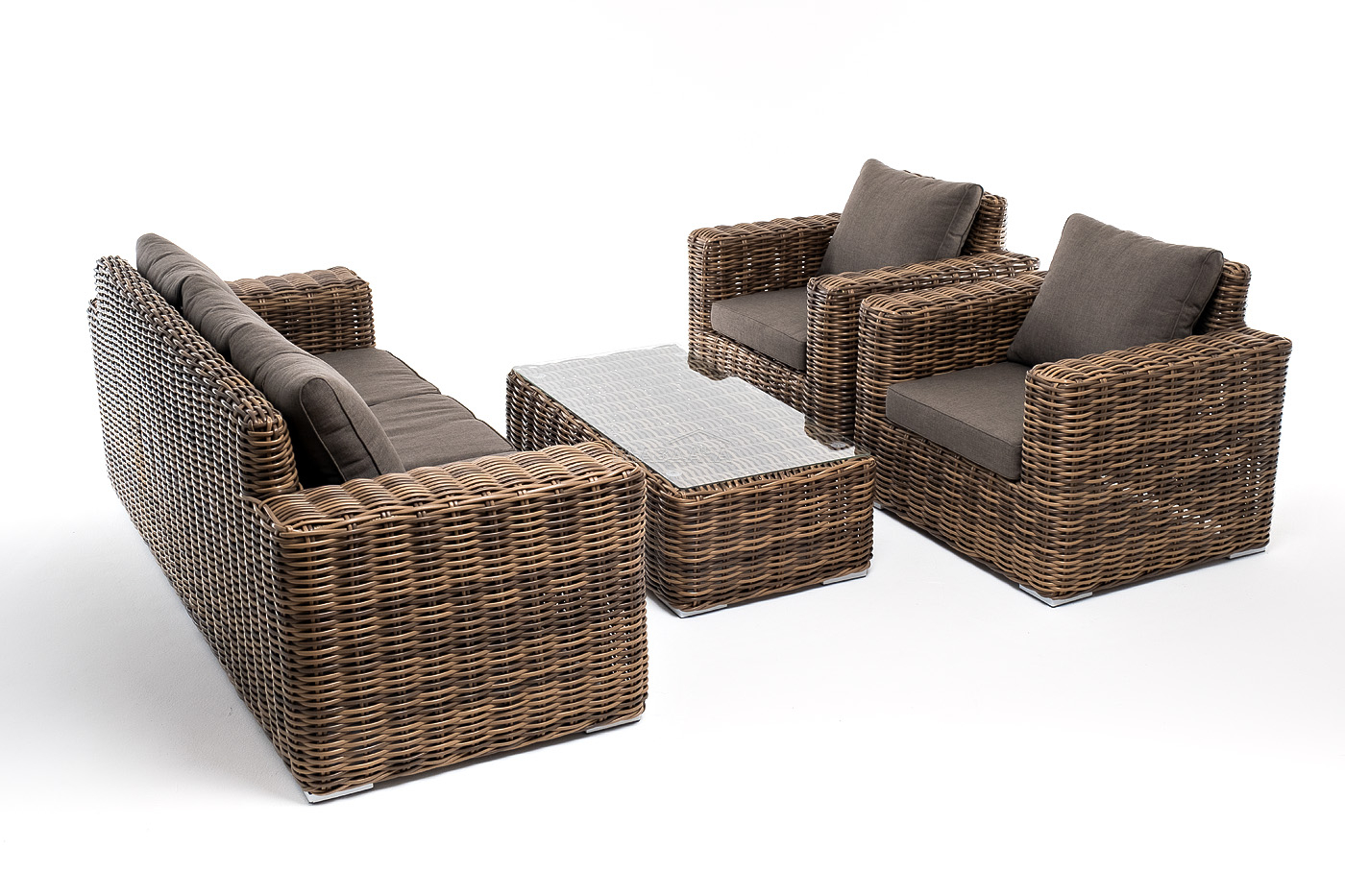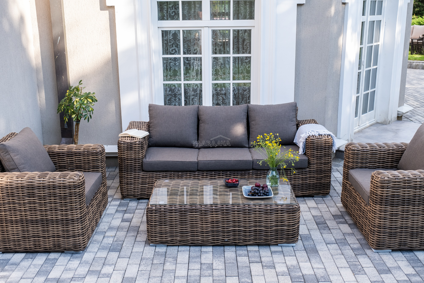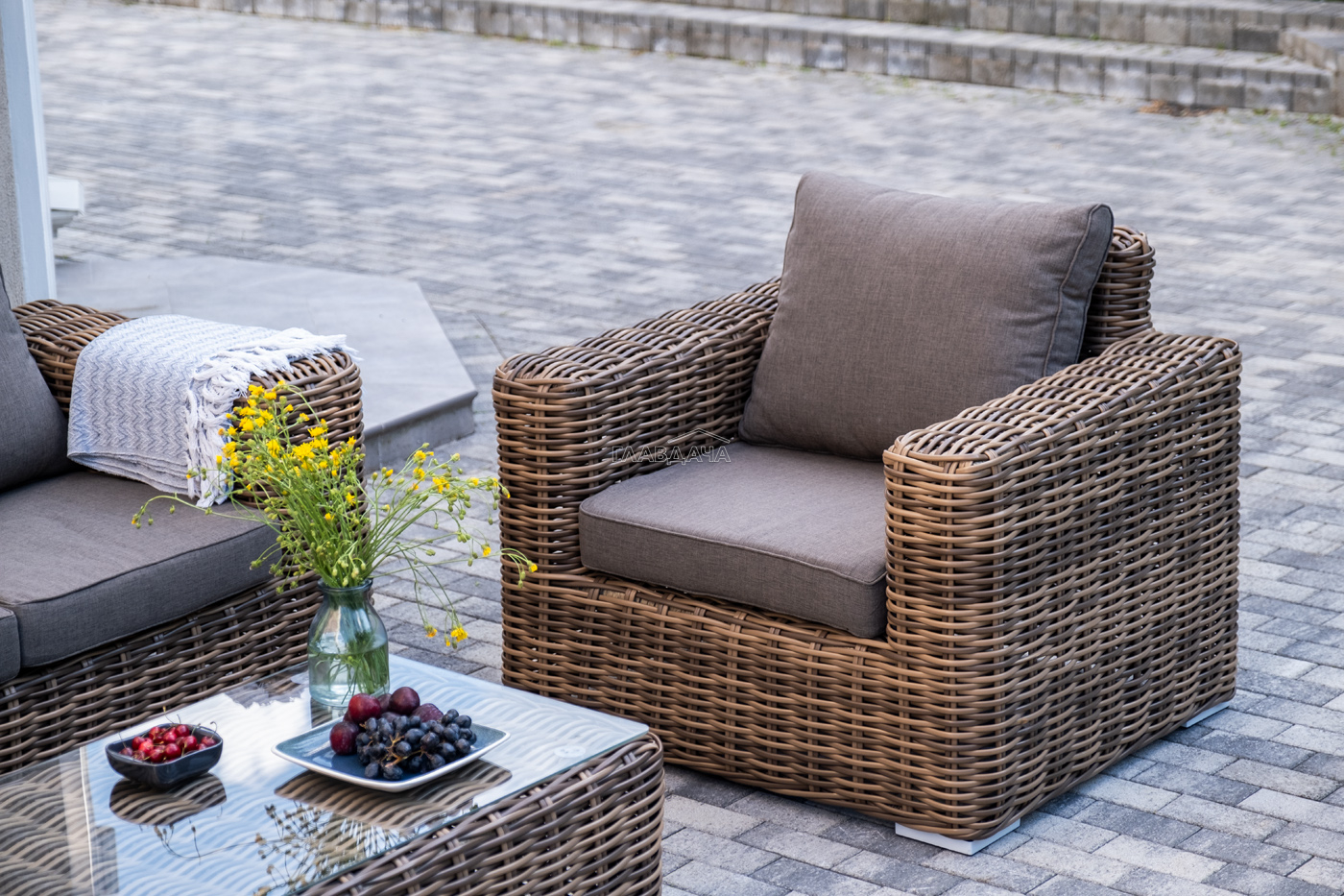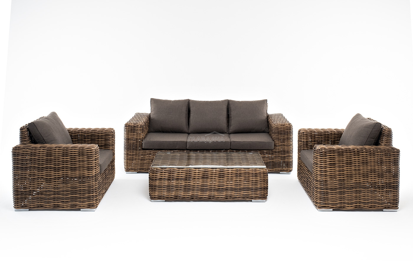 Плетеная мебель дополнена удобными подушками в серых чехлах. При их изготовлении используют полиэстер, плотность – 300гр/м2. Он обрабатывается влагоотталкивающей пропиткой для повышения защитных свойств материала.