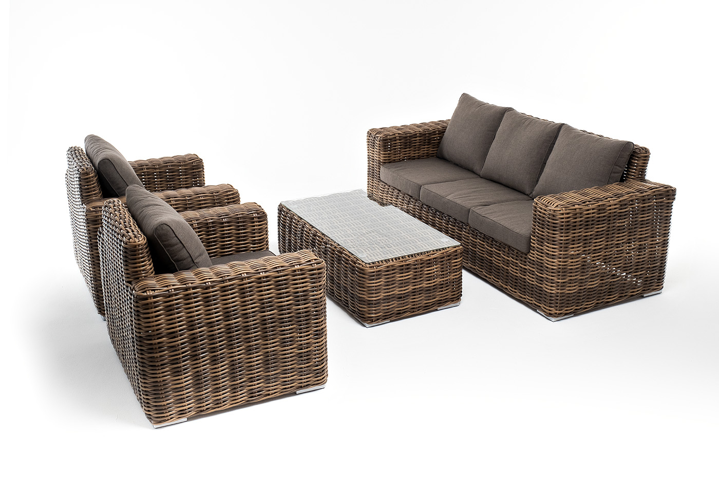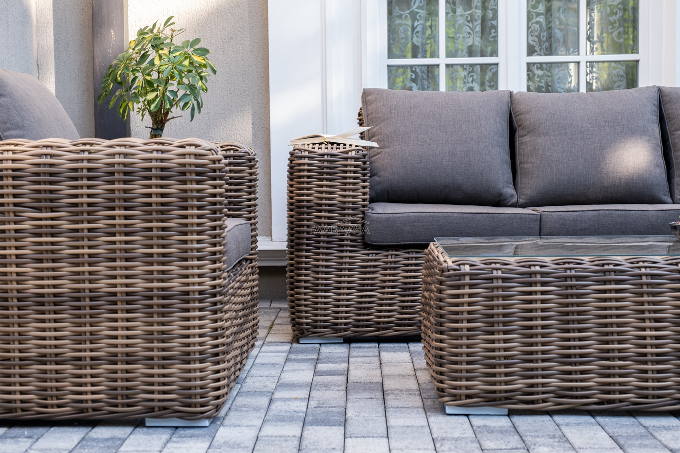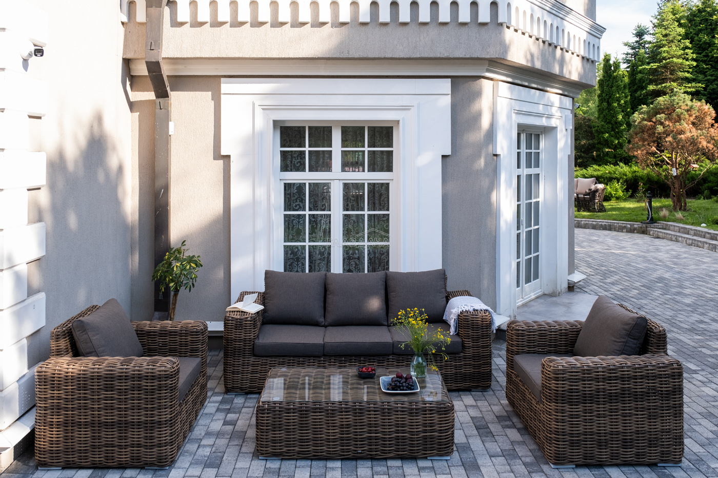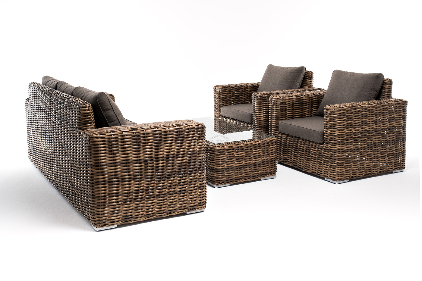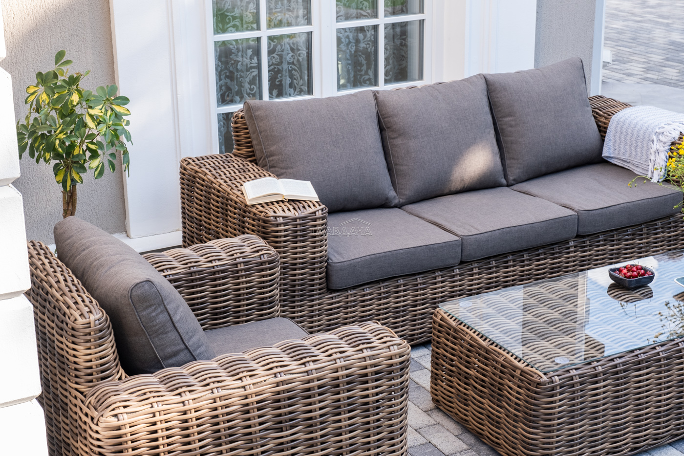 Плетеная мебель дополнена удобными подушками в серых чехлах. При их изготовлении используют полиэстер, плотность – 300гр/м2. Он обрабатывается влагоотталкивающей пропиткой для повышения защитных свойств материала.
