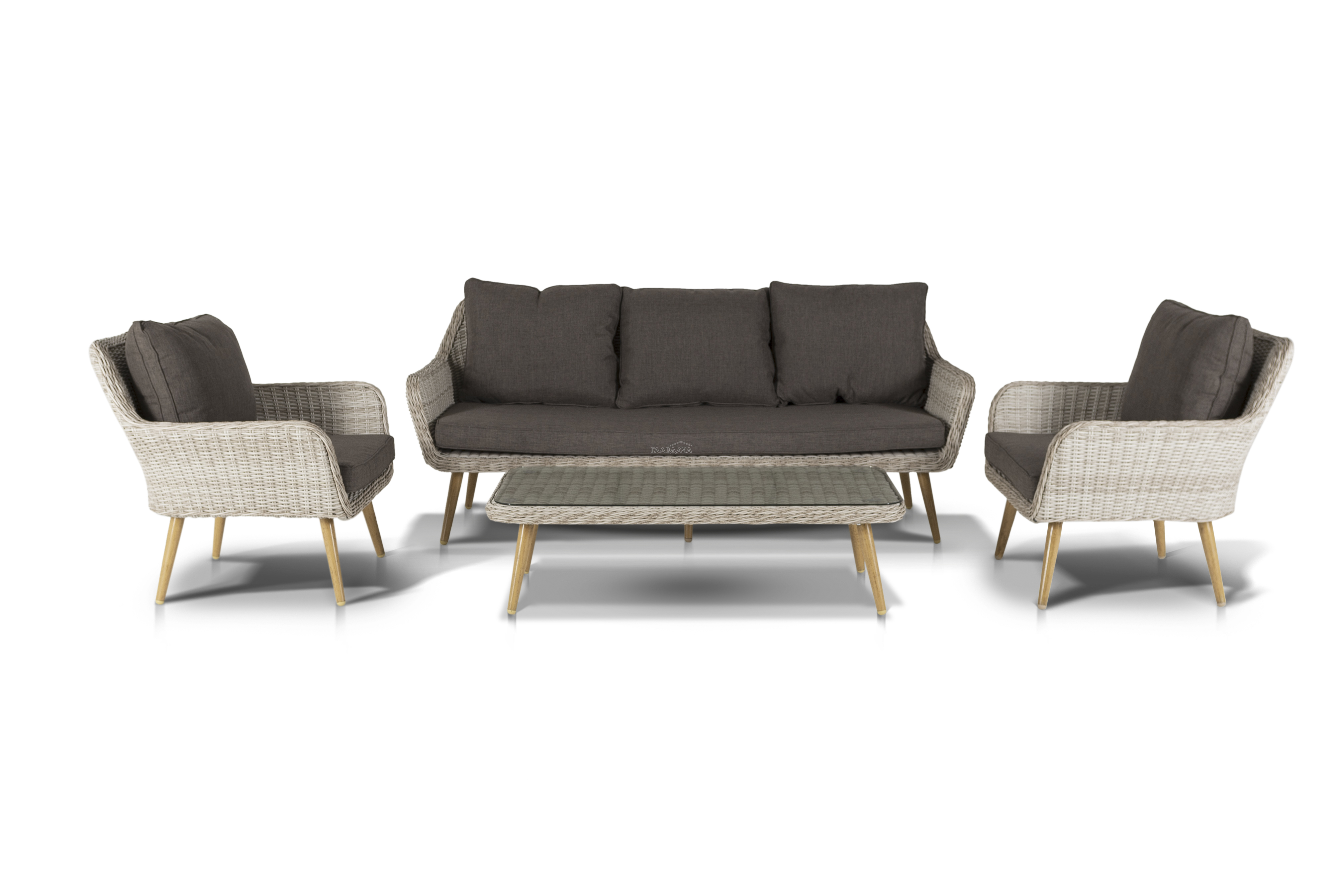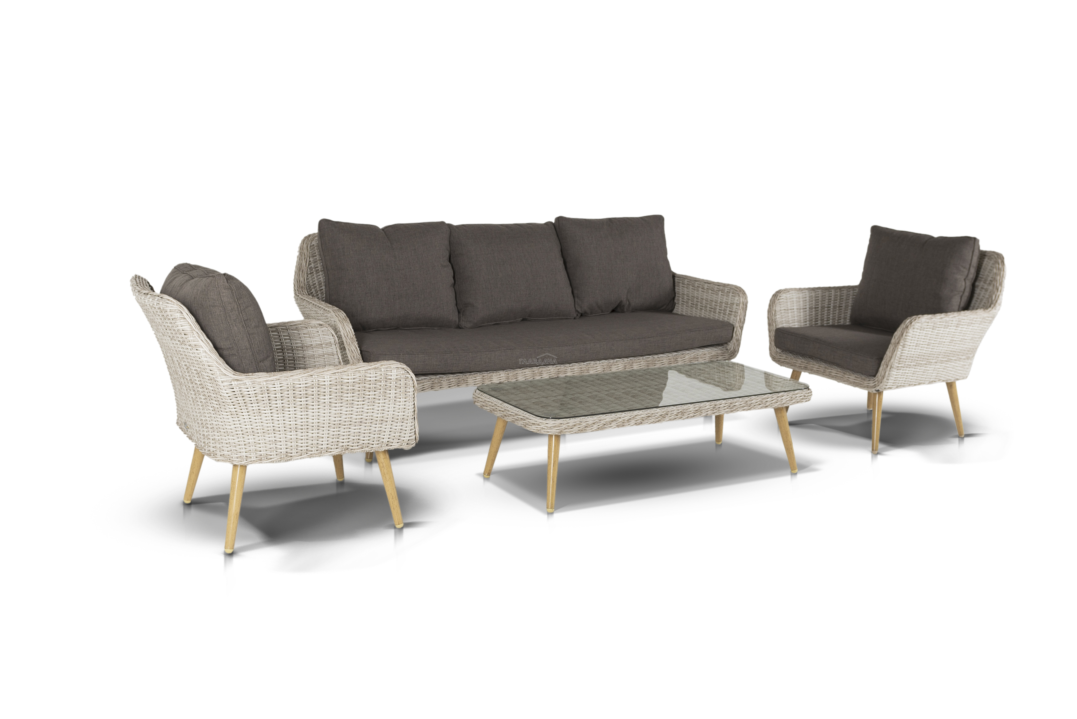 Каркас всей группы выполнен из прочного алюминия, который оплетен круглым искусственным ротангом. Цвет – бежевый.