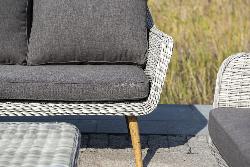 Диван и кресла оснащены подушками со съёмными чехлами серого цвета. При изготовлении чехлов используется высокопрочный полиэстер, плотность - 300гр/м2 и влагоотталкивающая пропитка.