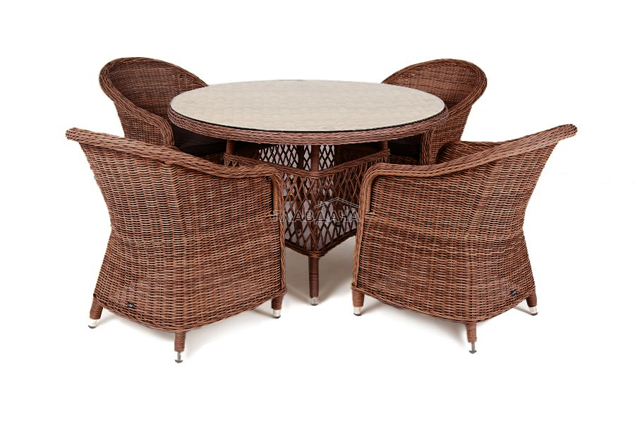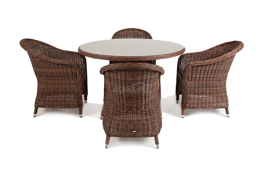 Обеденная группа «Равенна» на 4 персоны из круглого искусственного ротанга, цвет - коричневый. Стулья с подлокотниками в комплекте с подушками серого цвета. Круглый стол со стеклянной столешницей из каленного стекла толщиной 5 мм. Ручное плетение. Алюминиевый каркас. Подушки из водостойкой полиэфирной ткани.