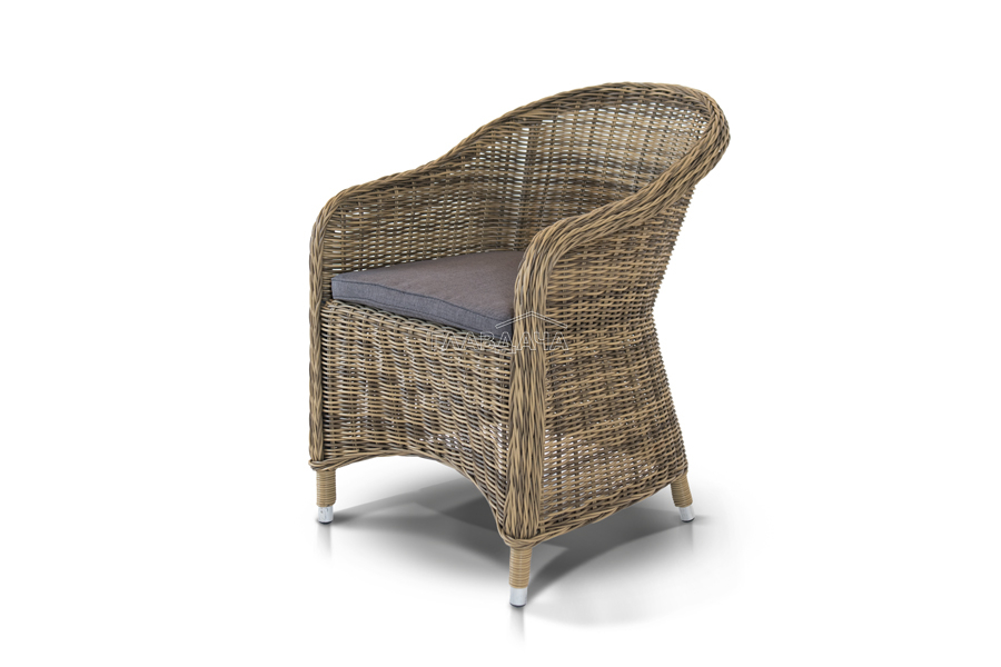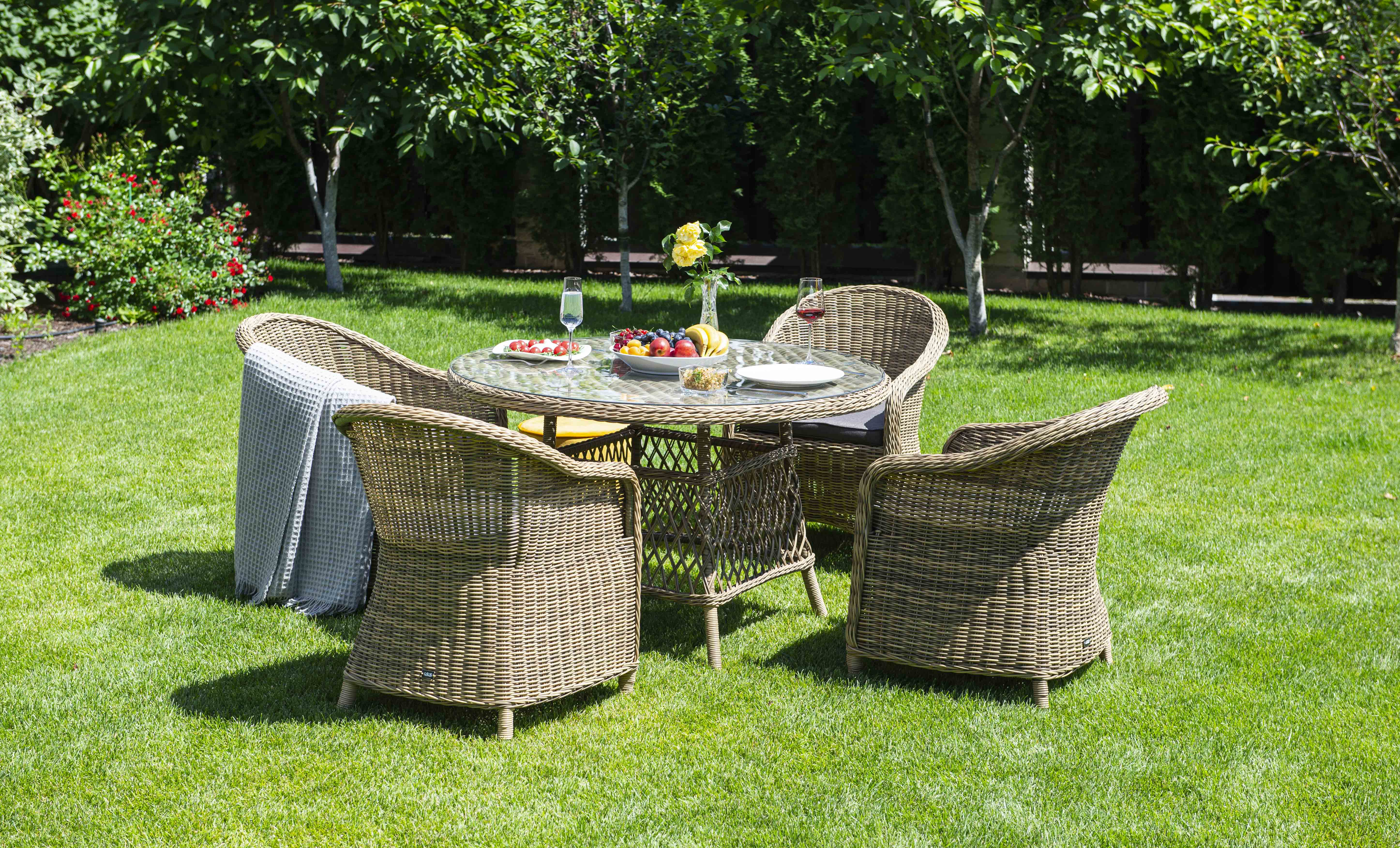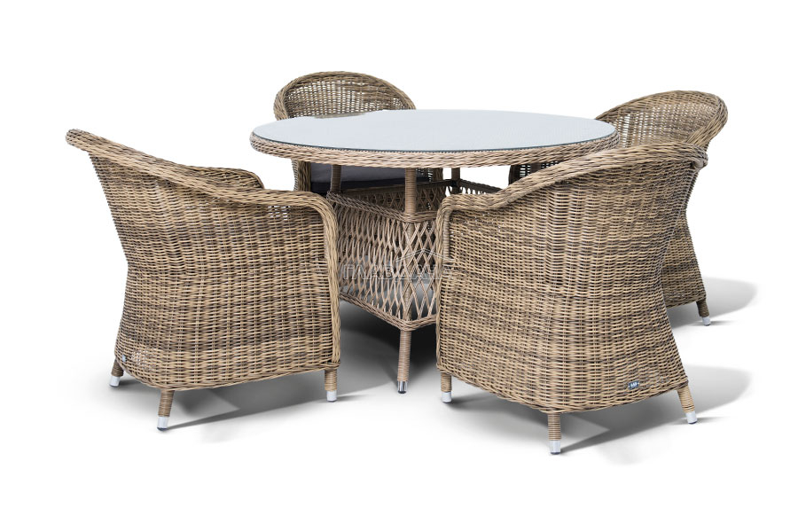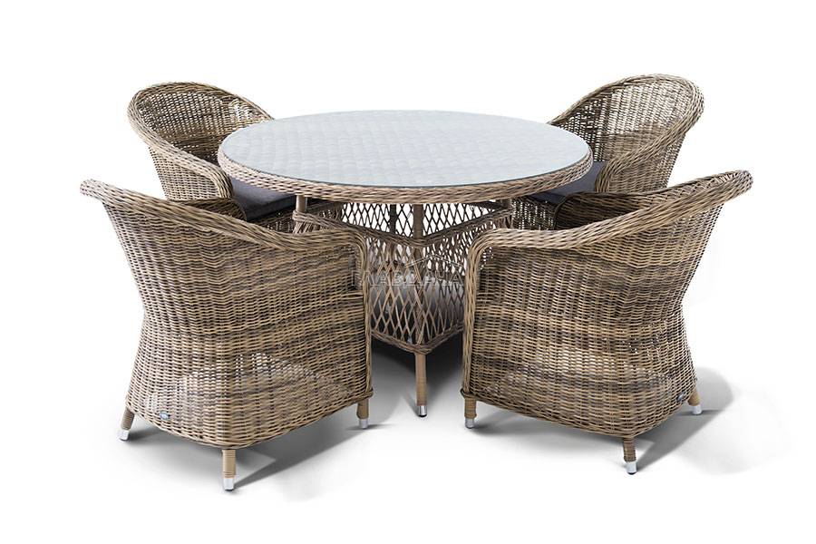 Обеденная группа «Равенна» на 4 персоны из круглого искусственного ротанга. Стулья с подлокотниками в комплекте с подушками серого цвета. Круглый стол со стеклянной столешницей из каленного стекла толщиной 5 мм. Ручное плетение. Алюминиевый каркас. Подушки из водостойкой полиэфирной ткани.