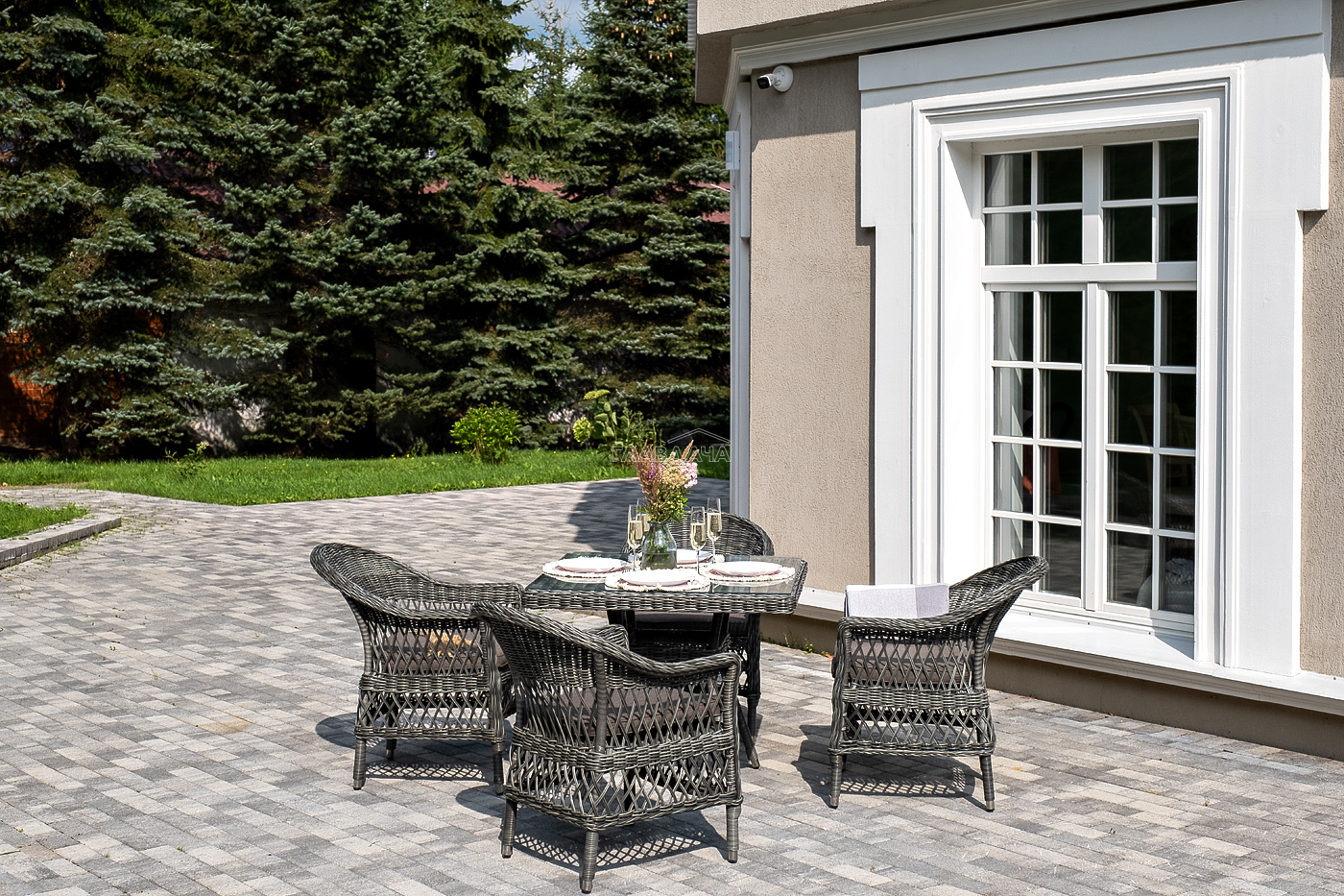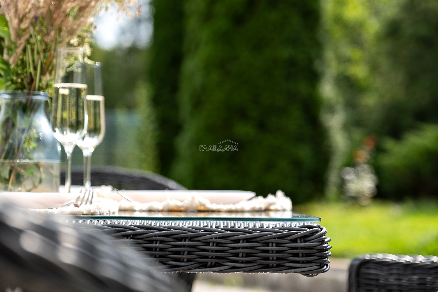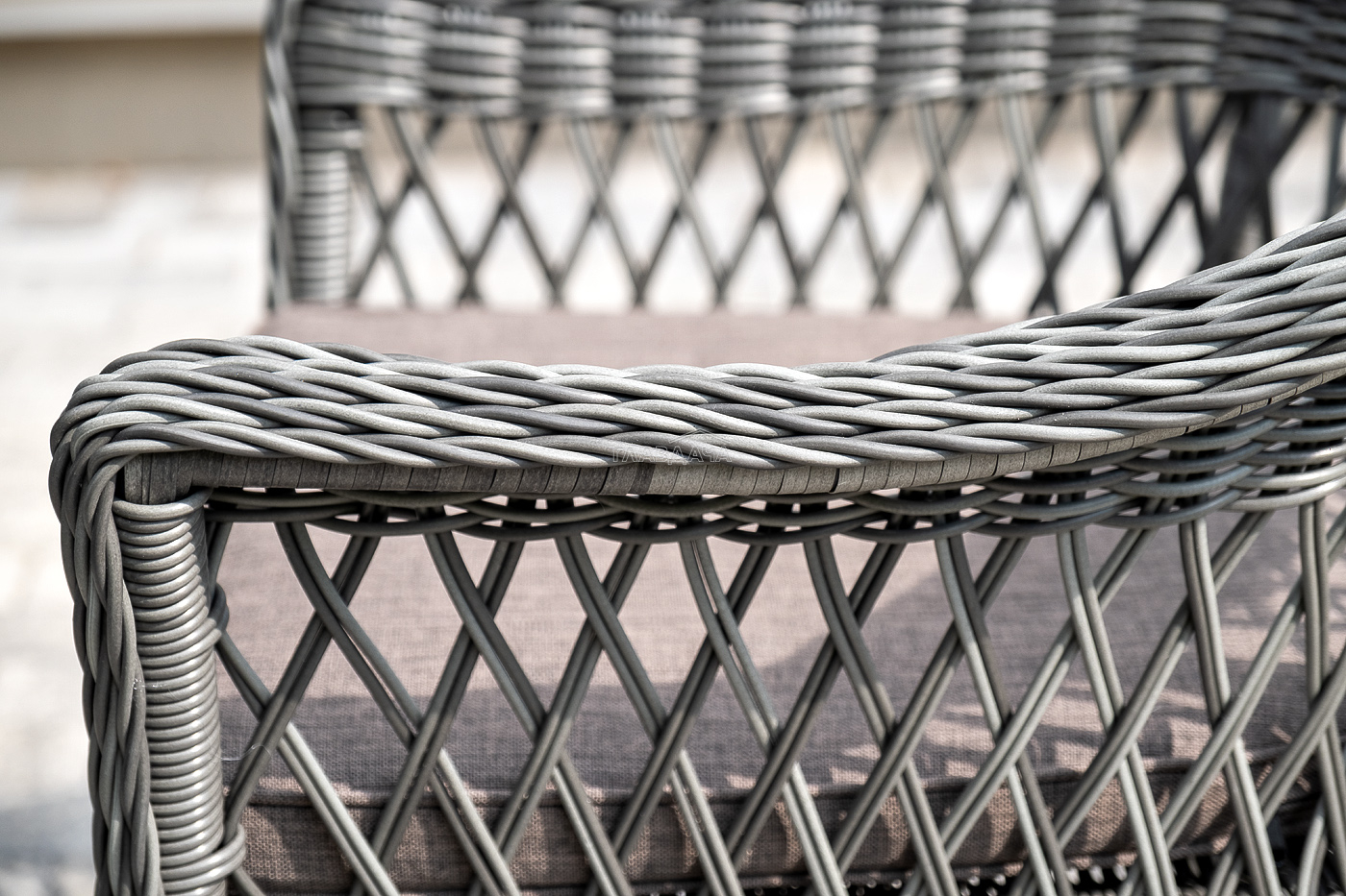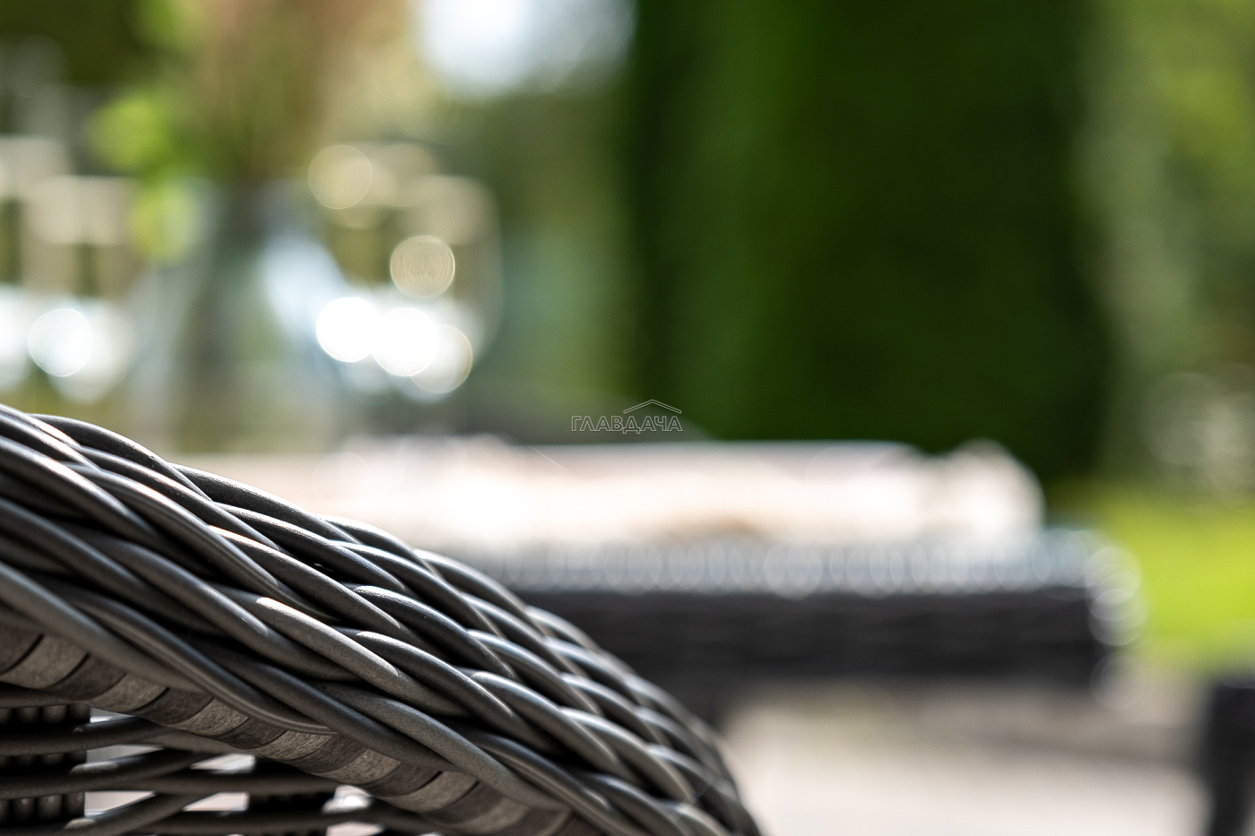 Мебель имеет надежный каркас из легкого алюминия. Изделия дополнительно оплетены ручным методом круглым искусственным ротангом натурального графитового цвета.