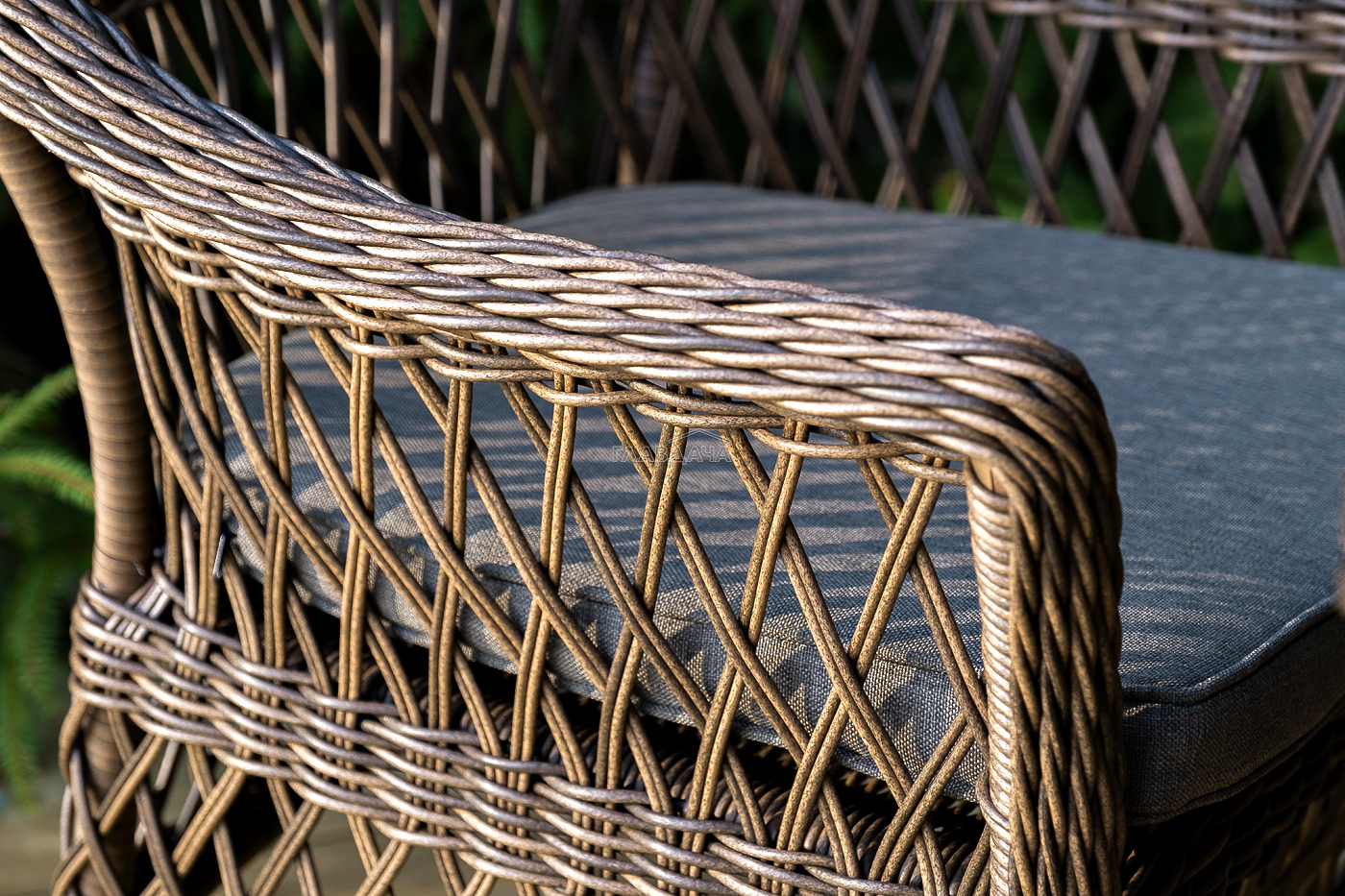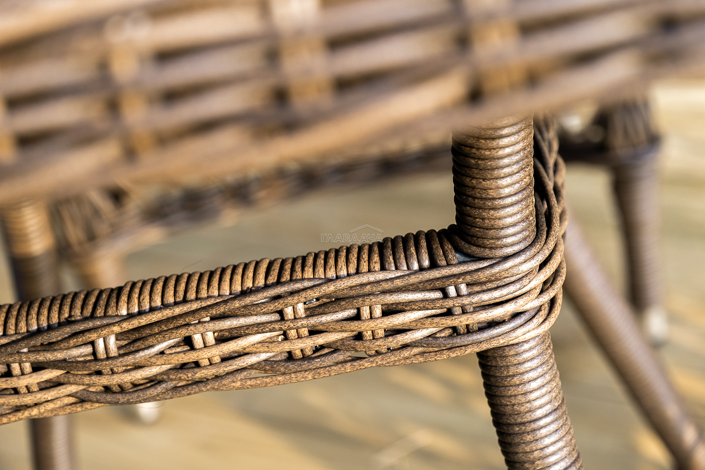 Мебель имеет надежный каркас из легкого алюминия. Изделия дополнительно оплетены ручным методом круглым искусственным ротангом натурального коричневого цвета.