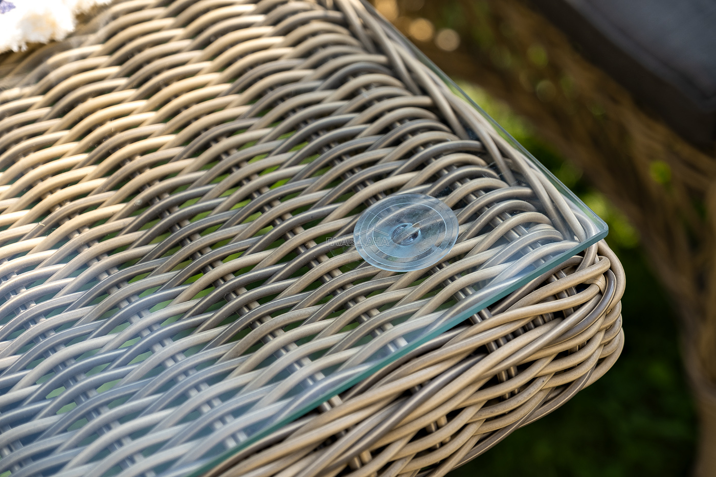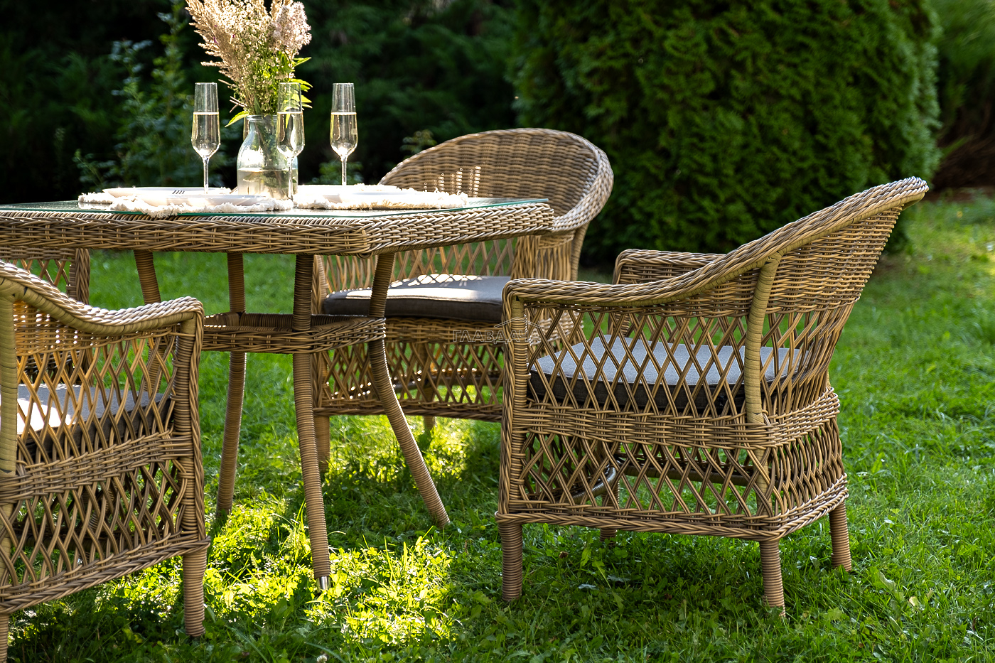 Мебель имеет надежный каркас из легкого алюминия. Изделия дополнительно оплетены ручным методом круглым искусственным ротангом натурального цвета соломы.