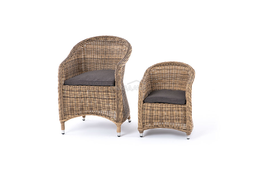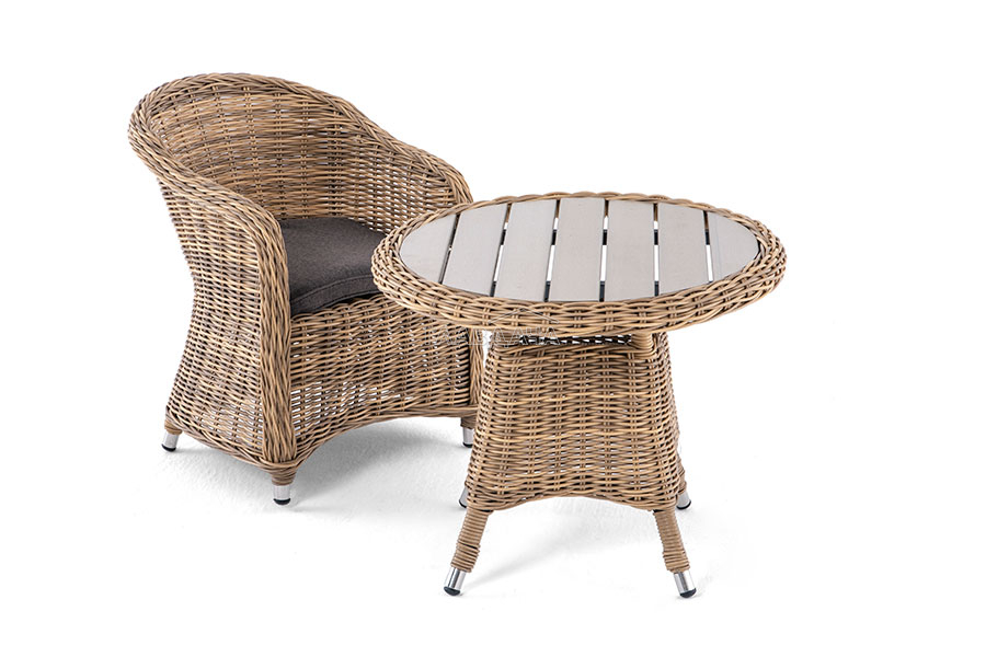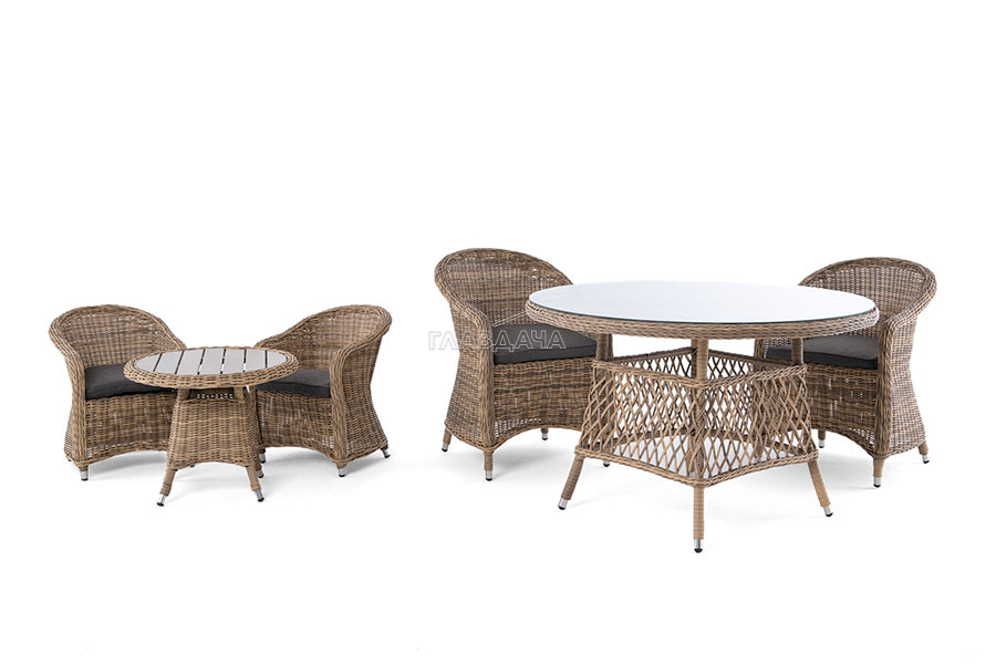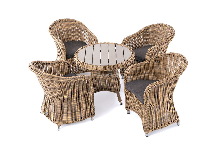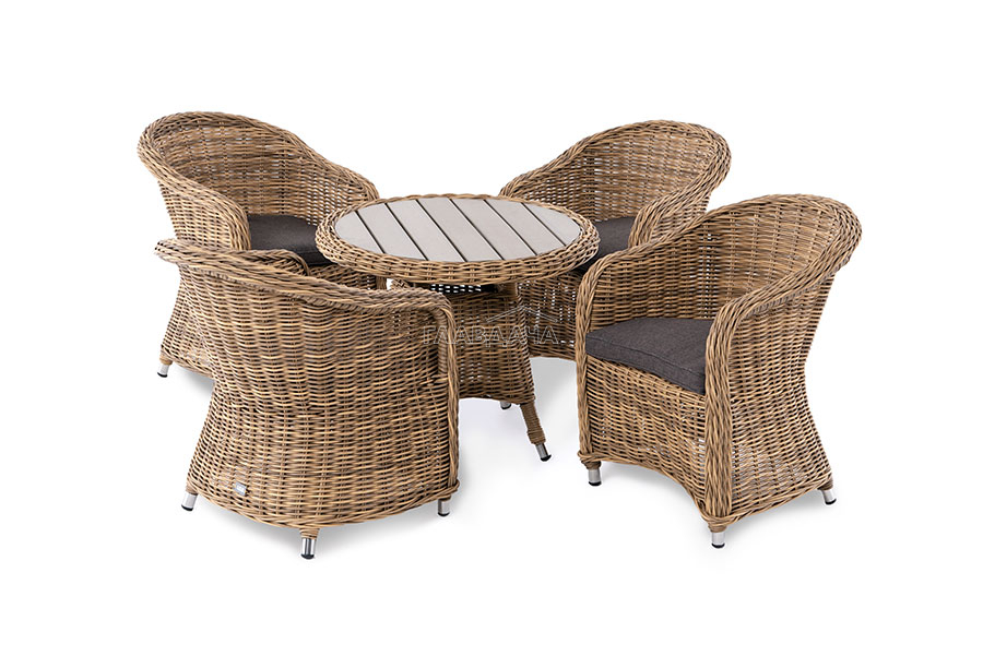 Каркас изготовлен из легкого алюминия, благодаря чему перемещать мебель сможет даже ребенок. В качестве декоративной оплетки использован искусственный ротанг, устойчивый к механическим повреждениях, ультрафиолету, атмосферным осадкам. Столешница изготовлена из долговечного композитного материала ДПК. Стулья укомплектованы подушками из влагостойкой полиэфирной ткани.