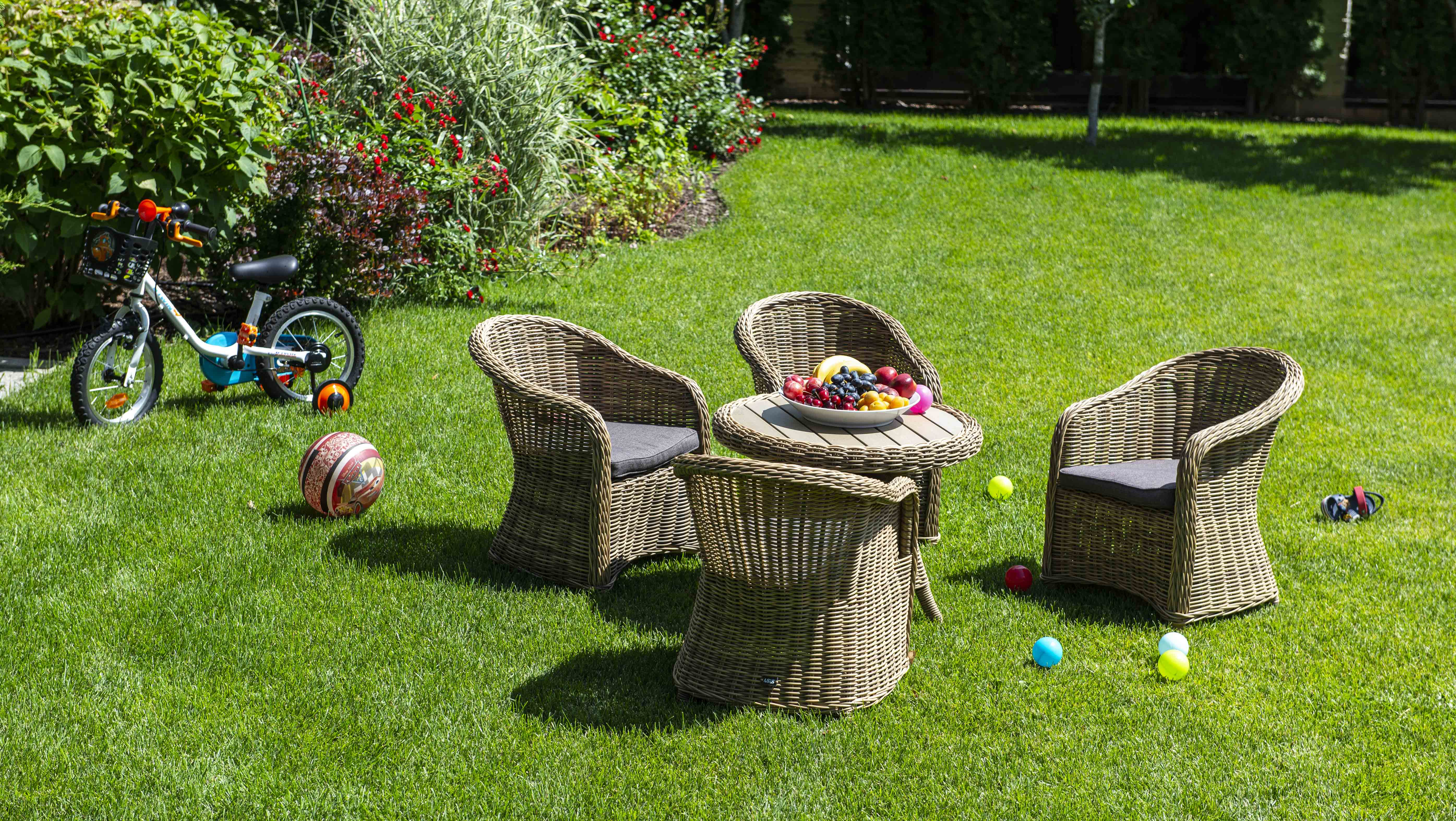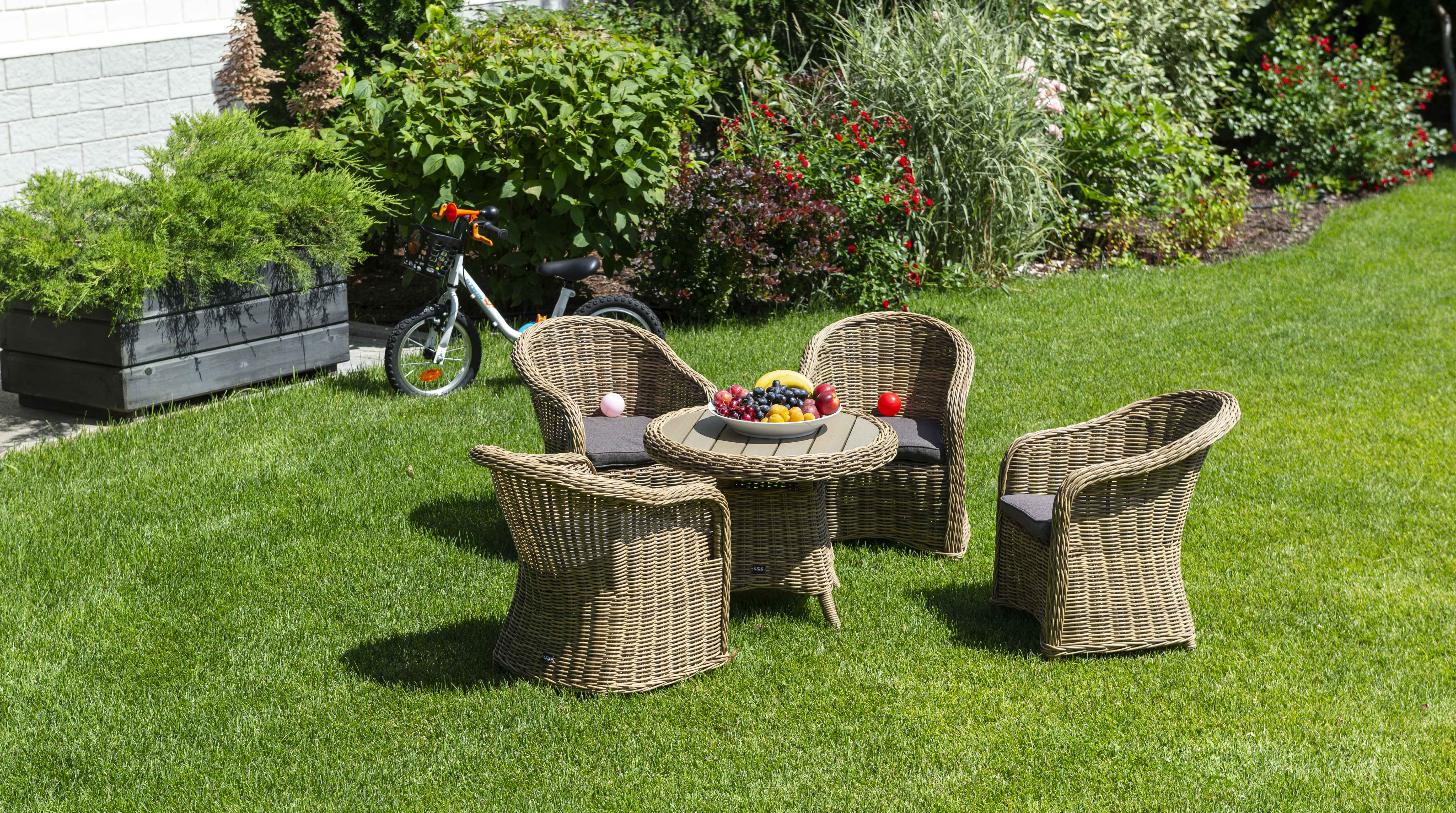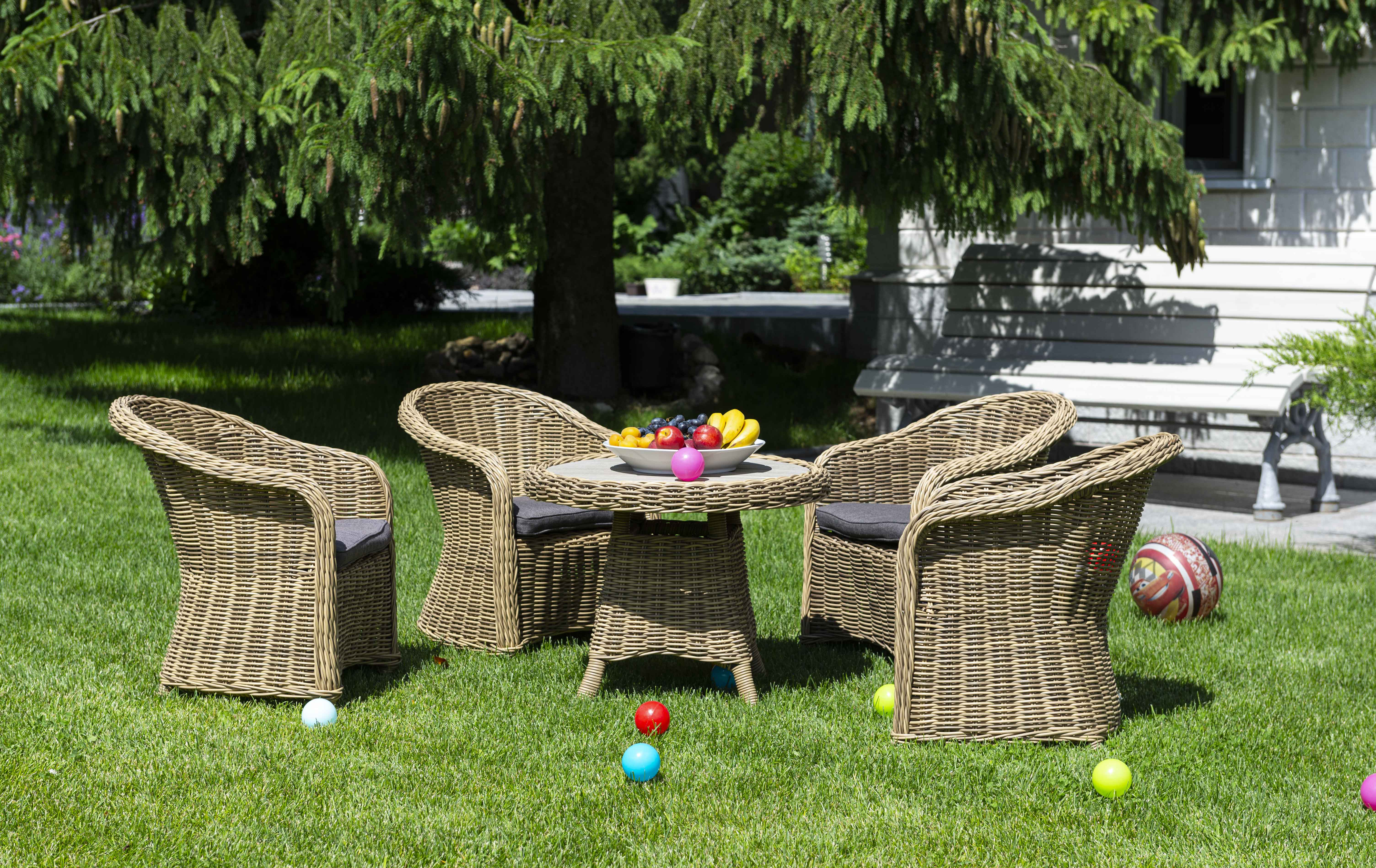 Каркас изготовлен из легкого алюминия, благодаря чему перемещать мебель сможет даже ребенок. В качестве декоративной оплетки использован искусственный ротанг, устойчивый к механическим повреждениях, ультрафиолету, атмосферным осадкам. Столешница изготовлена из долговечного композитного материала ДПК. Стулья укомплектованы подушками из влагостойкой полиэфирной ткани.