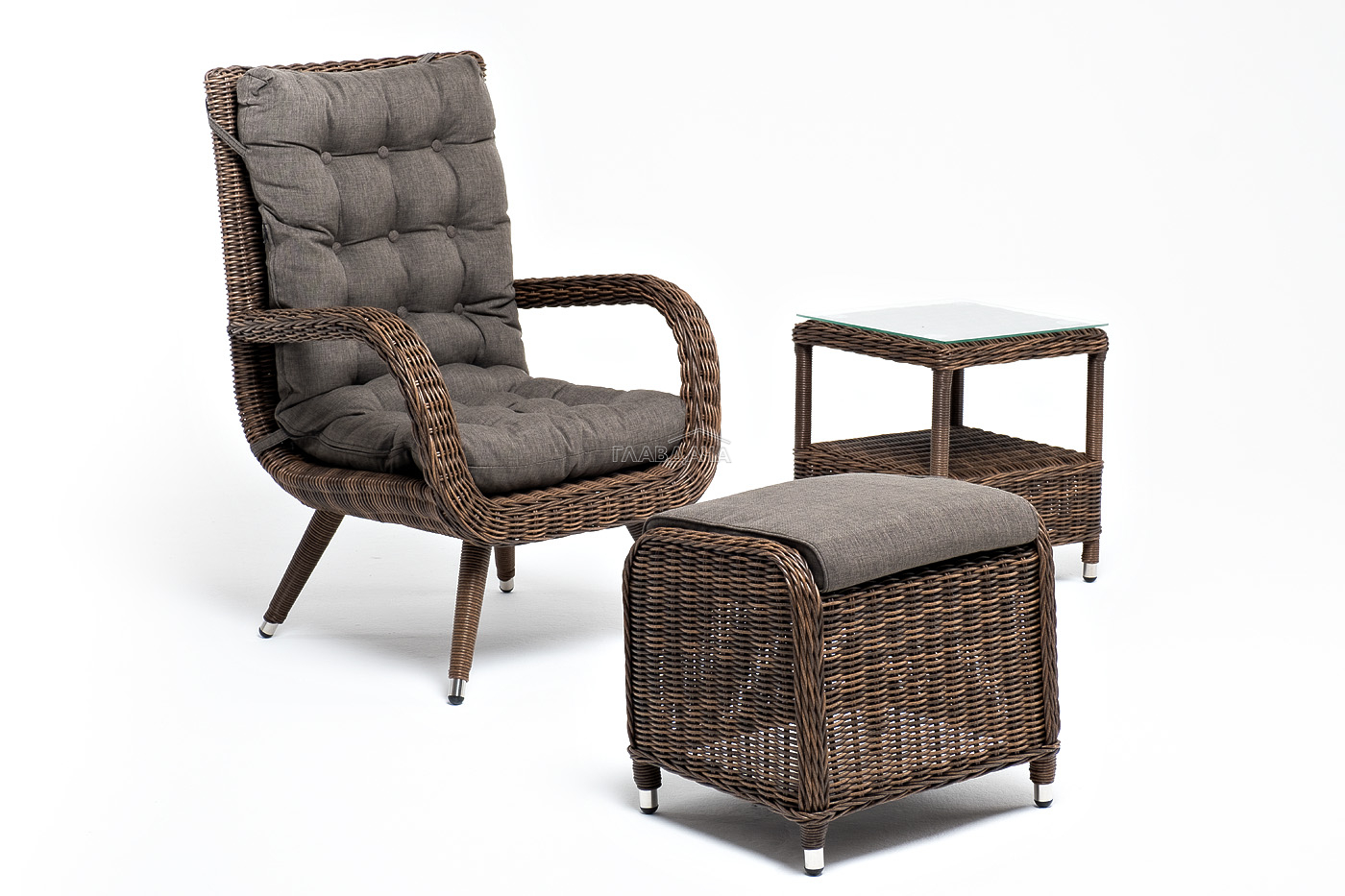 Кресло и пуф укомплектованы подушками со съёмными чехлами из влагостойкого 100%-го полиэстера.