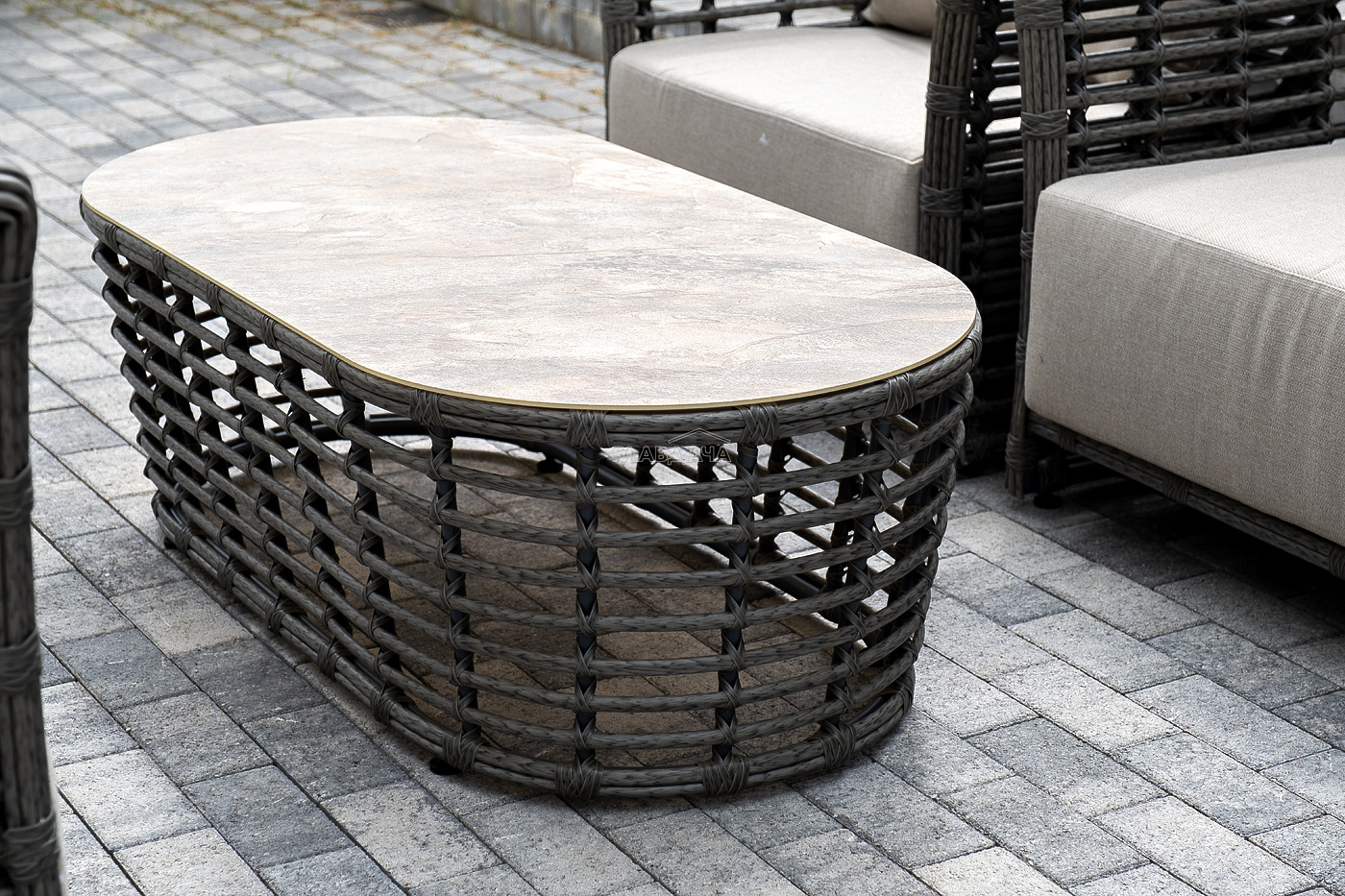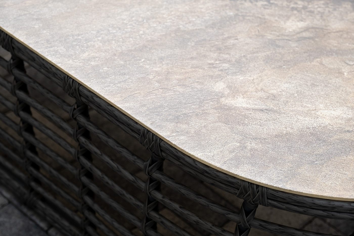 Журнальный столик выполнен из алюминия, вручную оплетенного круглым искусственным ротангом. Столешница из закаленного стекла толщиной 5 мм. Благодаря износостойким материалам, стол пригоден для использования на улице при любой погоде и не требует специальных условий хранения.