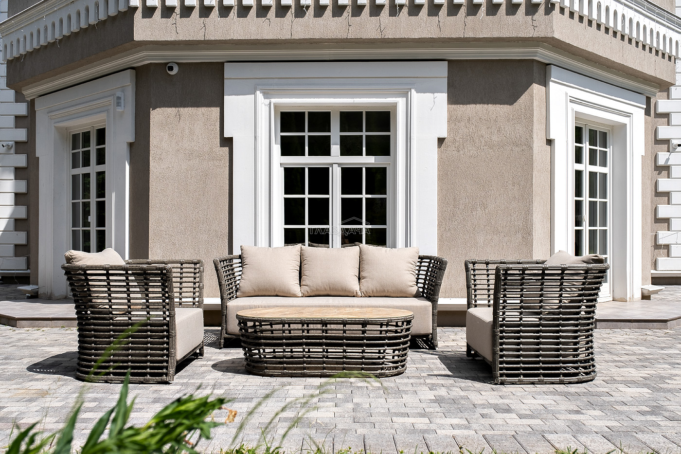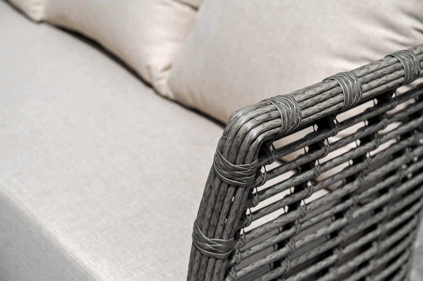 Плетеная мебель дополнена удобными подушками в бежевых чехлах. При их изготовлении используют полиэстер, плотность – 300гр/м2. Он обрабатывается влагоотталкивающей пропиткой для повышения защитных свойств материала.
