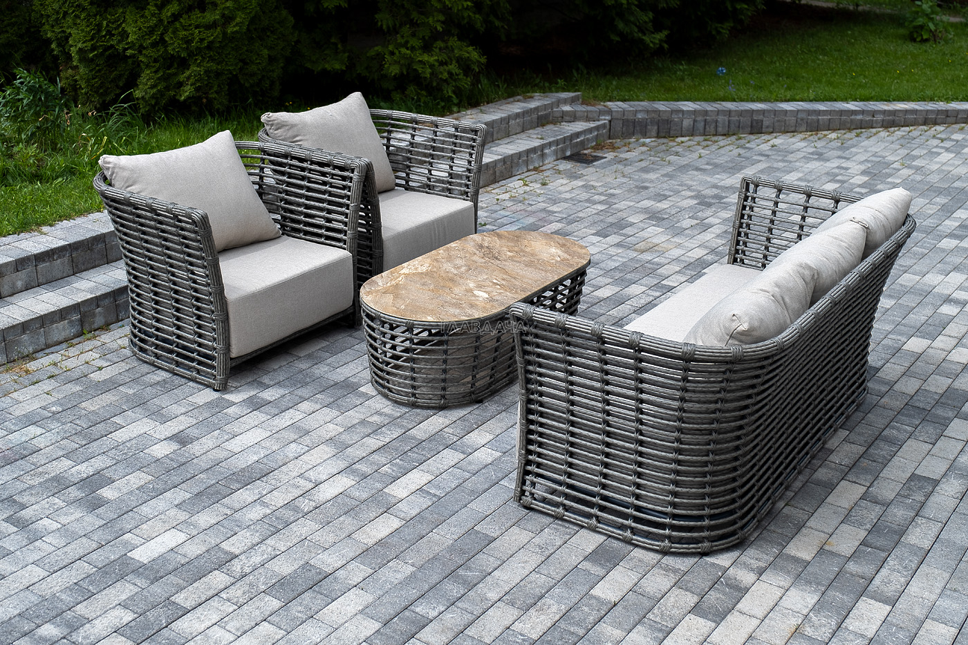Модели имеют алюминиевый каркас, который оплетен вручную искусственным ротангом серого цвета.