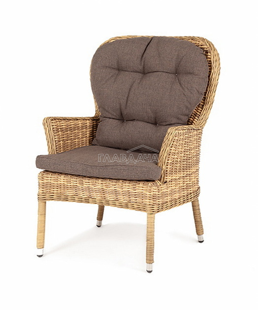 В садовое кресло укомплектовывается мягкими подушками. Они пошиты из износостойкого полиэстера серого оттенка с плотностью 300гр/м2. Защитные свойства синтетического материала усиливаются благодаря влагоотталкивающей пропитке.