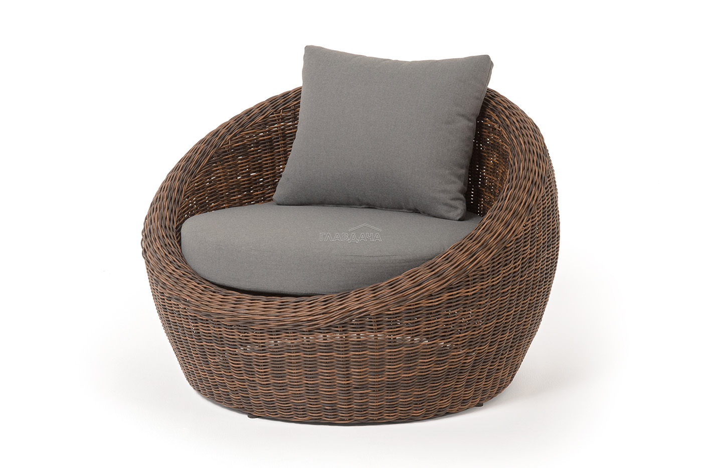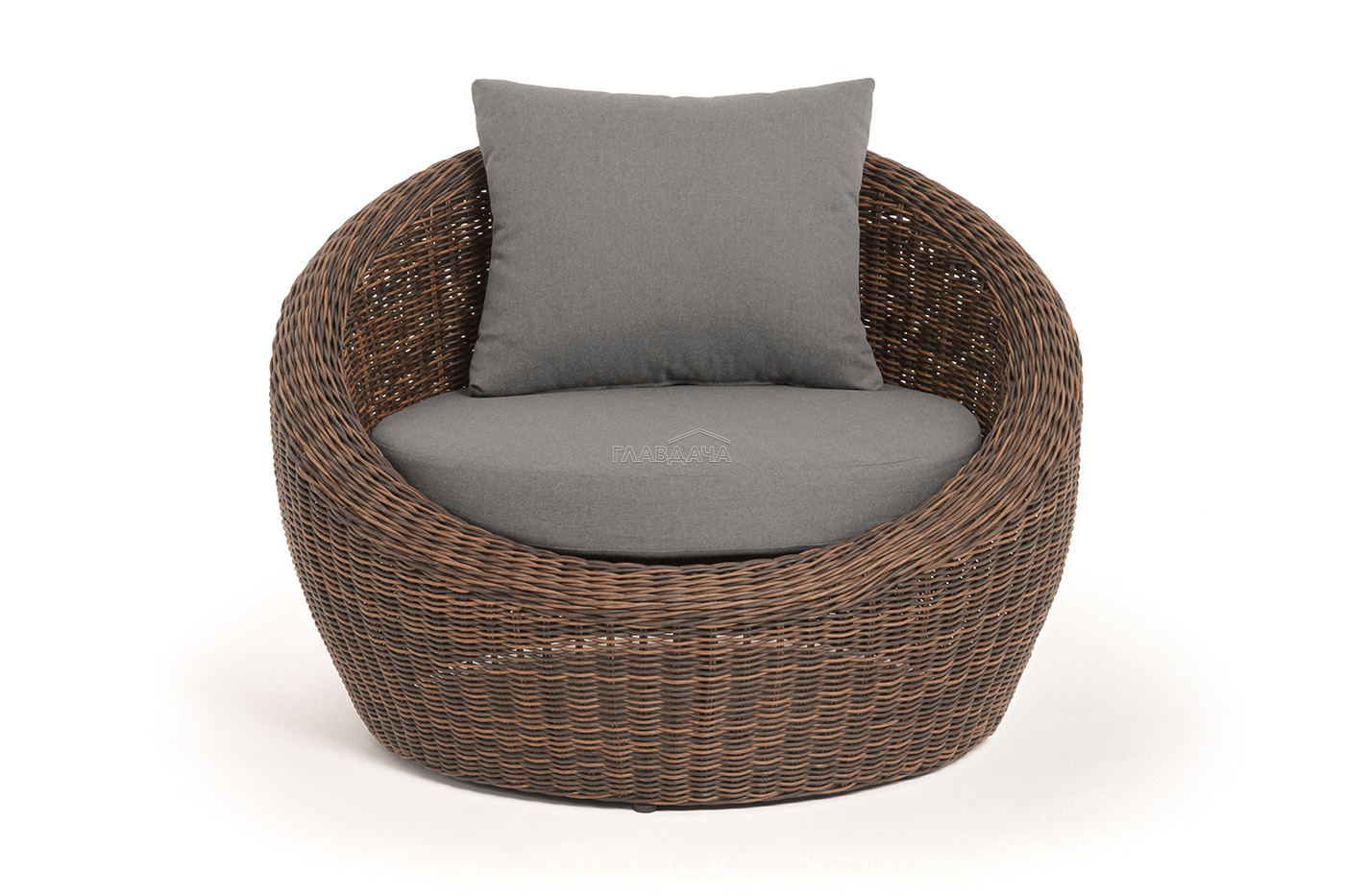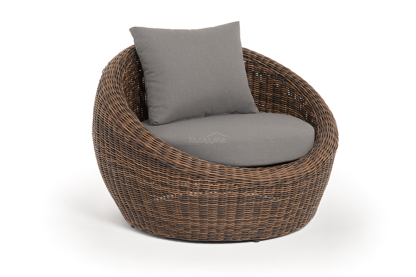 В комплекте с уличным ротанговым креслом идут мягкие подушки со съёмными чехлами серого оттенка. Они пошиты из полиэстера, который не боится повышенной влажности благодаря наличию влагоотталкивающей пропитки. Плотность ткани составляет 300гр/м2.