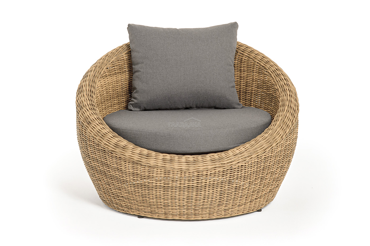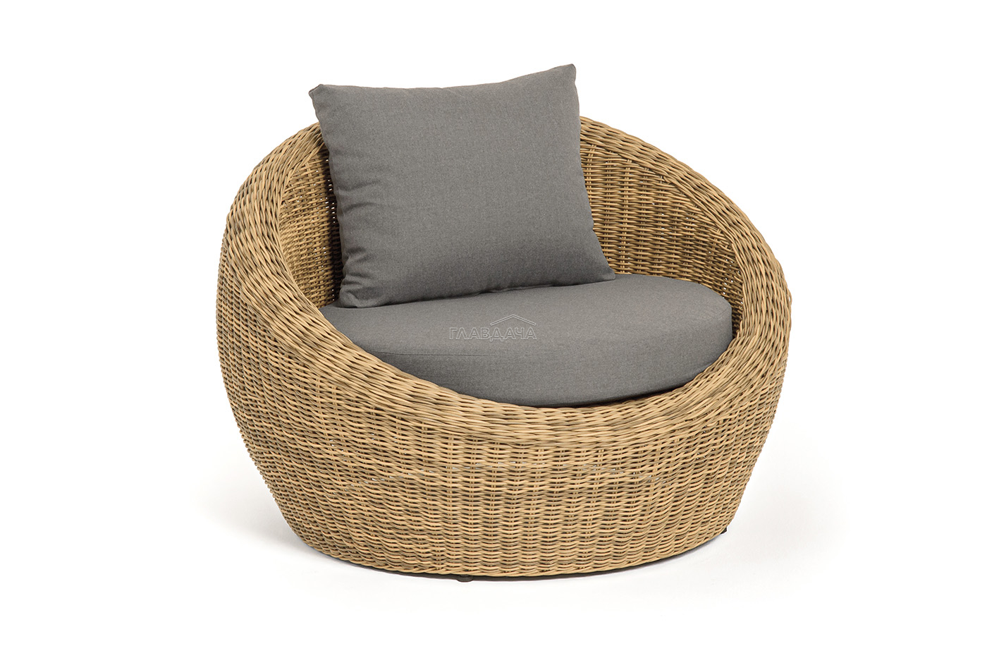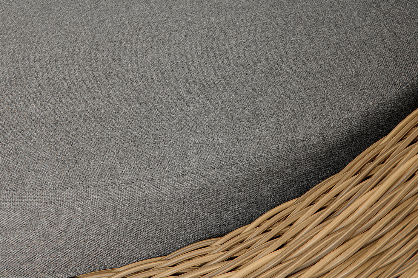 В комплекте с уличным ротанговым креслом идут мягкие подушки со съёмными чехлами серого оттенка. Они пошиты из полиэстера, который не боится повышенной влажности благодаря наличию влагоотталкивающей пропитки. Плотность ткани составляет 300гр/м2.