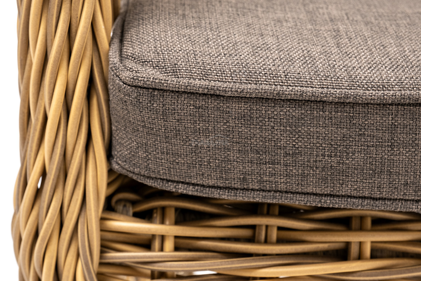 Садовое кресло располагает двумя мягкими подушками, которые идут в комплекте. Они выполнены в сером цвете. Полиэстер высокого качества используется при пошиве тканевых изделий. Его плотность 300гр/м2. Ткань обрабатывается влагоотталкивающей пропиткой.