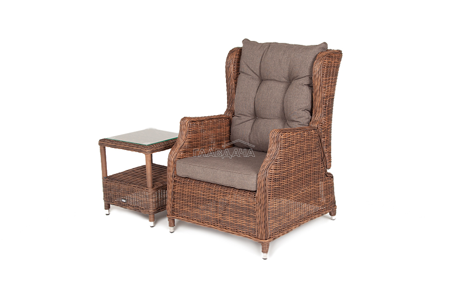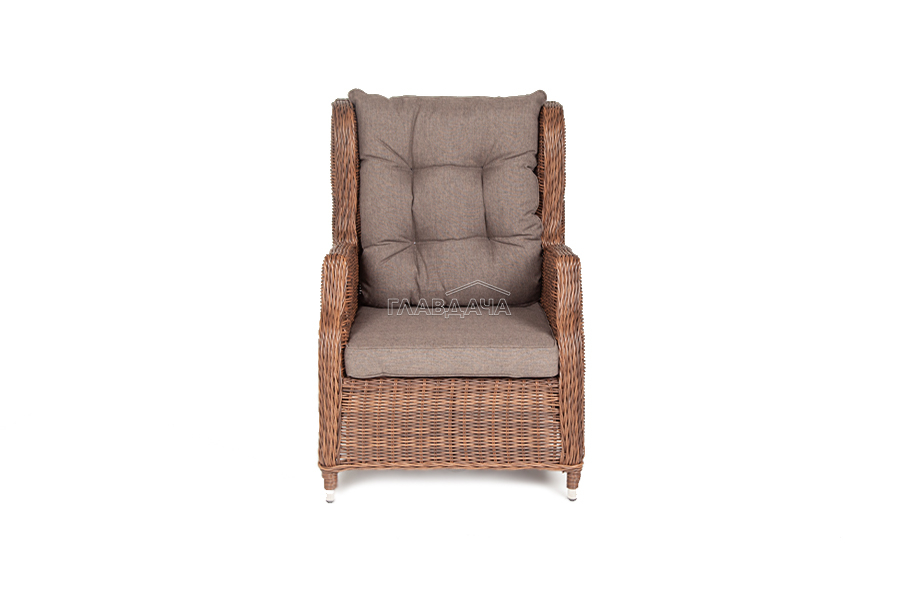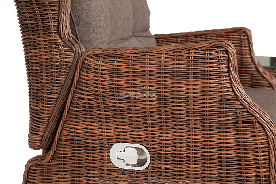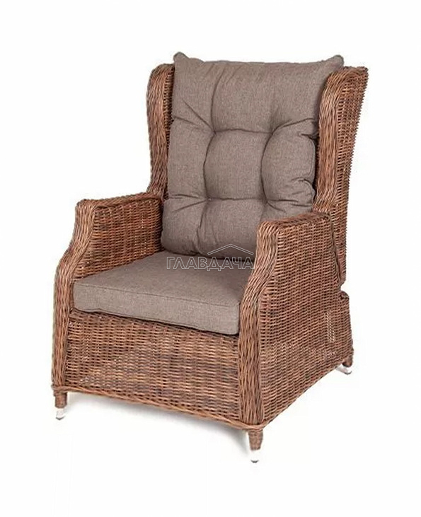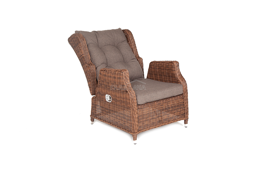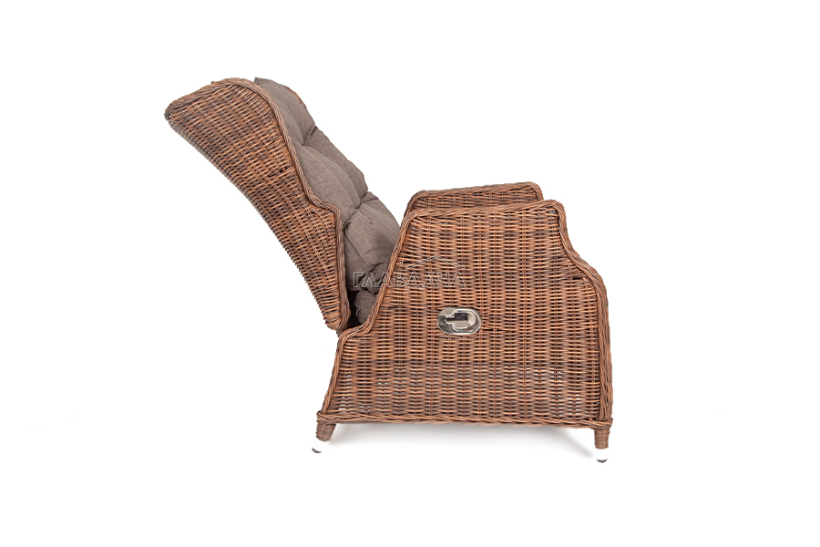 Кресло из искусственного ротанга «Форио» коричневого цвета, разработано с возможностью регулировки уровня наклона для индивидуального комфорта.
