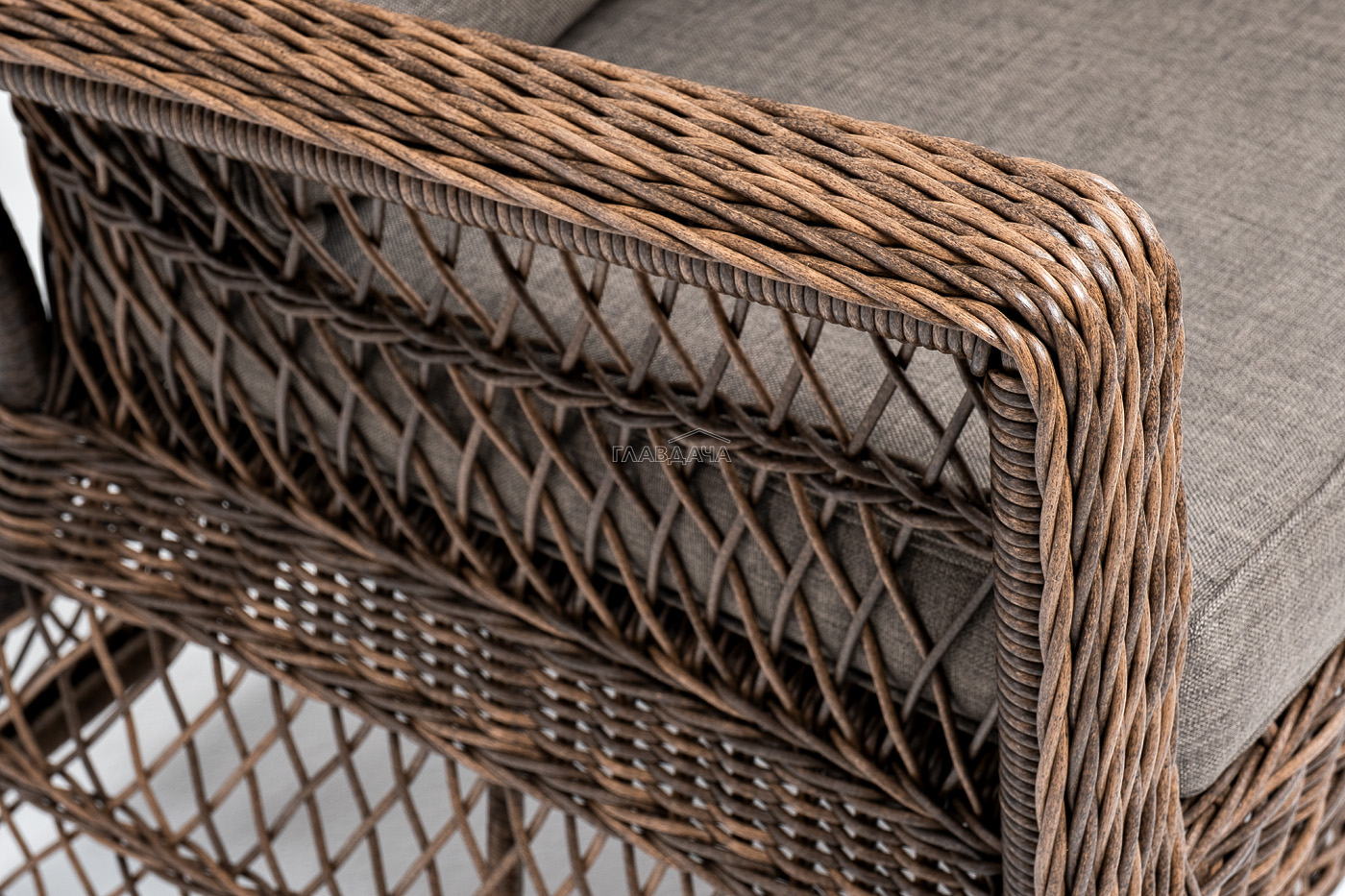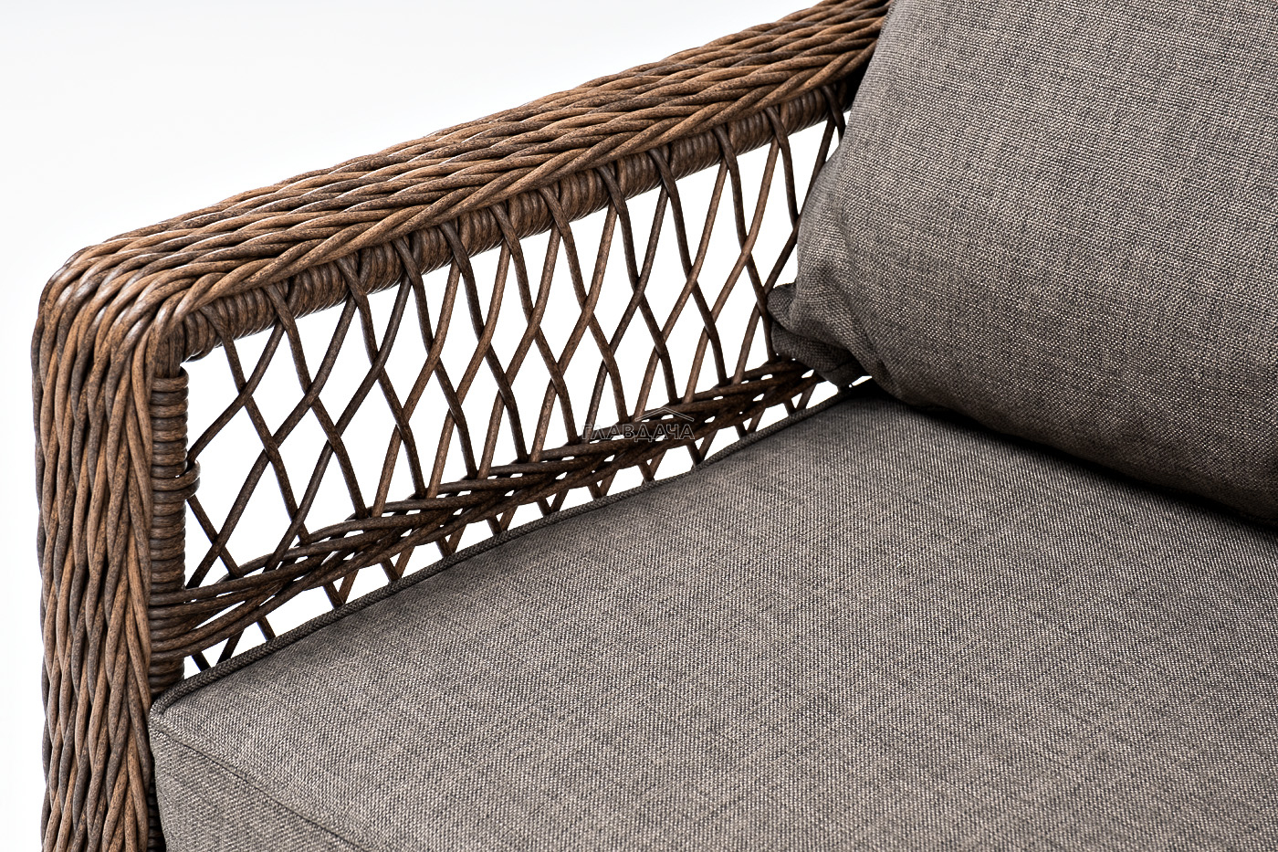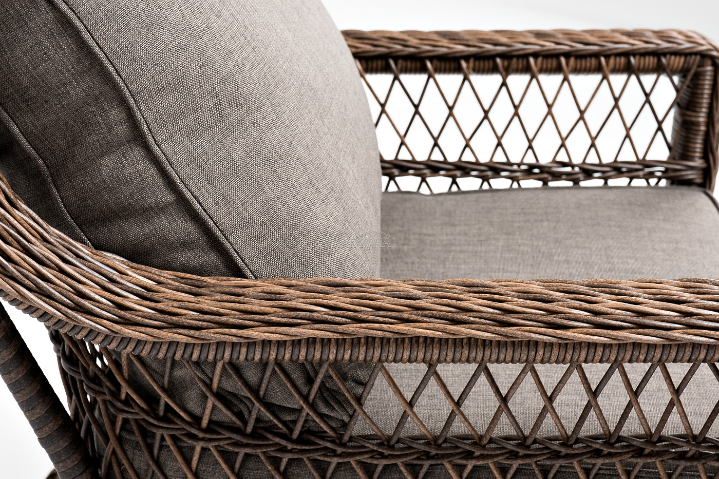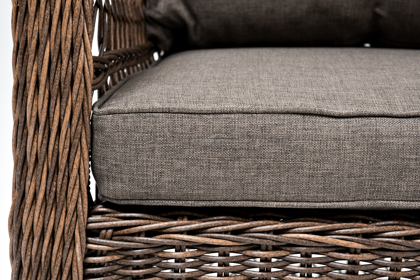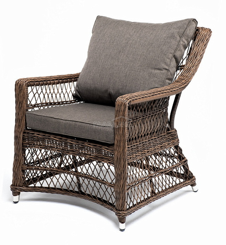 Укомплектовано плетеное кресло удобными мягкими подушками, одна из которых располагается в области спинки. Они выполнены в сером оттенке. При пошиве тканевых изделий используется полиэстер, плотностью 300гр/м2. Он в обязательном порядке проходит обработку влагоотталкивающей пропиткой.