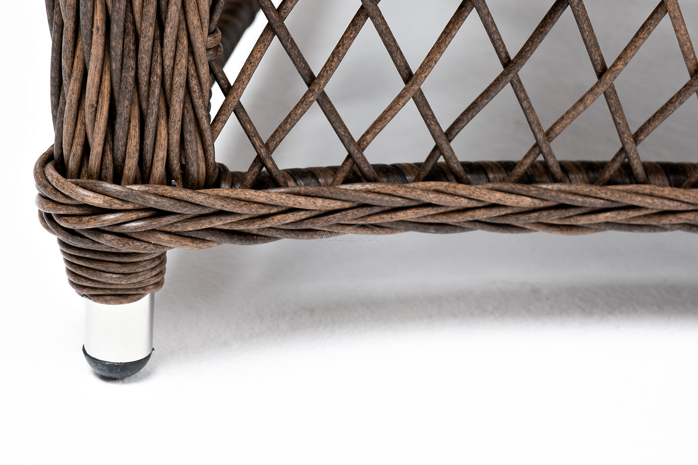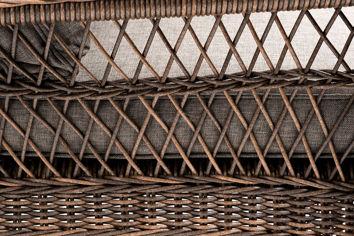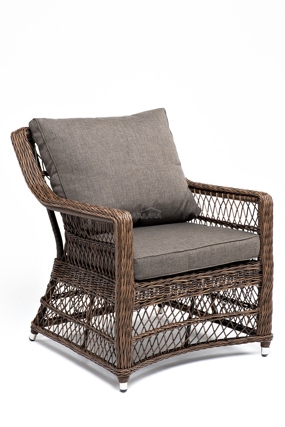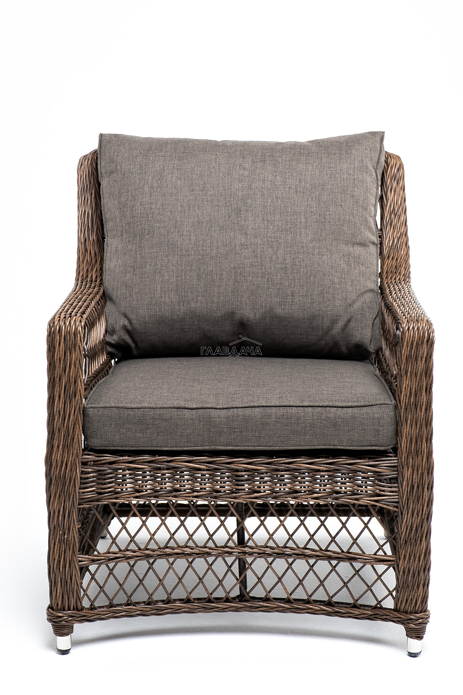 Укомплектовано плетеное кресло удобными мягкими подушками, одна из которых располагается в области спинки. Они выполнены в сером оттенке. При пошиве тканевых изделий используется полиэстер, плотностью 300гр/м2. Он в обязательном порядке проходит обработку влагоотталкивающей пропиткой.