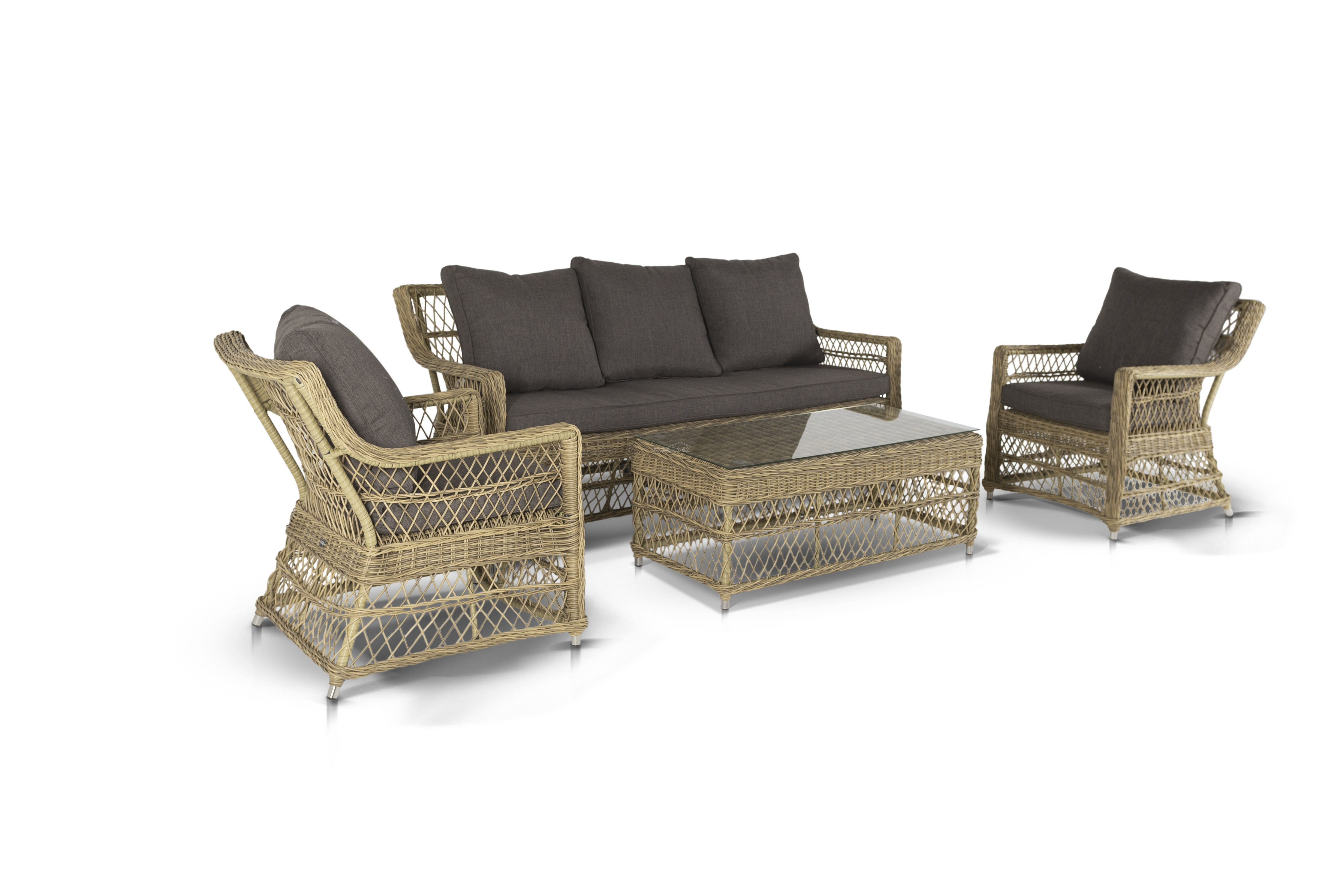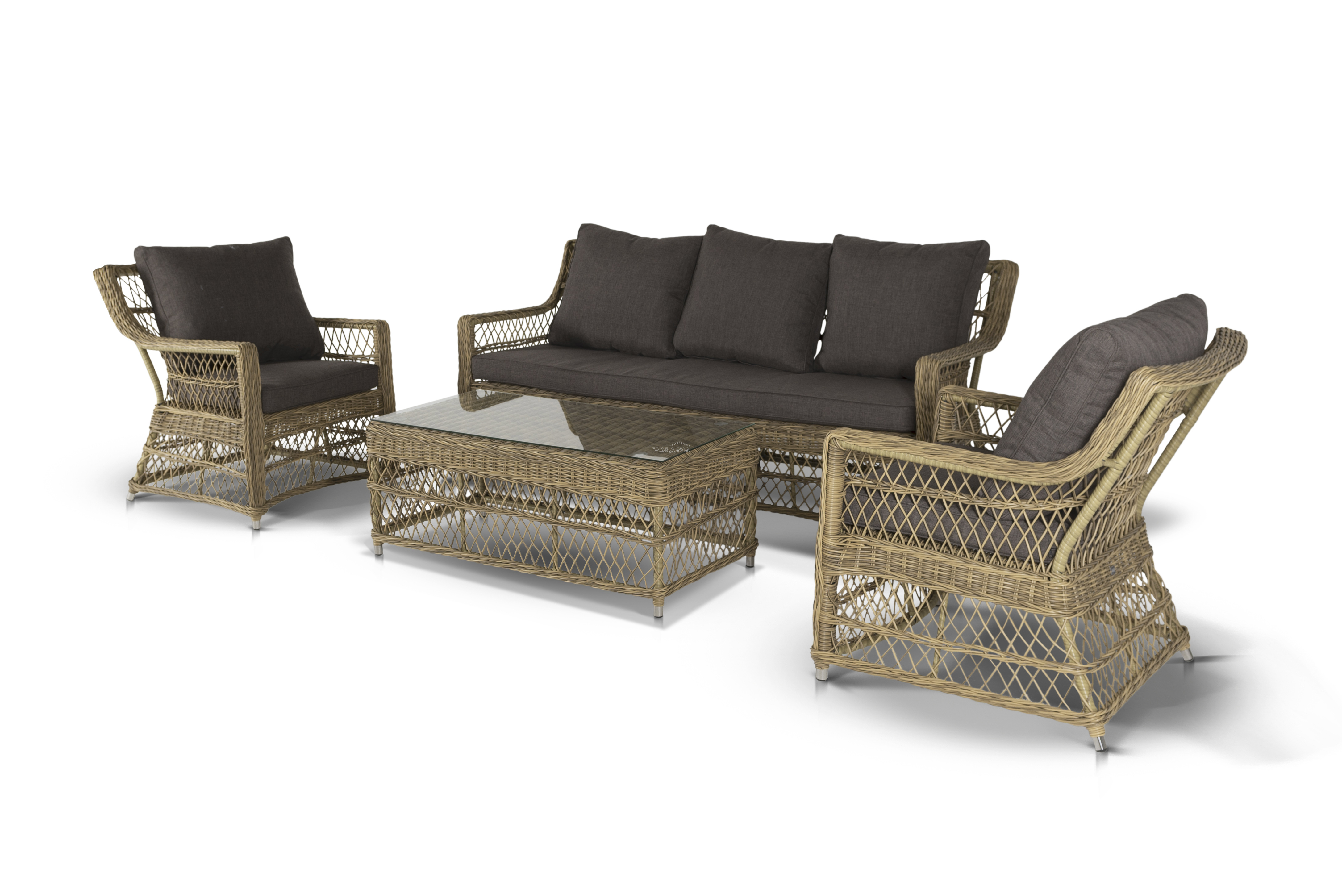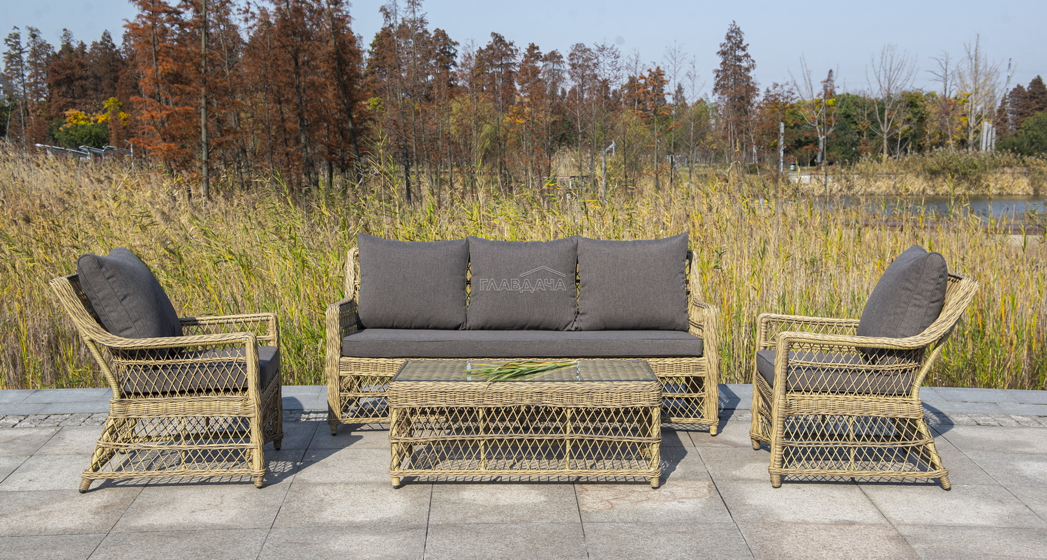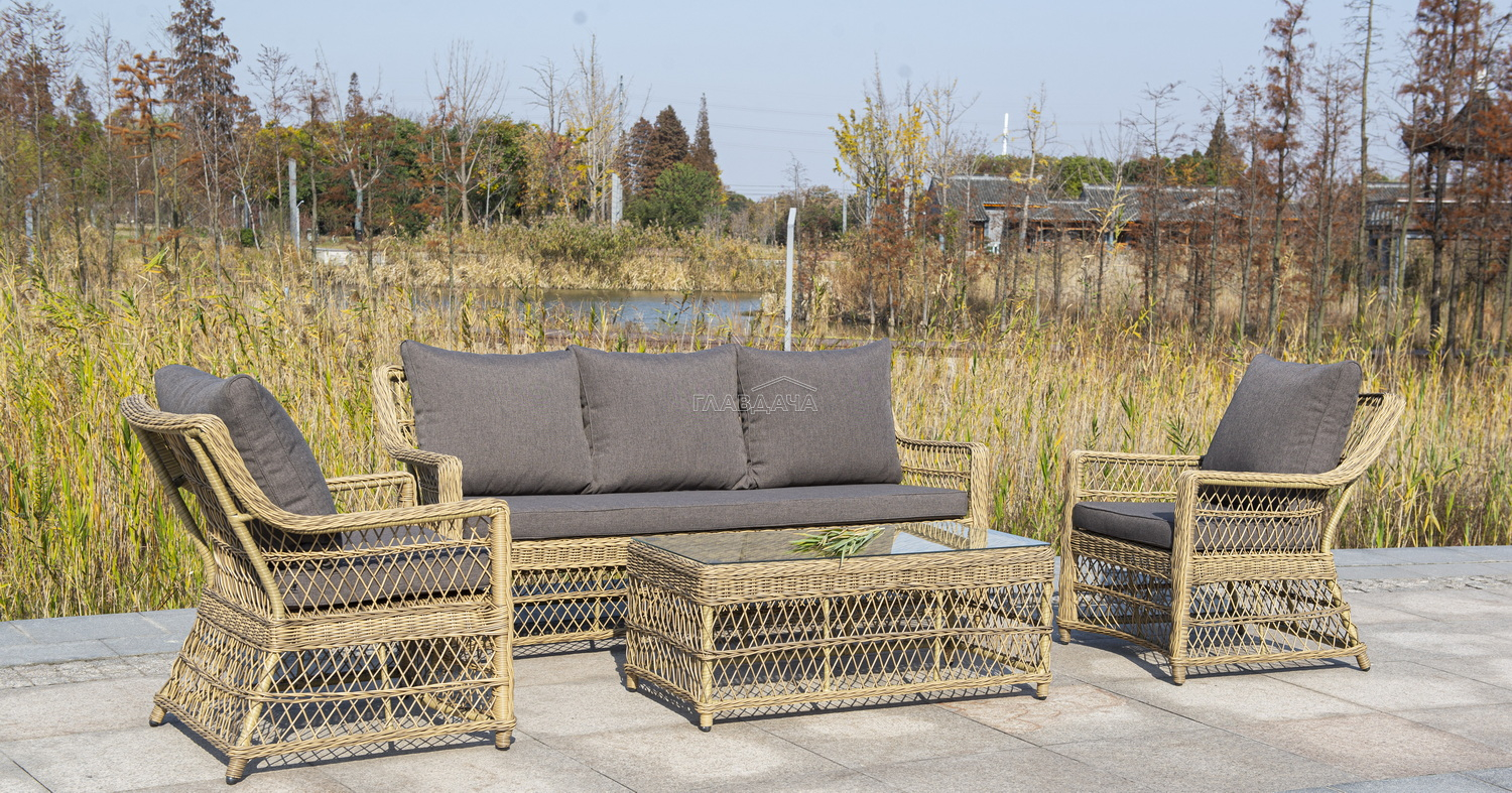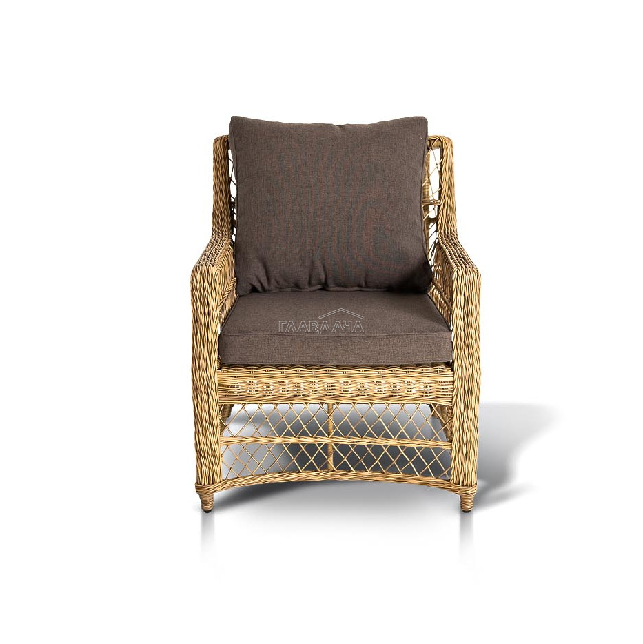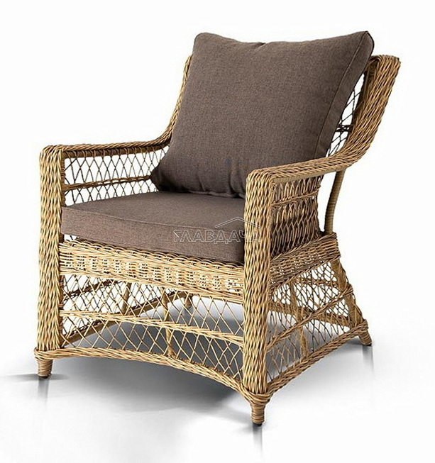 Укомплектовано плетеное кресло удобными мягкими подушками, одна из которых располагается в области спинки. Они выполнены в сером оттенке. При пошиве тканевых изделий используется полиэстер, плотностью 300гр/м2. Он в обязательном порядке проходит обработку влагоотталкивающей пропиткой.