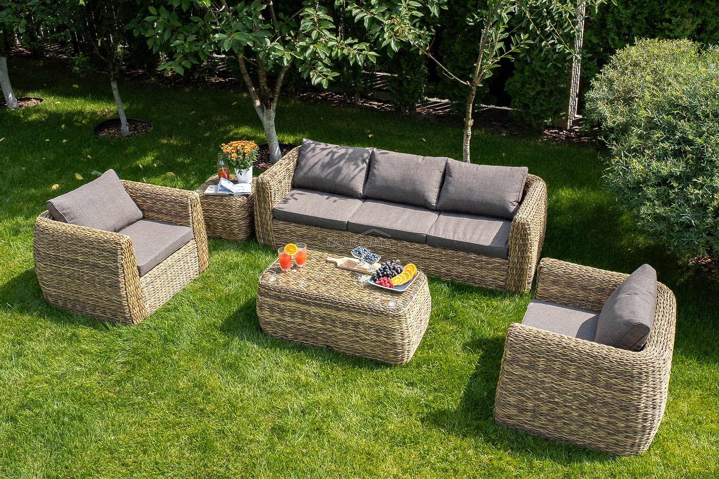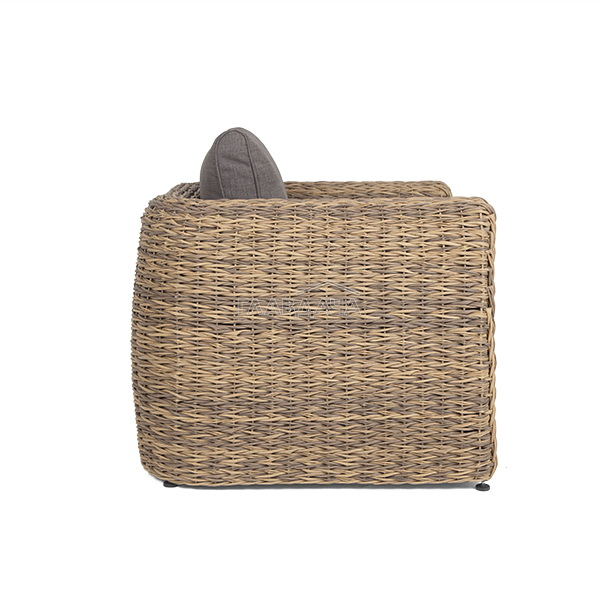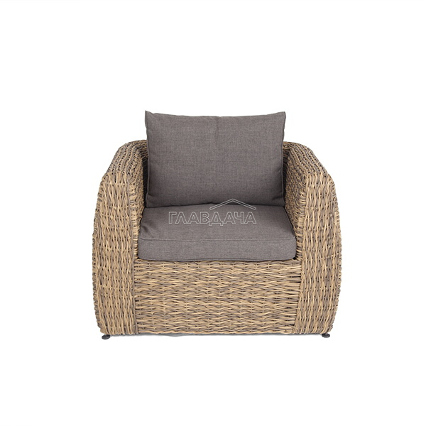 Кресло из искусственного ротанга «Кальяри» оснащено каркасом из прочного алюминия, ручное круглое плетение является основным декоративным элементом мебели. Оно выполнено из искусственного ротанга вида «гиацинт» соломенного цвета.