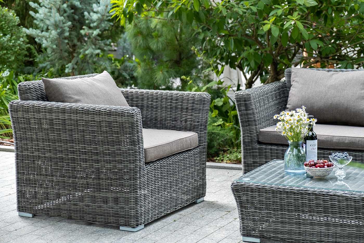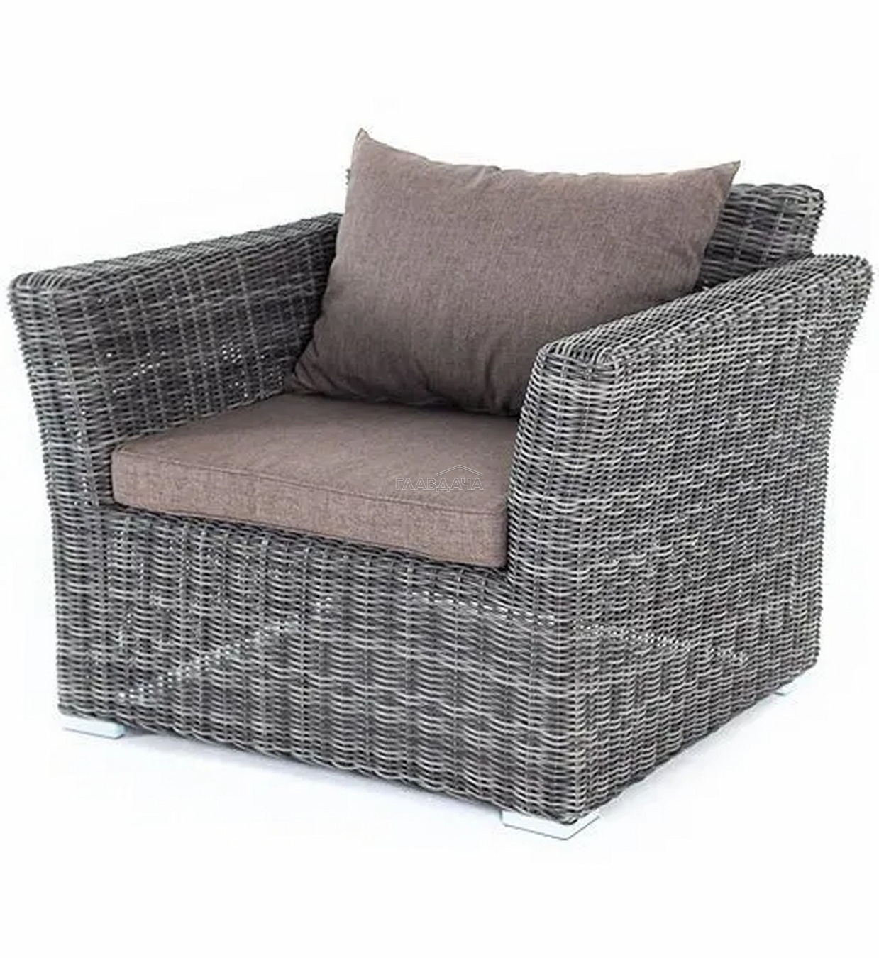 Кресло из круглого искусственного ротанга «Капучино» графитового цвета, прекрасно подходит для обустройства веранды, а относительно небольшой вес, который составляет 20 кг, увеличивает мобильность данной модели.