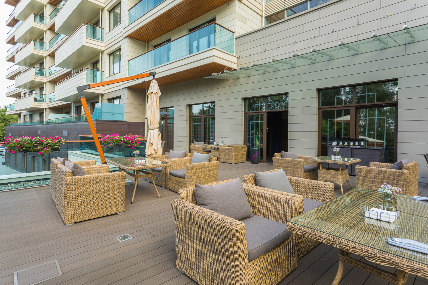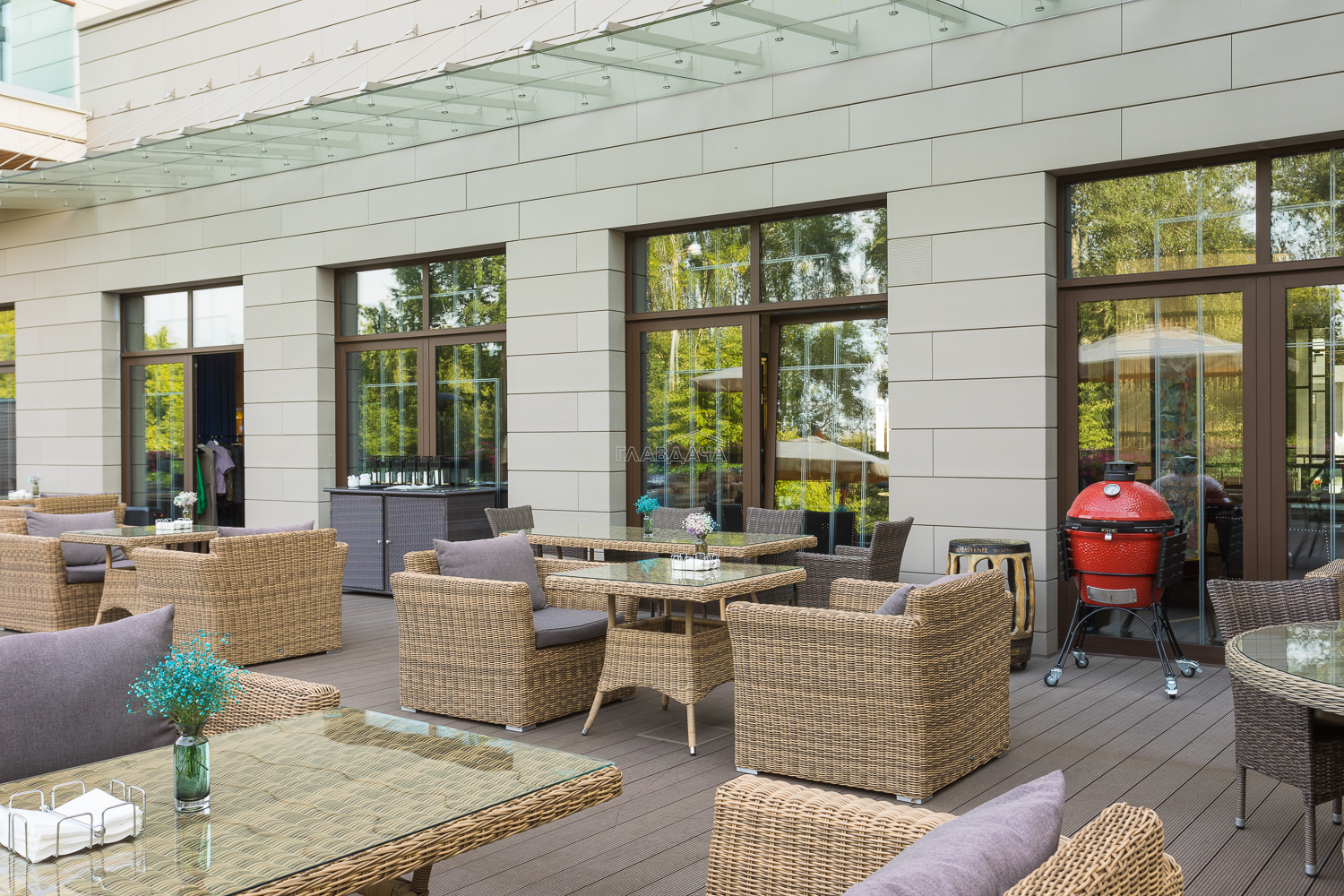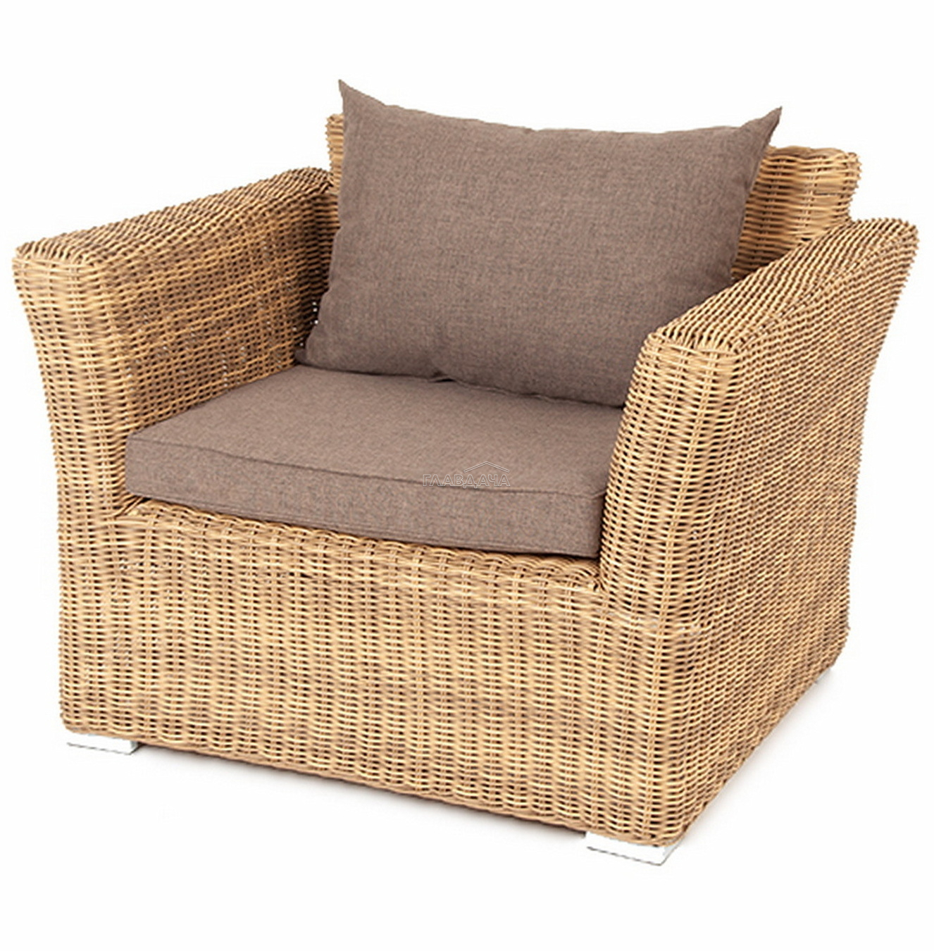 Ее отличает алюминиевый каркас высокой прочности. В качестве декоративной составляющей выступает ручное плетение на основе круглого искусственного ротанга. Оно выполнено в соломенном оттенке.