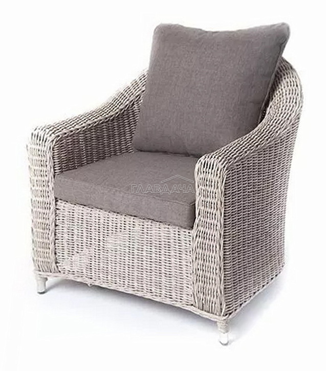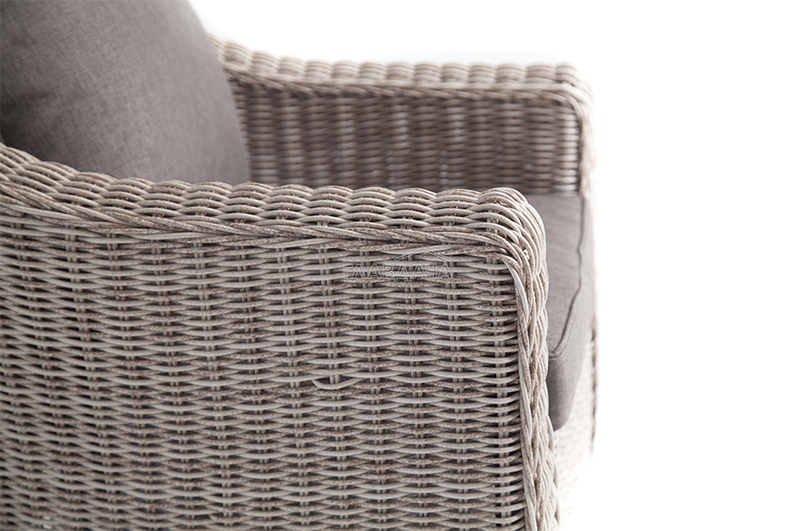 У кресла есть мягкие подушки, выполненые в сером цвете. Они сделаны из прочного полиэстера с плотностью 300гр/м2. Ткань имеет влагоотталкивающую пропитку, которая защищает ее от сильного намокания.
