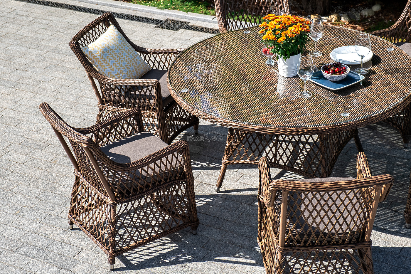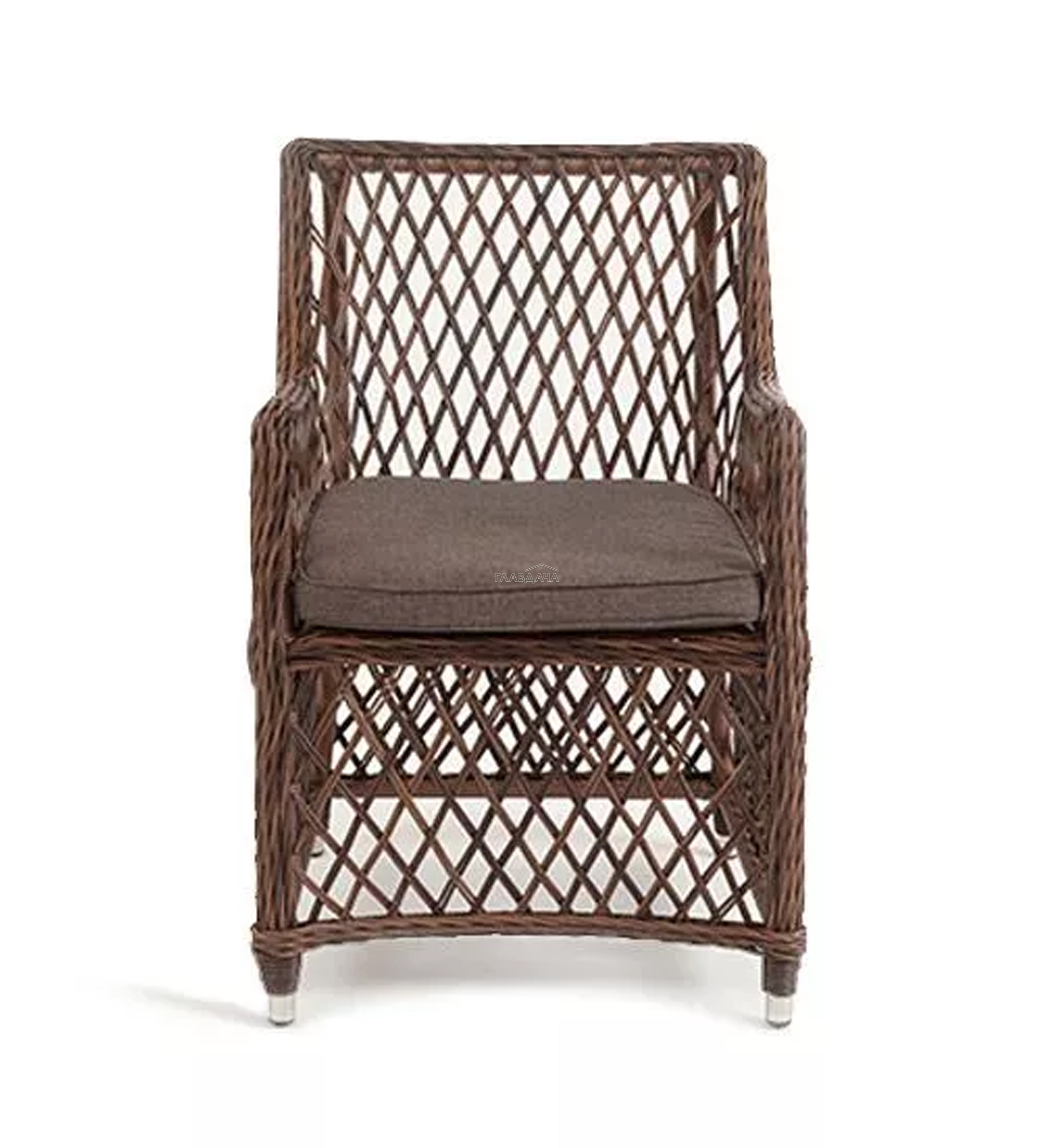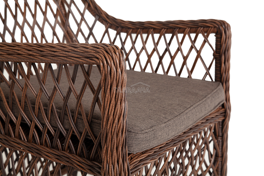 Каркас сделан из прочного алюминия. Сверху конструкции - ручное плетение из круглого искусственного ротанга. Стул коричневого цвета.