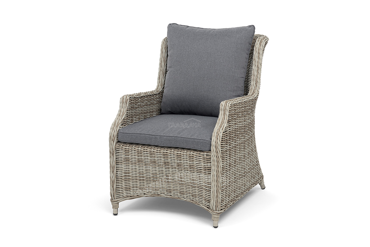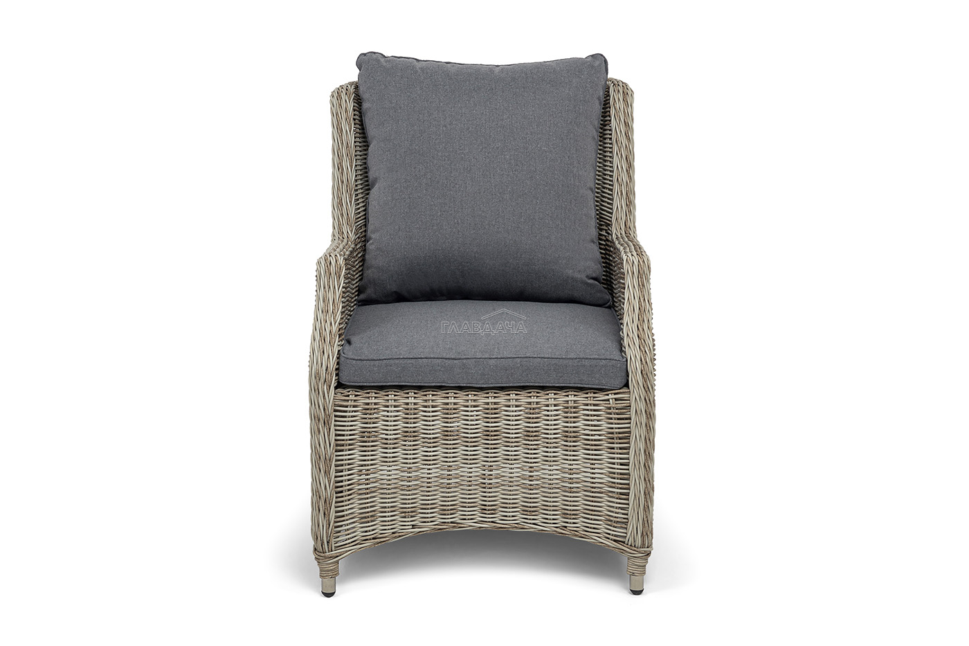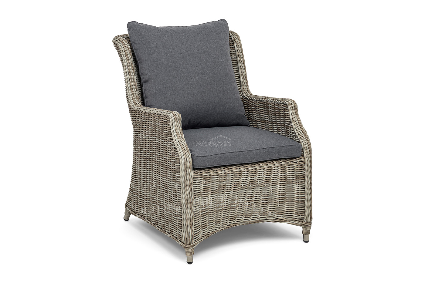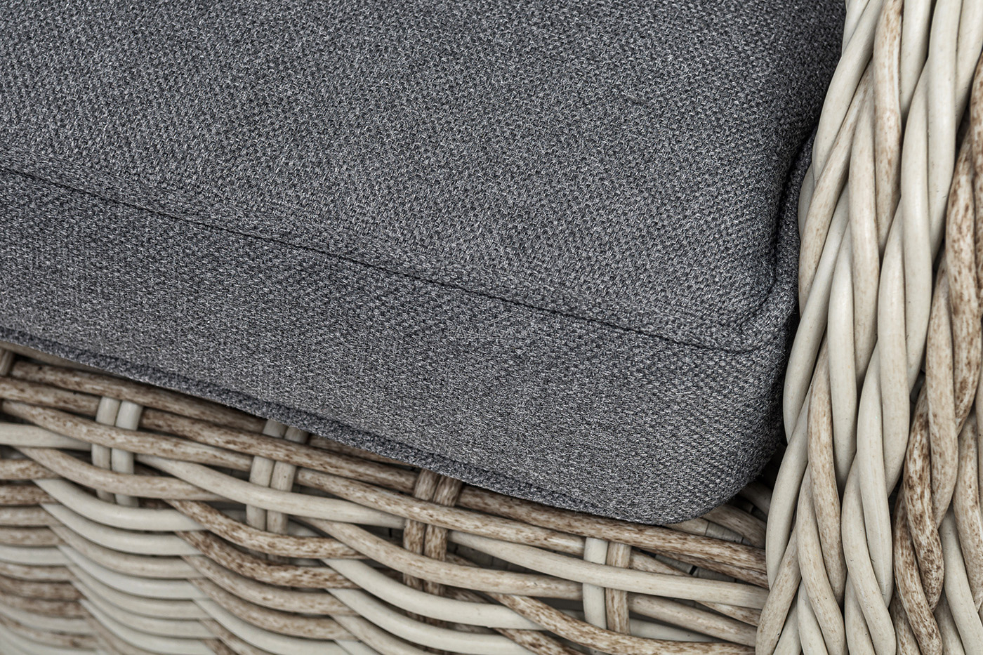Плетенный стул дополняют мягкие подушки. Они выполнены в сером оттенке. Пошиты изделия из плотного полиэстера 300гр/м2. Ткань предварительно обрабатывается влагоотталкивающей пропиткой.