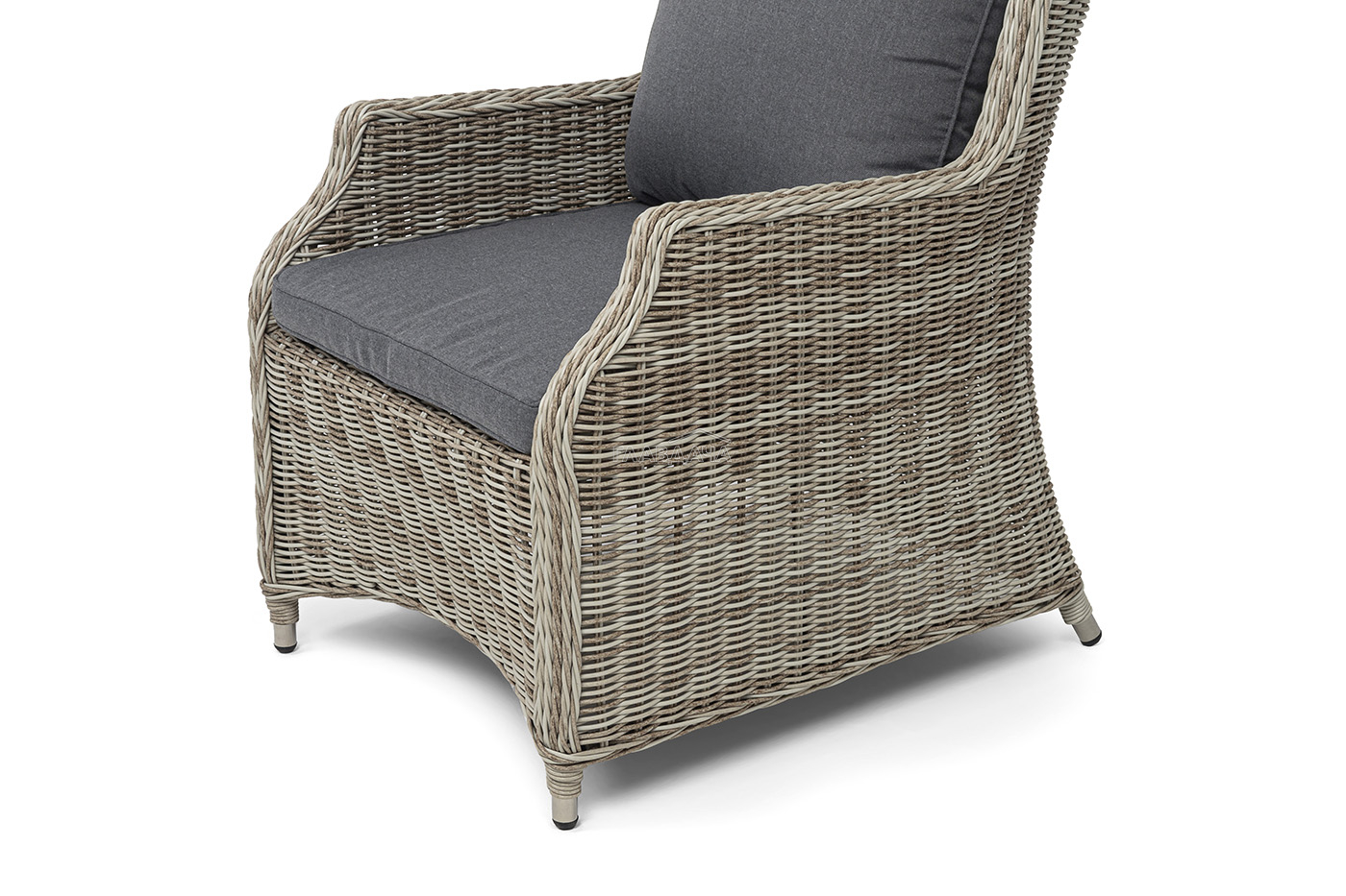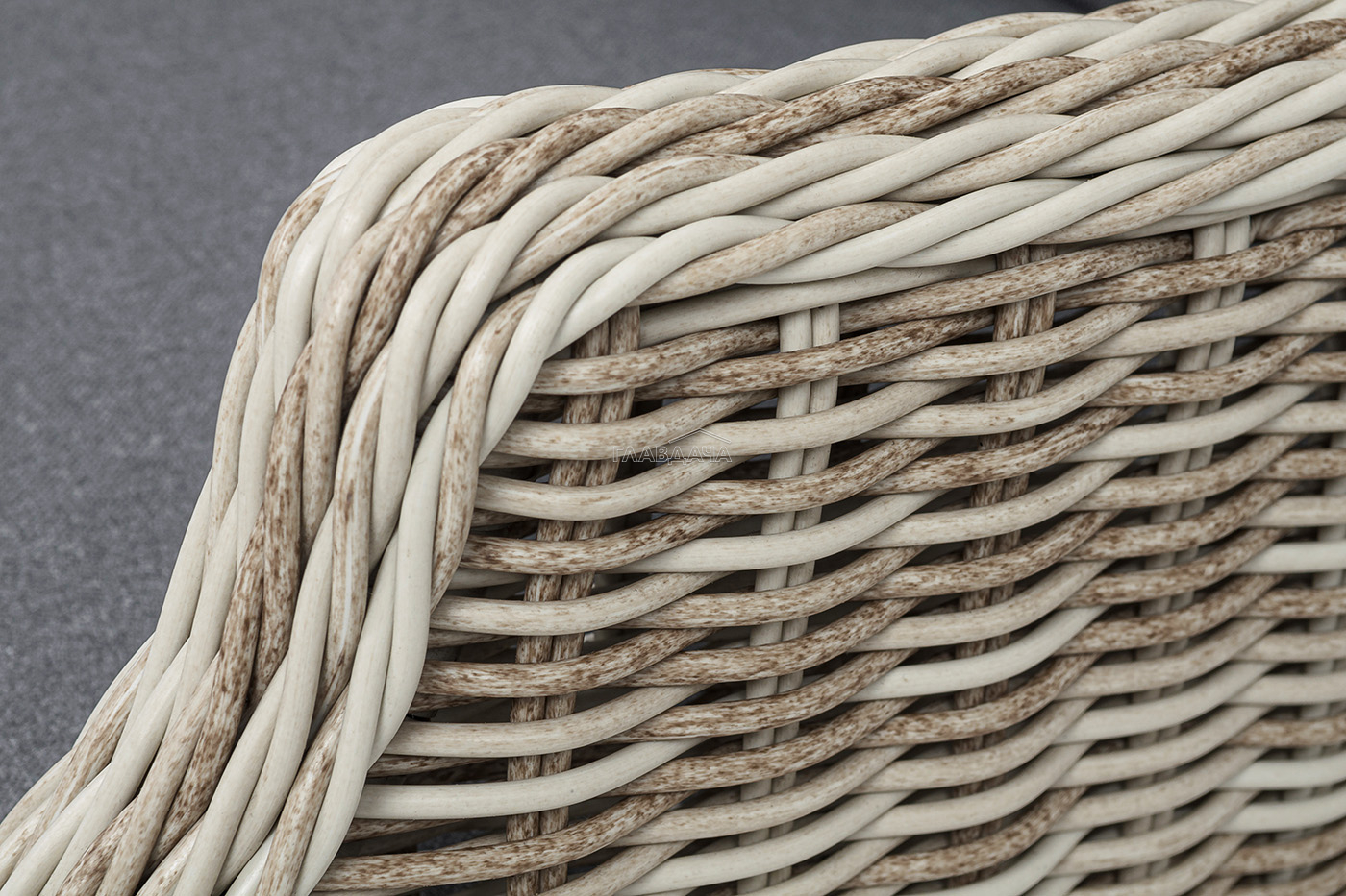 Спинка и подлокотники имеют планые линии, благодаря своим закругленным формам. Каркас мебели сделан из алюминия. Присутствует ручное круглое плетение, при изготовлении которого используется искусственный ротанг. Представлено в бежевом цвете.