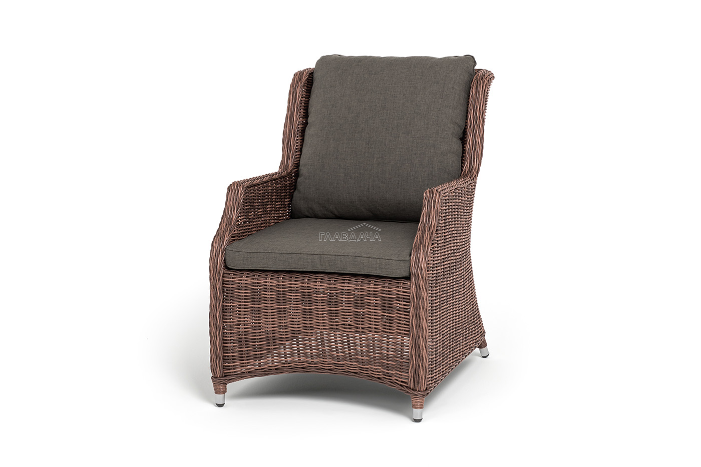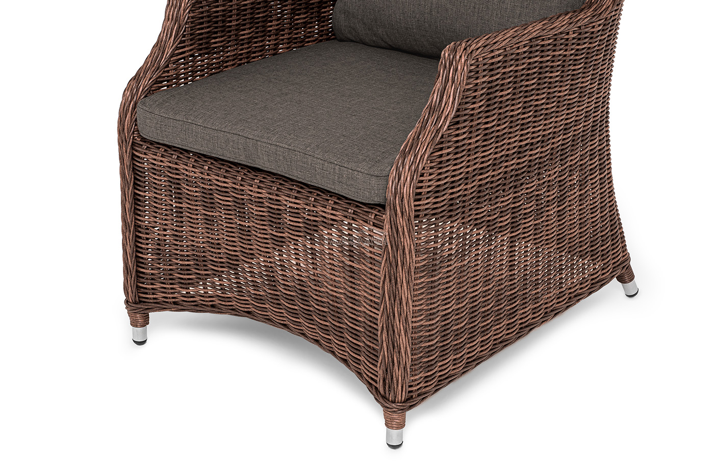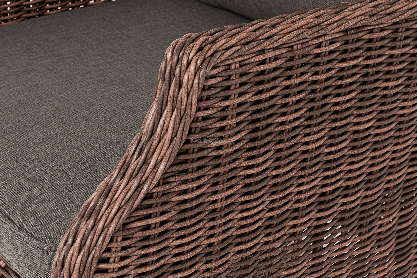 Спинка и подлокотники имеют планые линии, благодаря своим закругленным формам. Каркас мебели сделан из алюминия. Присутствует ручное круглое плетение, при изготовлении которого используется искусственный ротанг. Представлено в коричневом цвете.