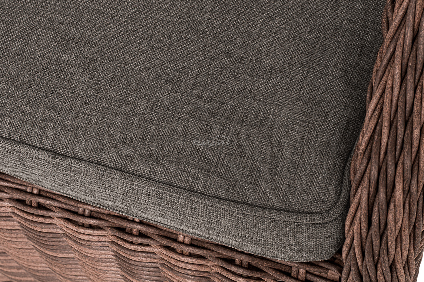 Плетенный стул дополняют мягкие подушки. Они выполнены в сером оттенке. Пошиты изделия из плотного полиэстера 300гр/м2. Ткань предварительно обрабатывается влагоотталкивающей пропиткой.