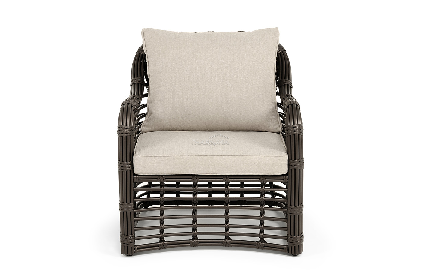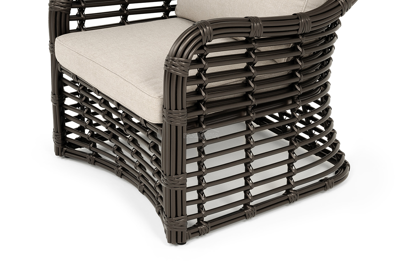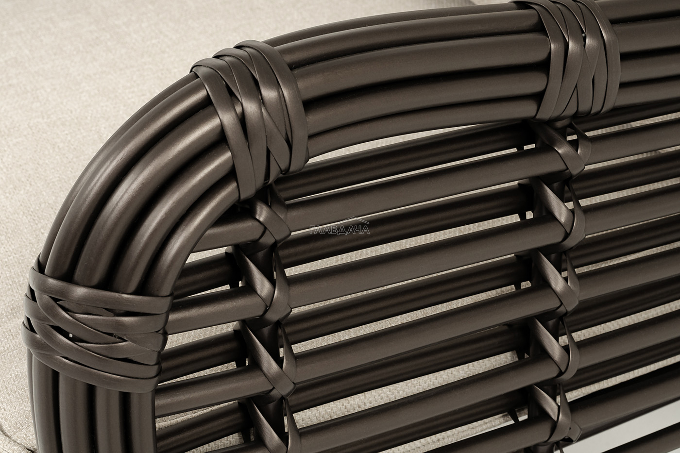 Каркас мебели сделан из прочного алюминия с высокими эксплуатационными качествами. Оплетен вручную с помощью круглого искусственного ротанга. Представлено в бронзовом оттенке.