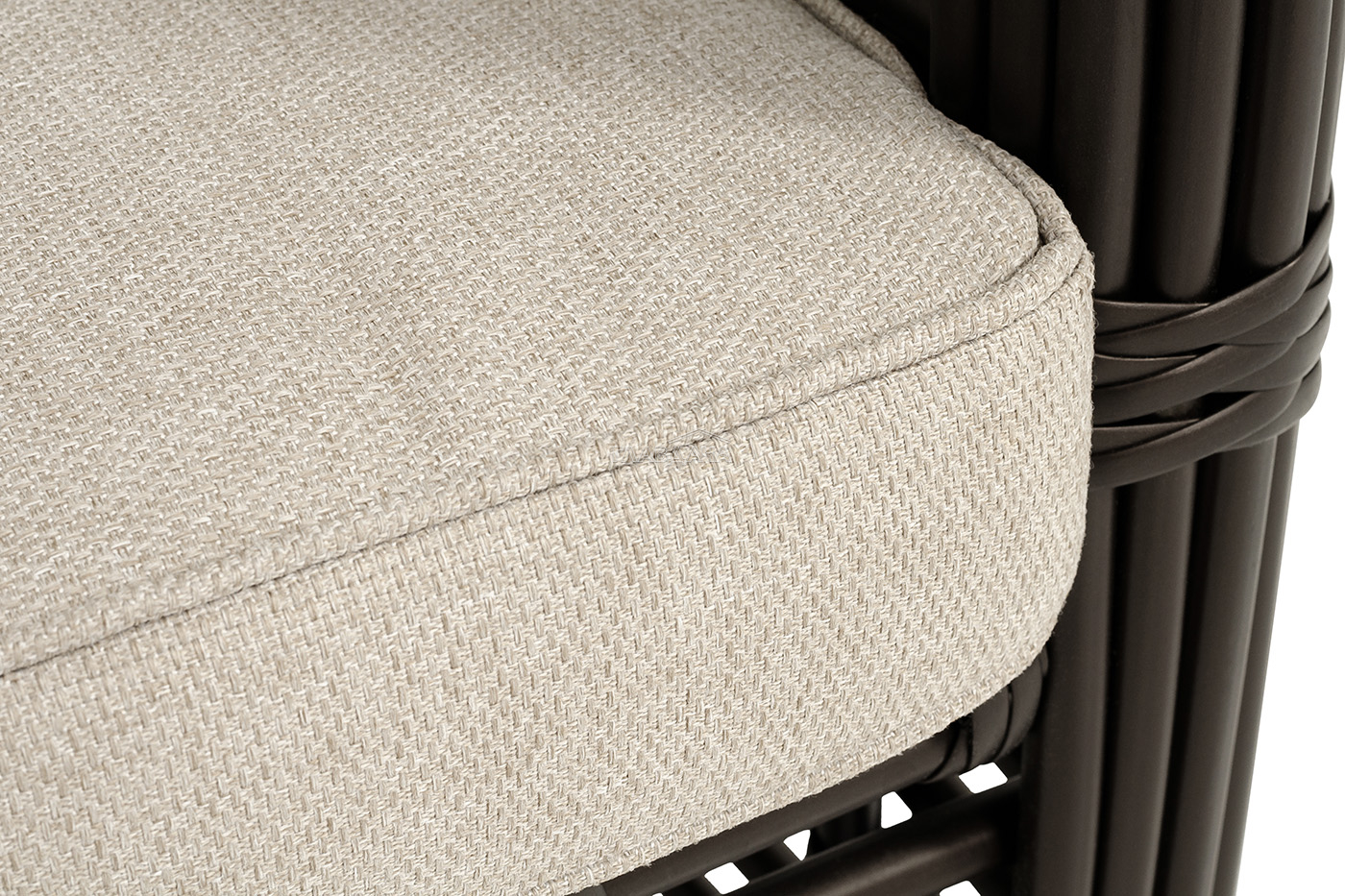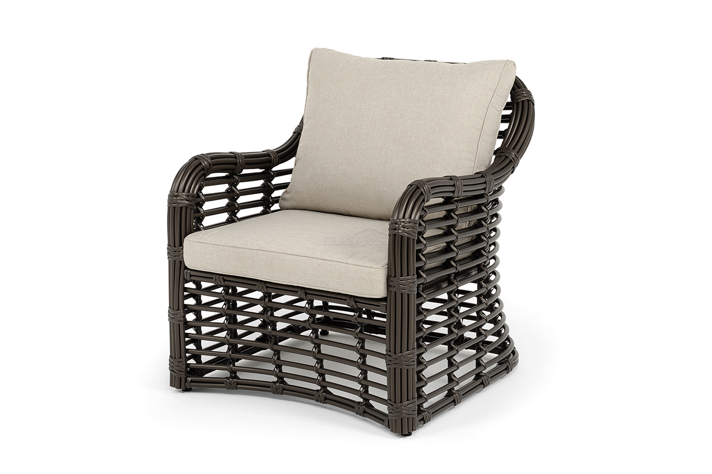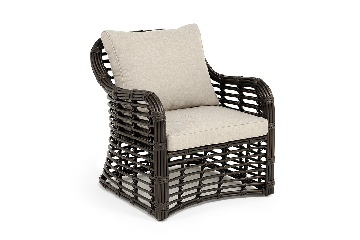 Каркас мебели сделан из прочного алюминия с высокими эксплуатационными качествами. Оплетен вручную с помощью круглого искусственного ротанга. Представлено в бронзовом оттенке.