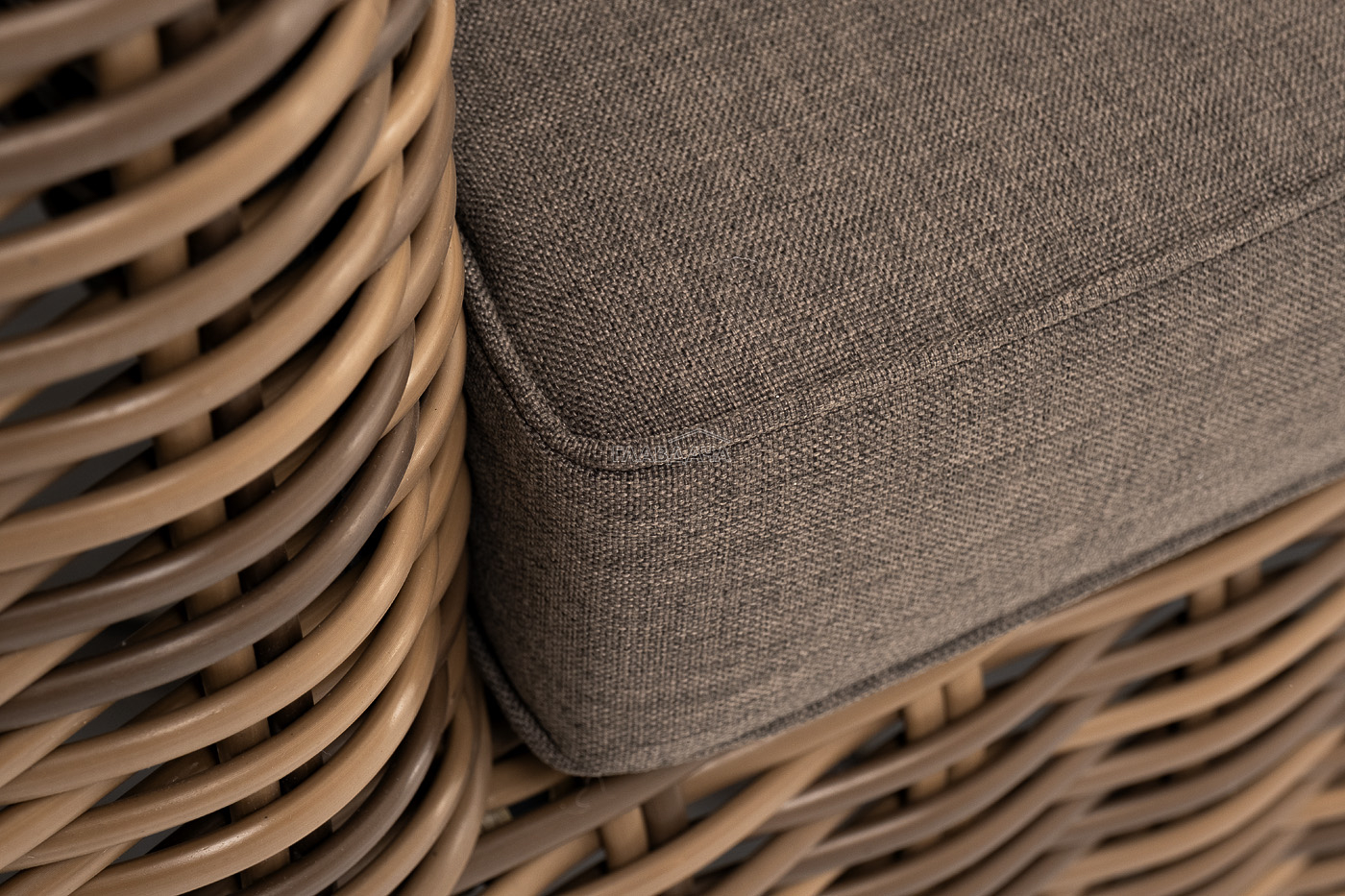 Кресло оснащено каркасом из прочного алюминия, ручное круглое плетение является основным декоративным элементом мебели. Оно выполнено из искусственного ротанга в соломенном цвете.