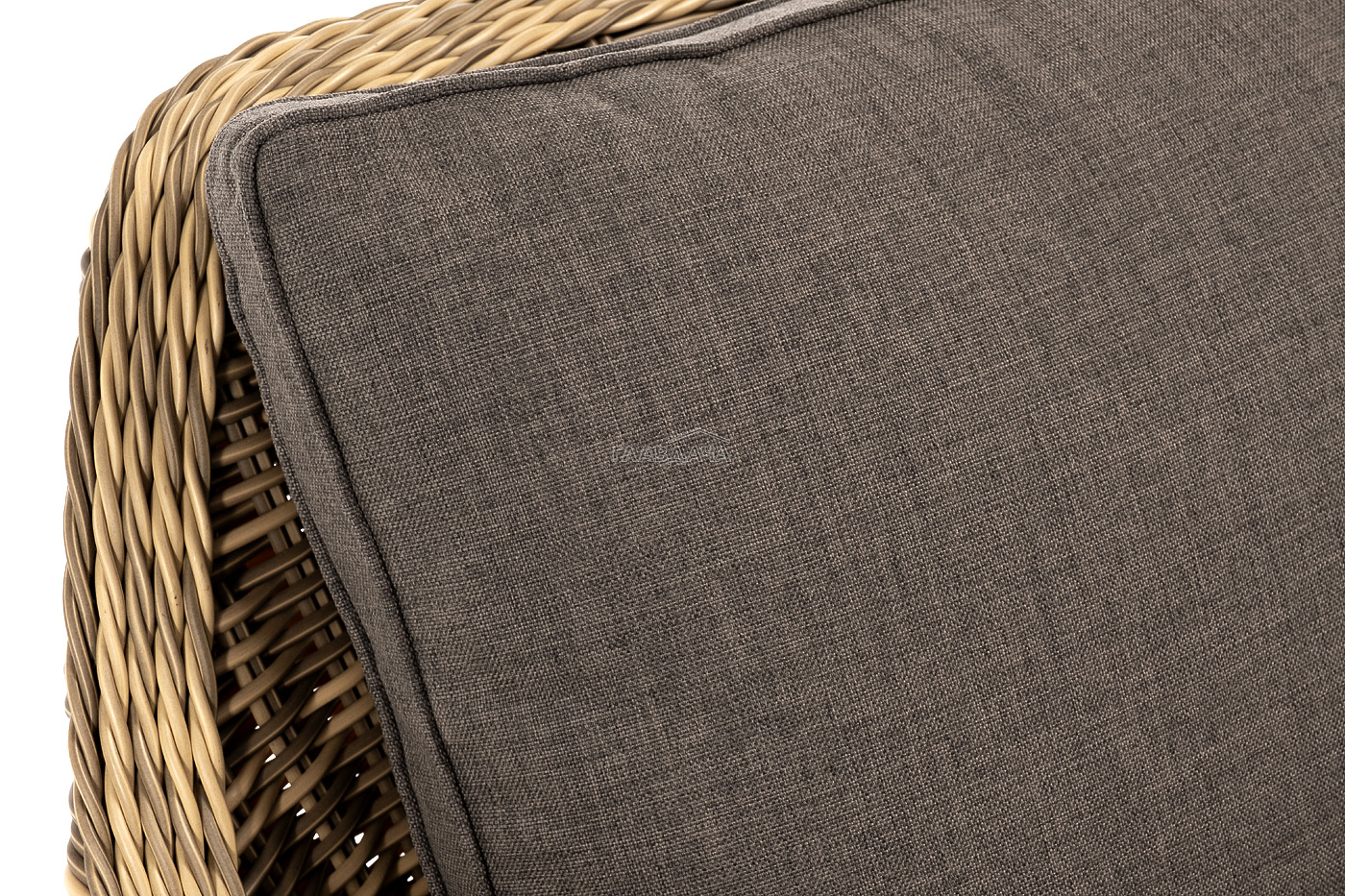 В комплекте с уличным ротанговым креслом идут мягкие подушки со съёмными чехлами серого оттенка. Они пошиты из полиэстера, который не боится повышенной влажности благодаря наличию влагоотталкивающей пропитки. Плотность ткани составляет 300гр/м2.