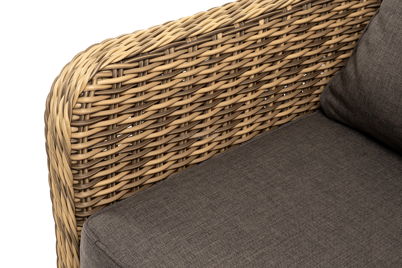 Надежность и износостойкость мебели гарантирует каркас, который сделан из качественного алюминия. Ее дополняет ручное плетение, при изготовлении которого используется искусственный ротанг. Представлена модель в соломенном цвете.