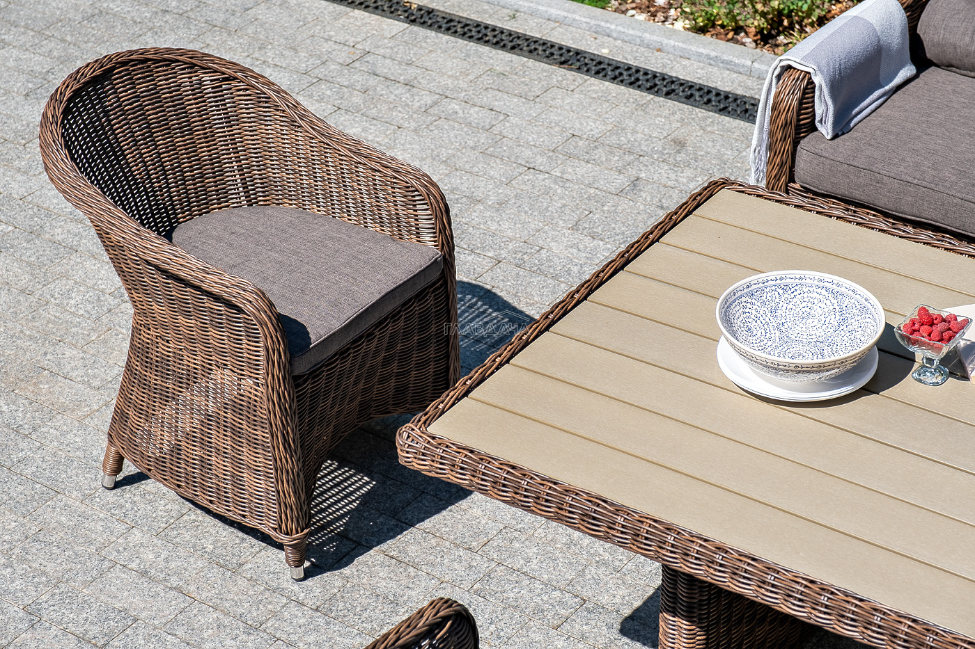 Кресло изготовлено посредством ручного плетения из искусственного ротанга коричневого цвета. Для укрепления конструкции использован алюминиевый каркас. Благодаря ему плетеное кресло остается легким, но прочным.