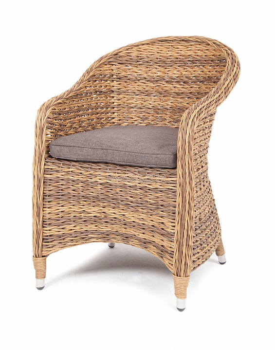 Кресло изготовлено посредством ручного плетения соломенного цвета. Для укрепления конструкции использован алюминиевый каркас. Благодаря ему плетеное кресло остается легким, но прочным.