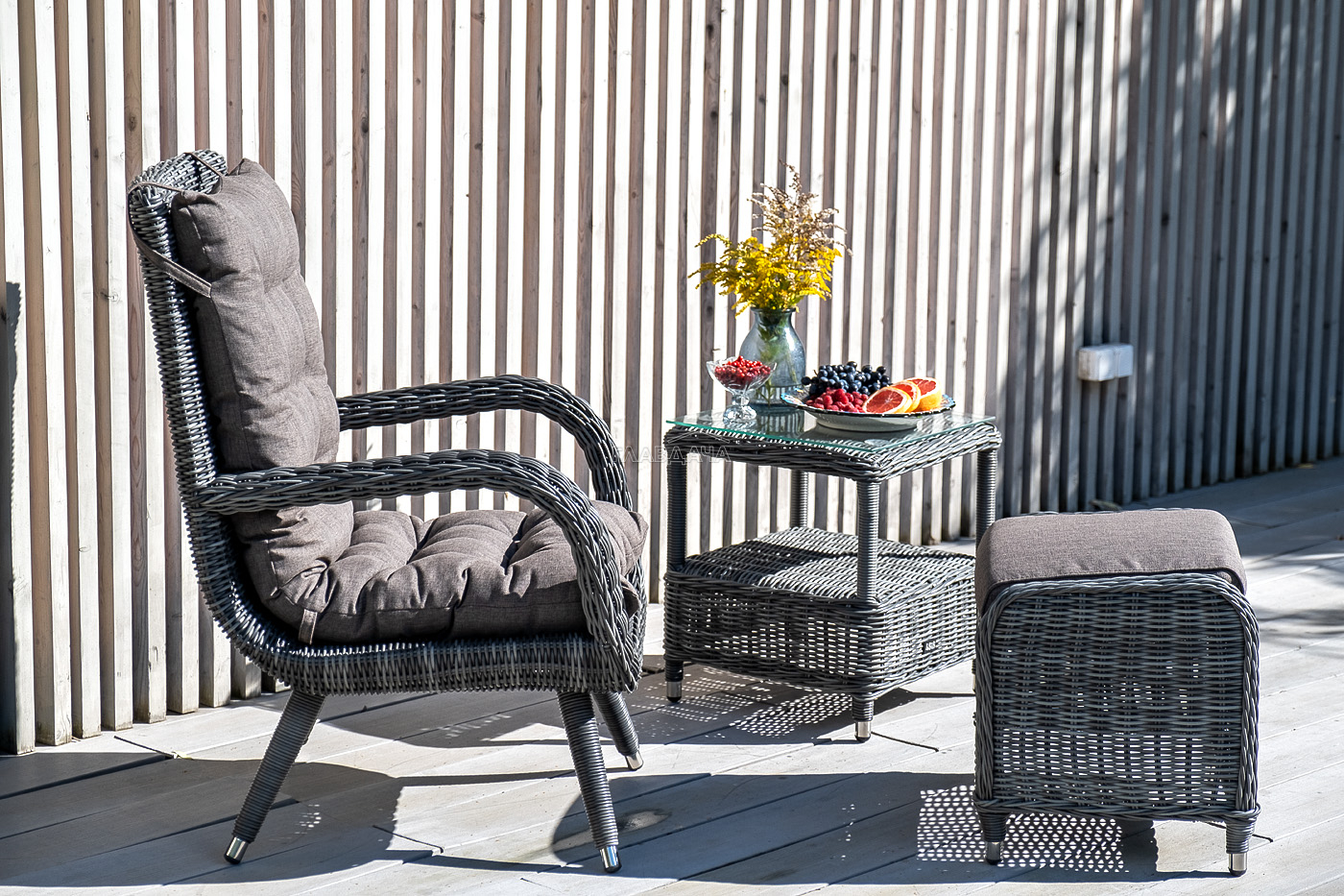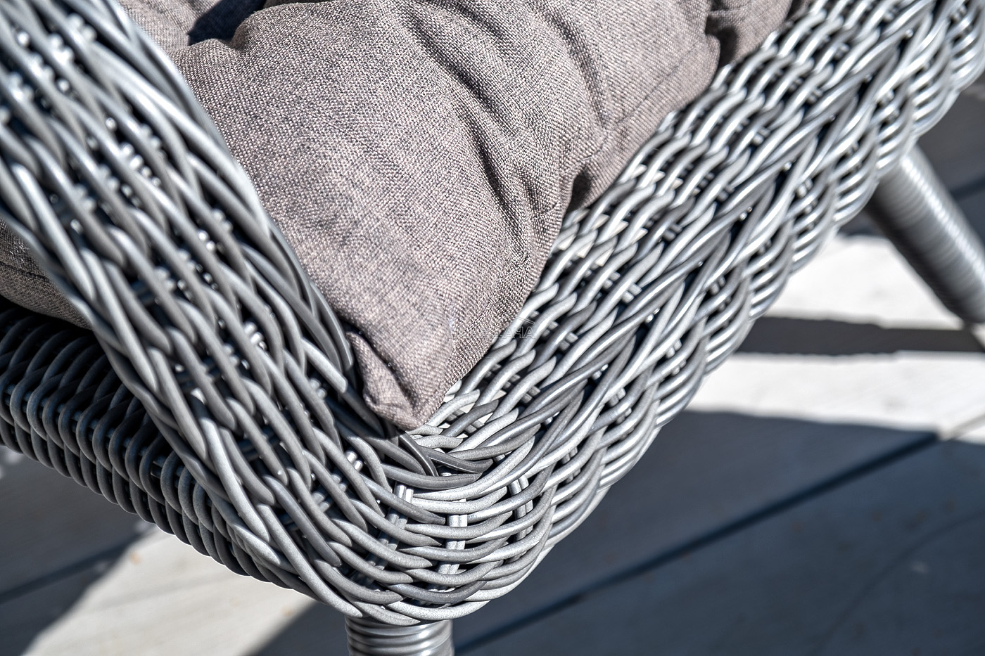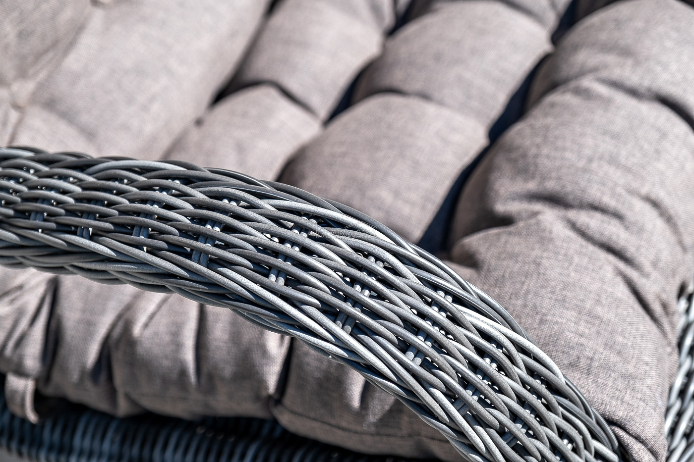 Размер модели – 690×810×990 мм. При изготовлении ее каркаса используется прочный алюминий с высокой износостойкостью. Имеет ручное плетение, которое выполнено из искусственного ротанга в цвете графит.