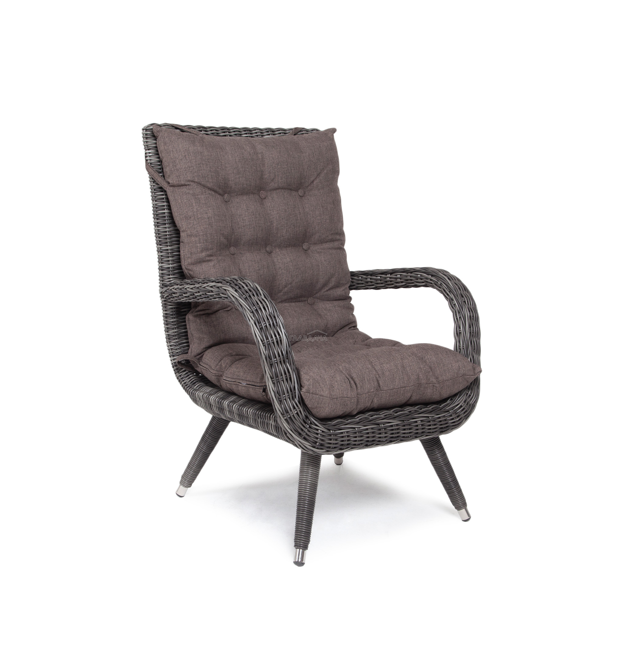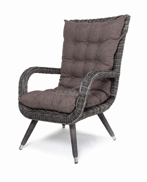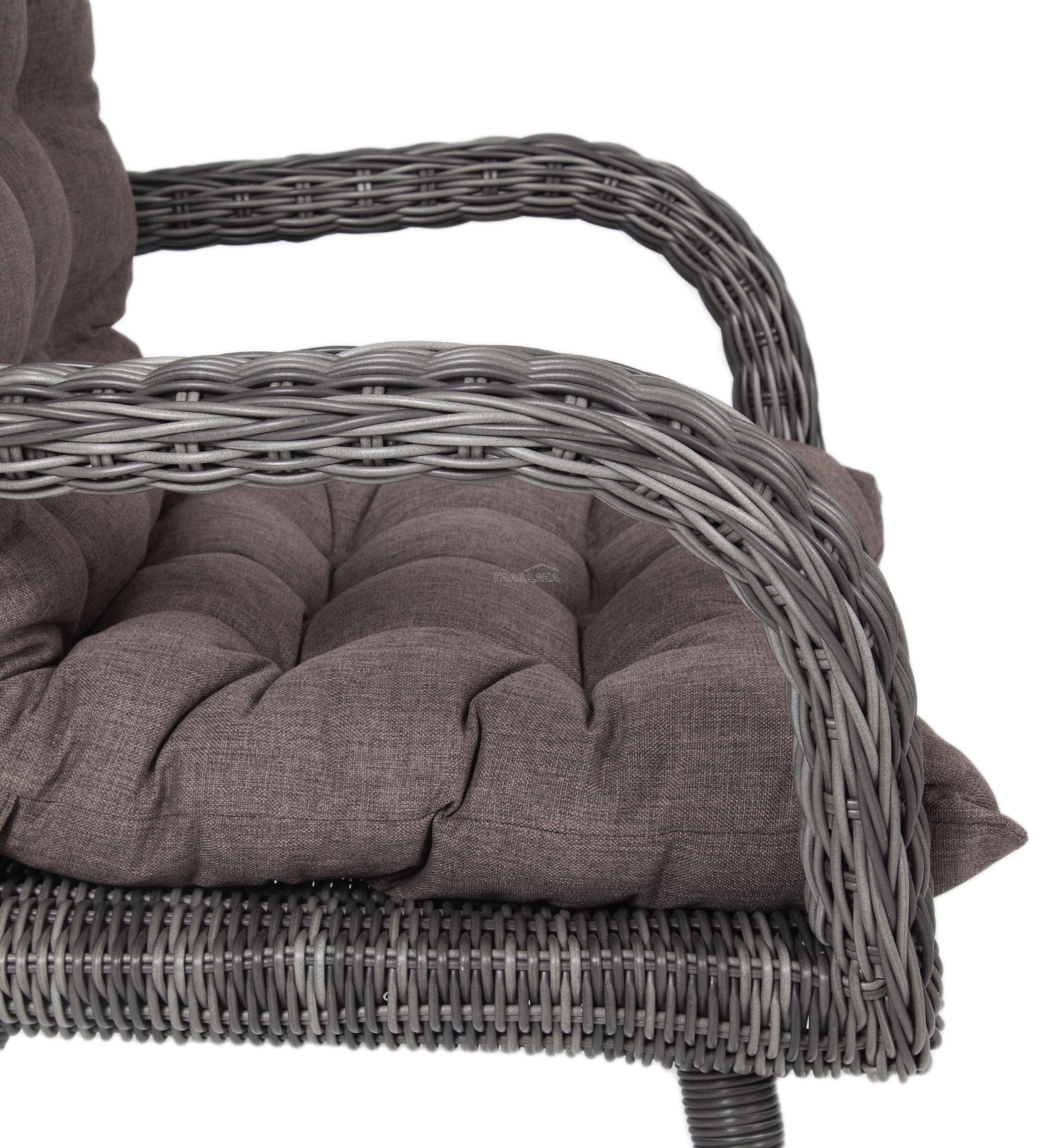 Садовое кресло дополнено мягкими подушками для комфортного размещения. Они выполнены в сером цвете. При их пошиве используется полиэстер с плотностью 300гр/м2. Влагоотталкивающая пропитка усиливает защитные свойства материала.