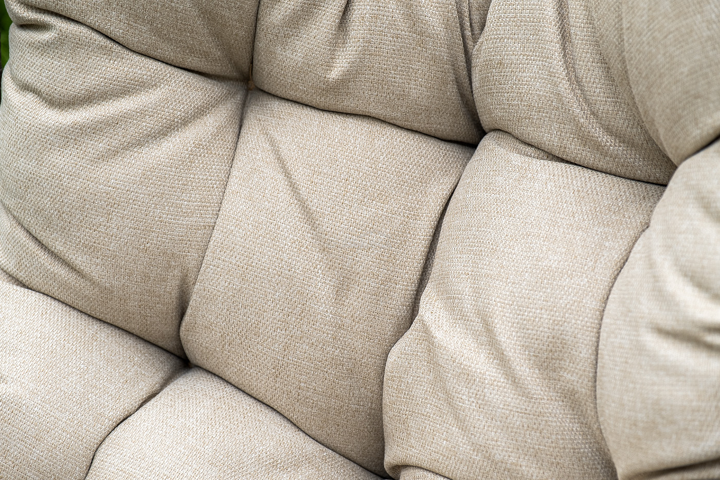 Для удобства сидения на кресле предусмотрена удлиненная подушка бежевого цвета из полиэстера с влагоотталкивающей пропиткой. Чехол – съёмный, допускается стирать в стиральной машине с использованием порошка.